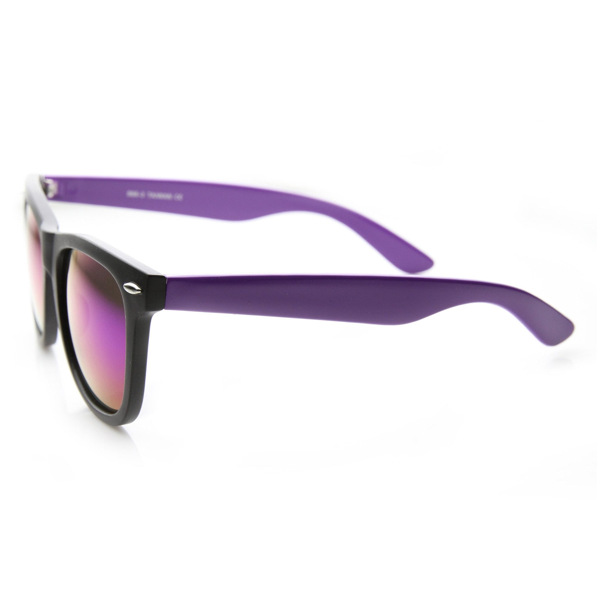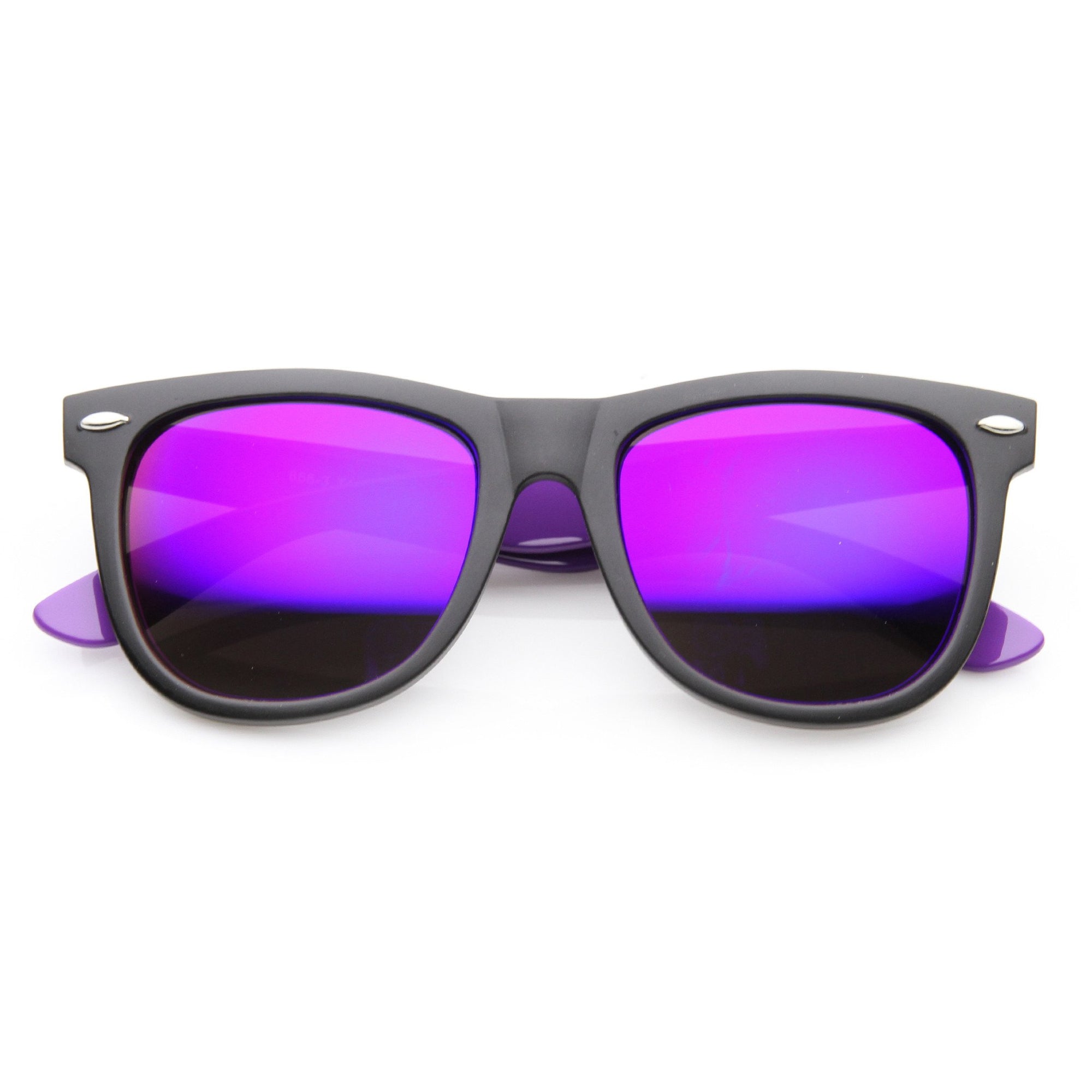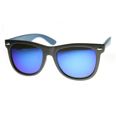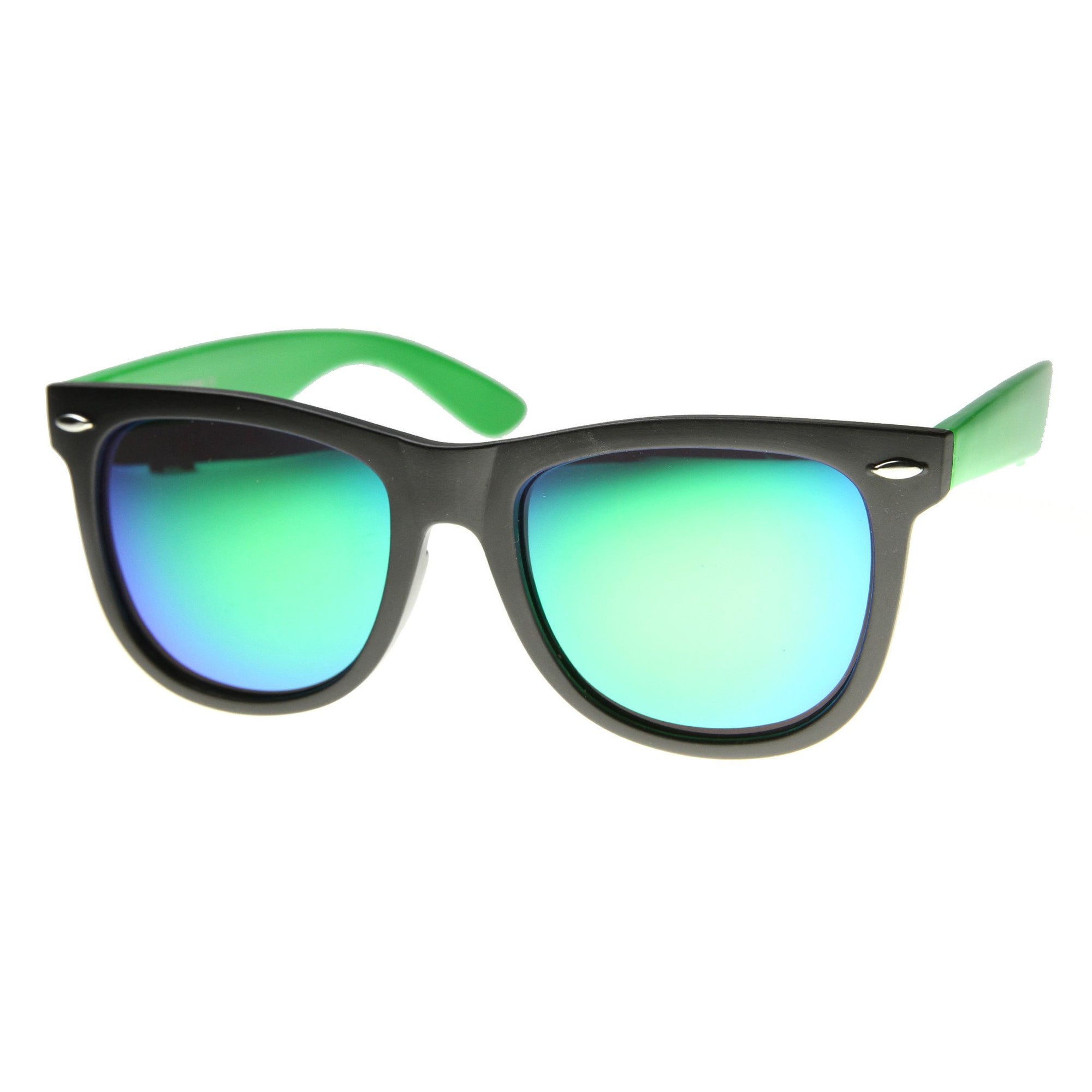 Proteja sus ojos con estilo con estas gafas de sol con montura en forma de cuerno de dos tonos que cuentan con un marco negro mate con combinaciones de colores y lentes espejadas de colores llamativos. Disponible en una variedad de colores divertidos para elegir que funcionan muy bien para cualquier ocasión. Fabricado con un marco de plástico, bisagras de metal y lentes con protección UV400.