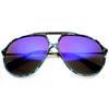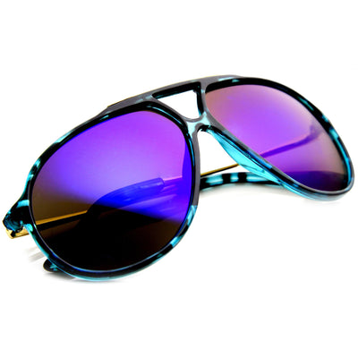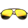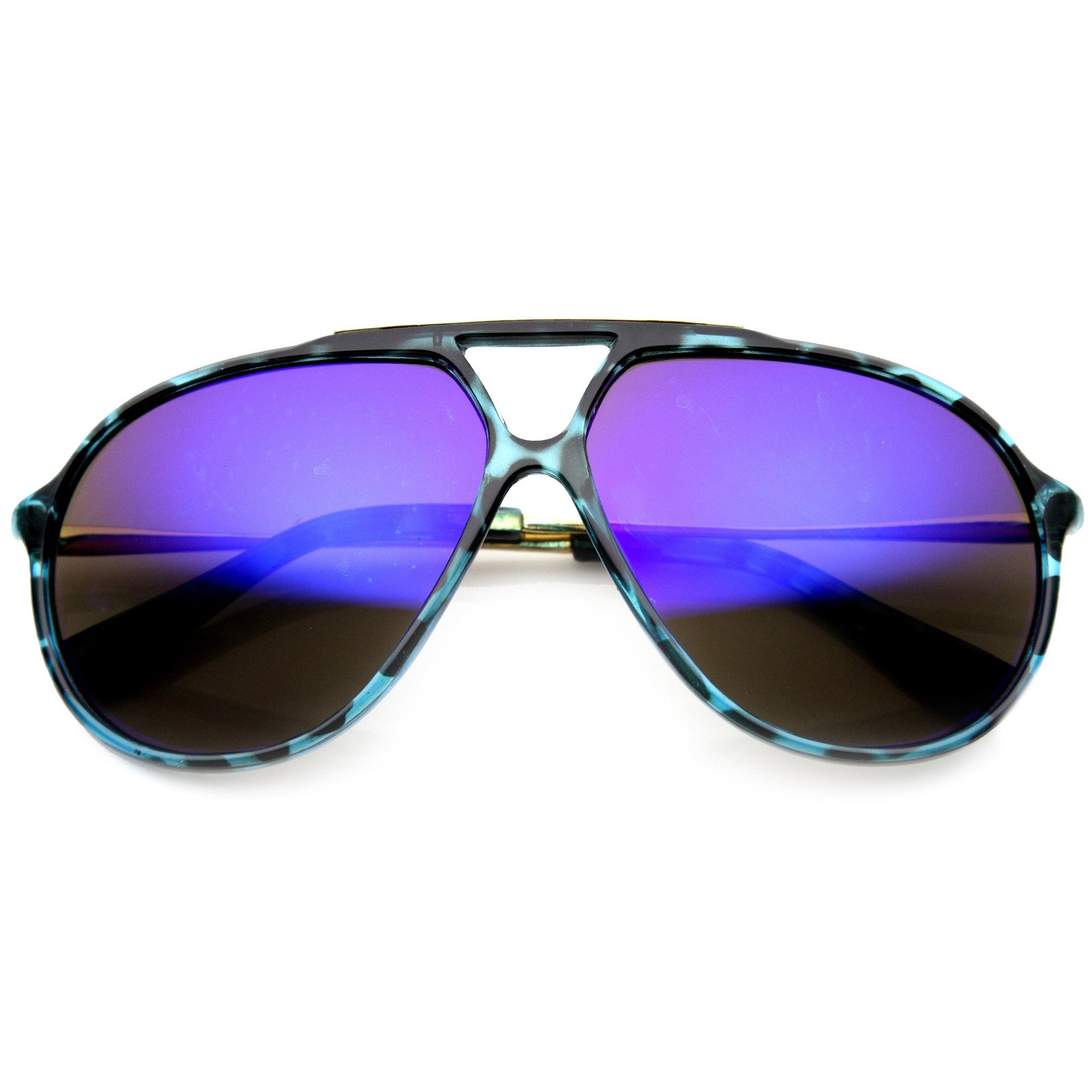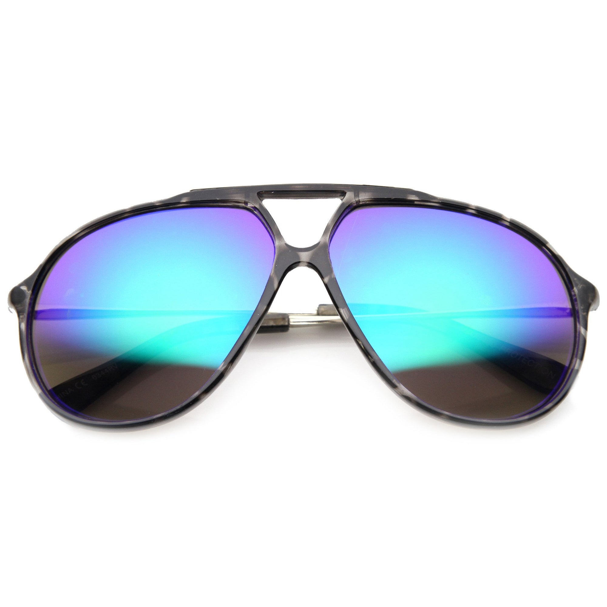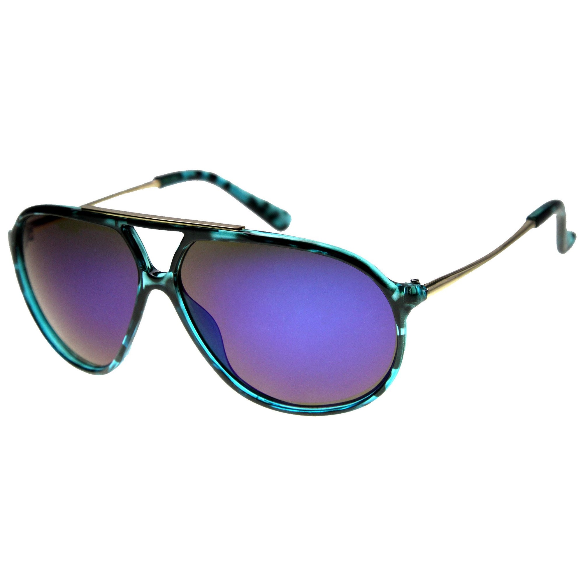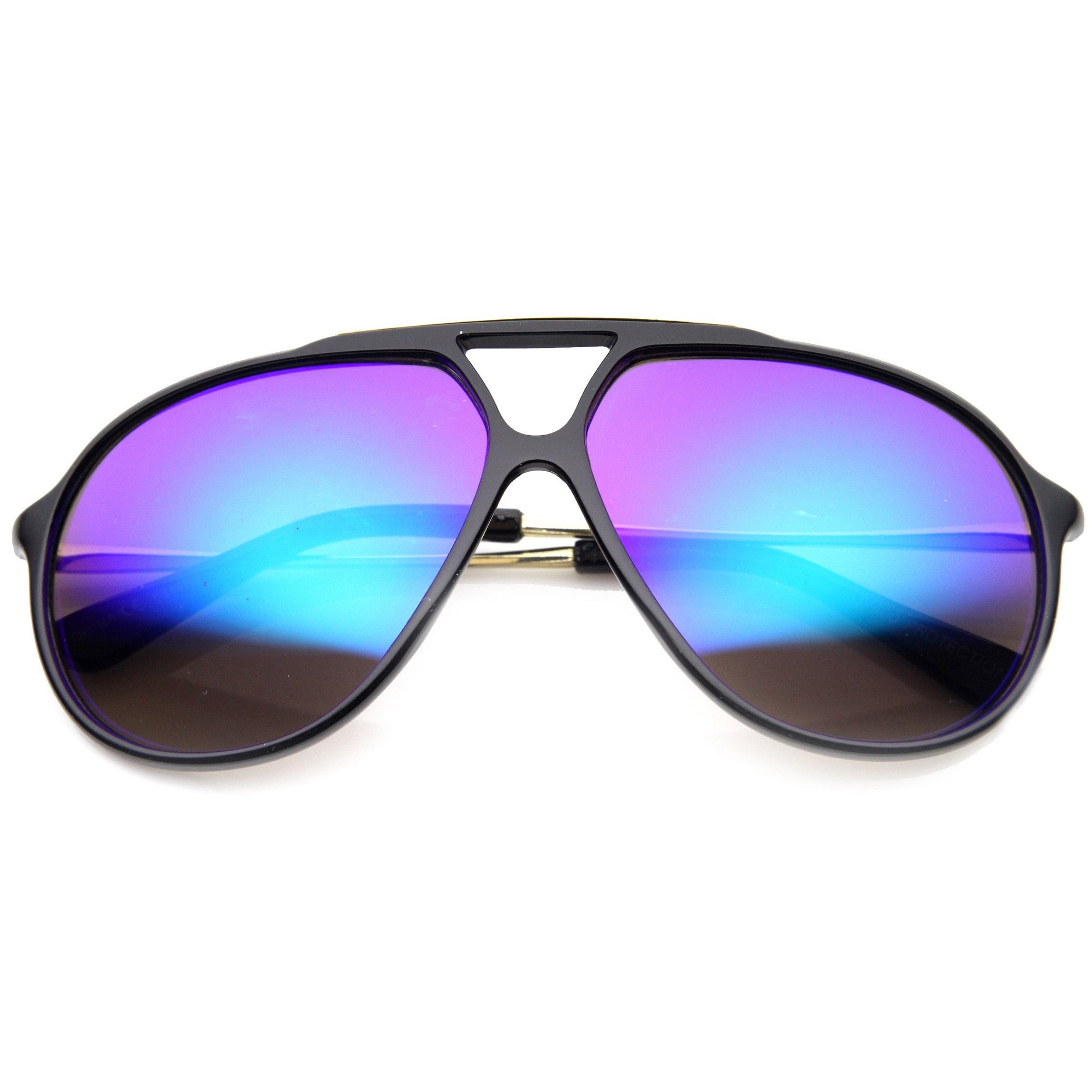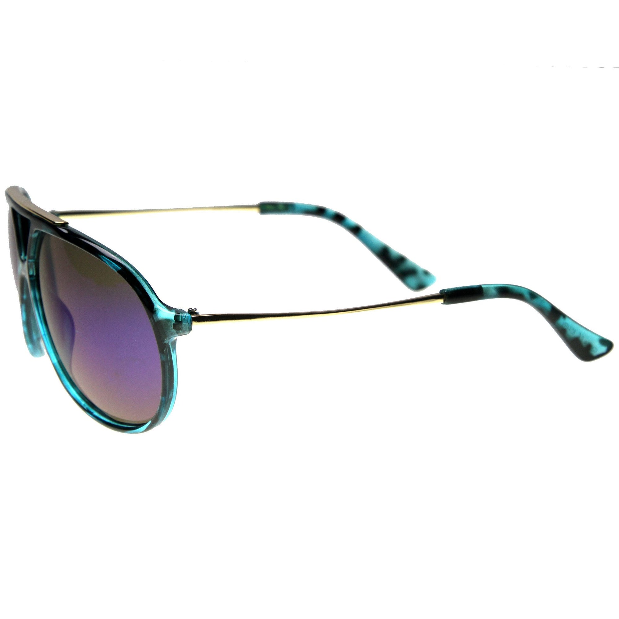 Gafas de sol de aviador con forma de lágrima y lentes espejadas con flash. El estilo es verdaderamente único con un prominente puente de soporte de plástico deportivo. Disponible en varias formas de color. El marco está fabricado con una cara frontal de plástico de calidad y cuenta con un brazo de metal. Cuenta con bisagras de metal, plástico moldeado para la nariz cómoda y lentes con protección UV400 de color oscuro. zeroUV(r) es una marca registrada.
