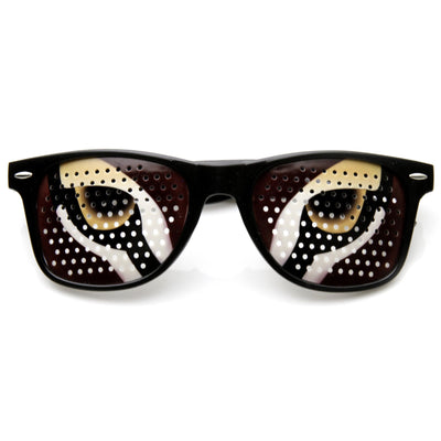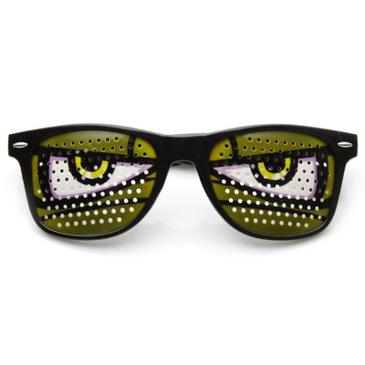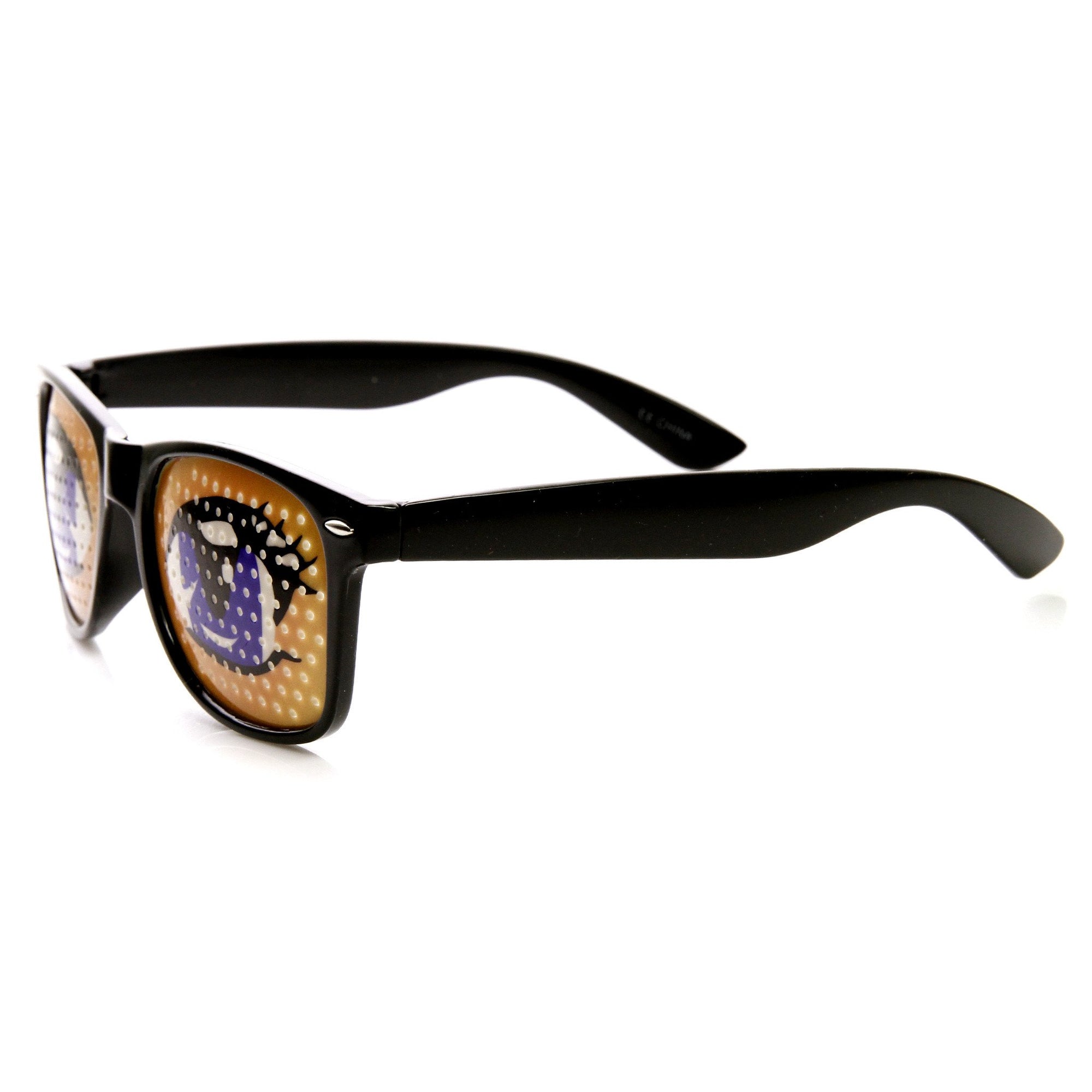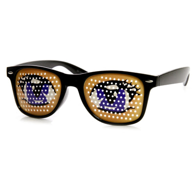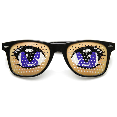 Divertida y colorida montura clásica con borde de cuerno que presenta una variación de ojos tontos impresos en una lente de malla de plástico. ¡Ideal para cubrir tu cara de póquer, accesorio de disfraz o llamar la atención en fiestas! Tenga en cuenta que estos anteojos son difíciles de ver, NO ofrecen protección UV y están diseñados únicamente para apariencia y uso novedoso. Fabricado con marco de plástico, bisagras de metal y lente de malla de plástico.