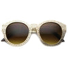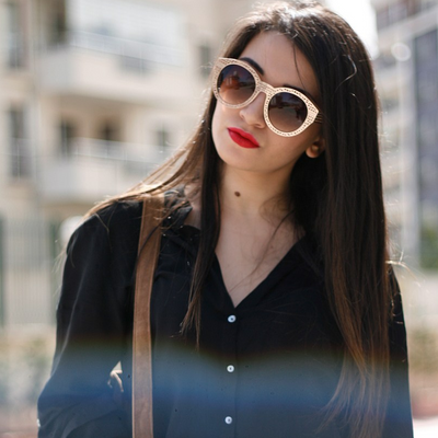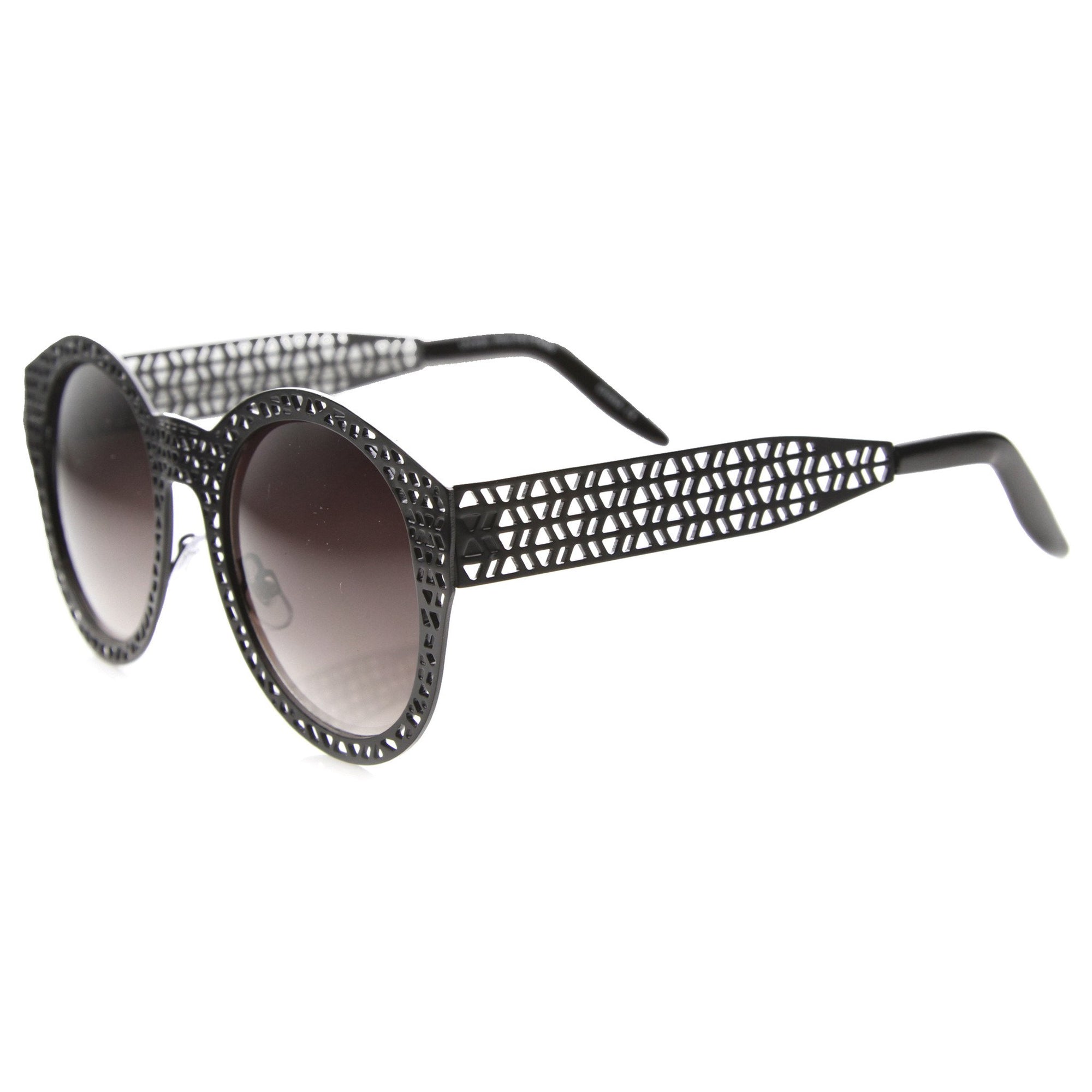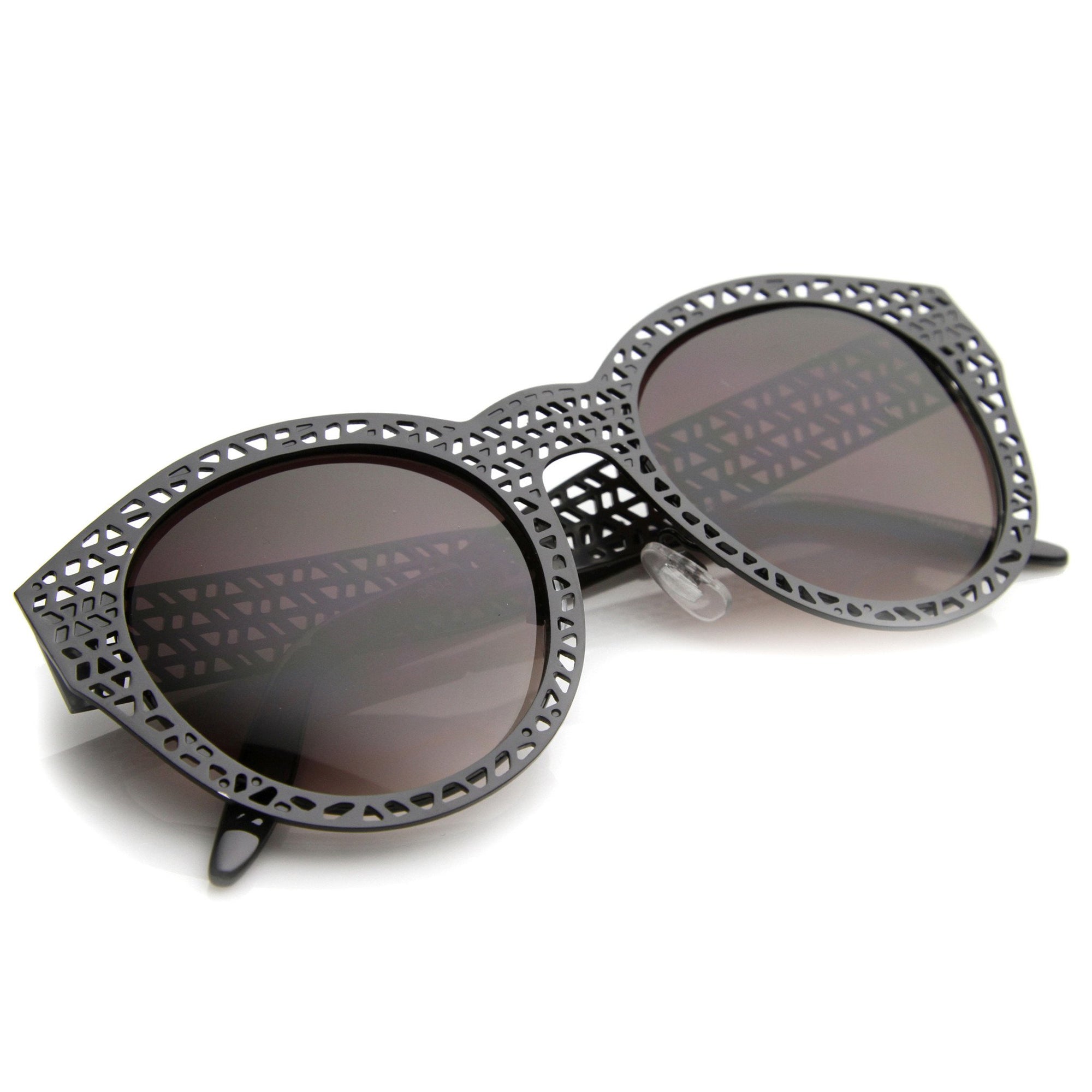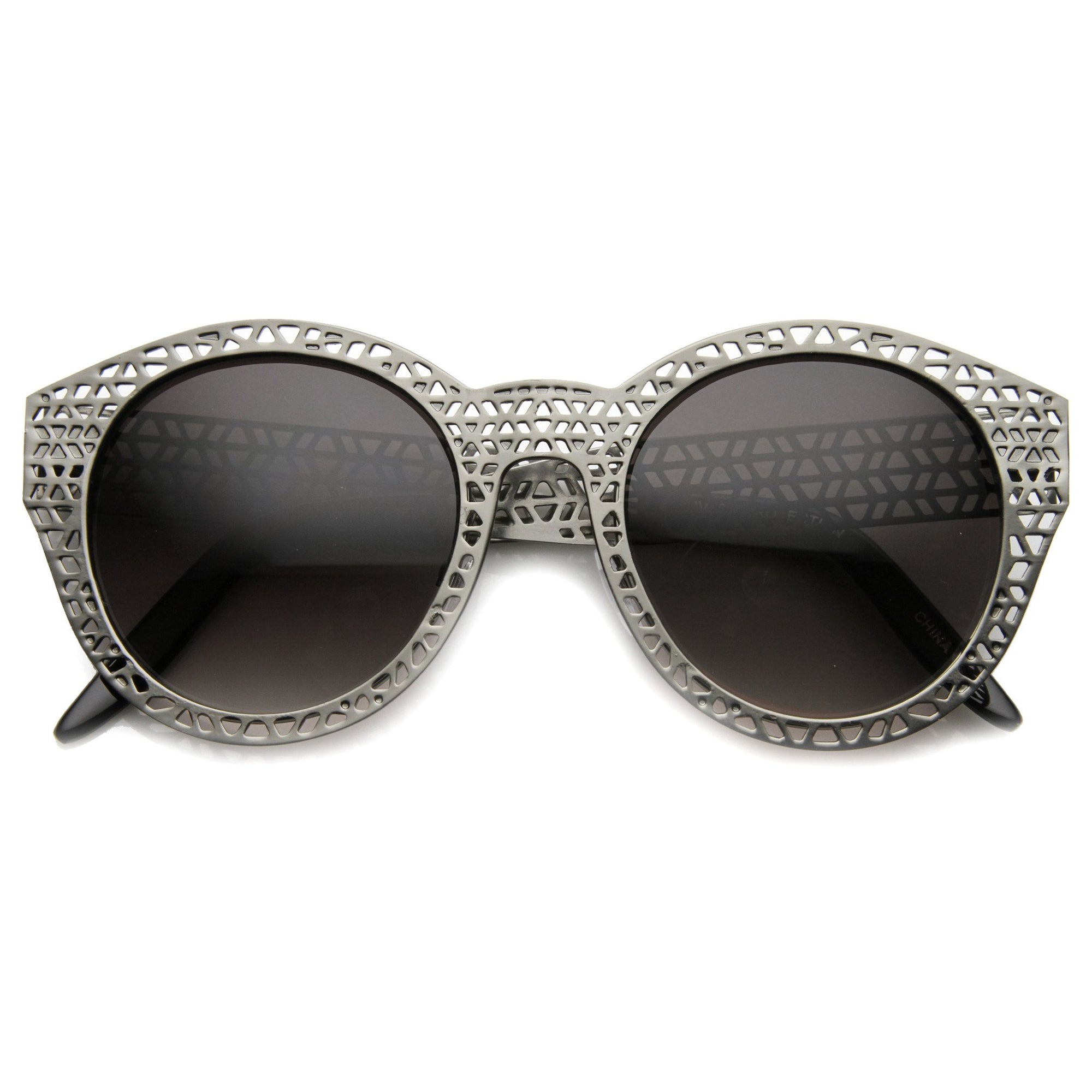 Marco de malla de ojo de gato de metal maravillosamente diseñado, con distintos detalles de patrón de celosía. Definitivamente un marco único. Cuenta con bisagras de metal, piezas nasales de estilo inglés y lentes con protección UV400 de color oscuro.
