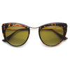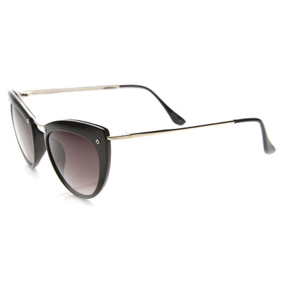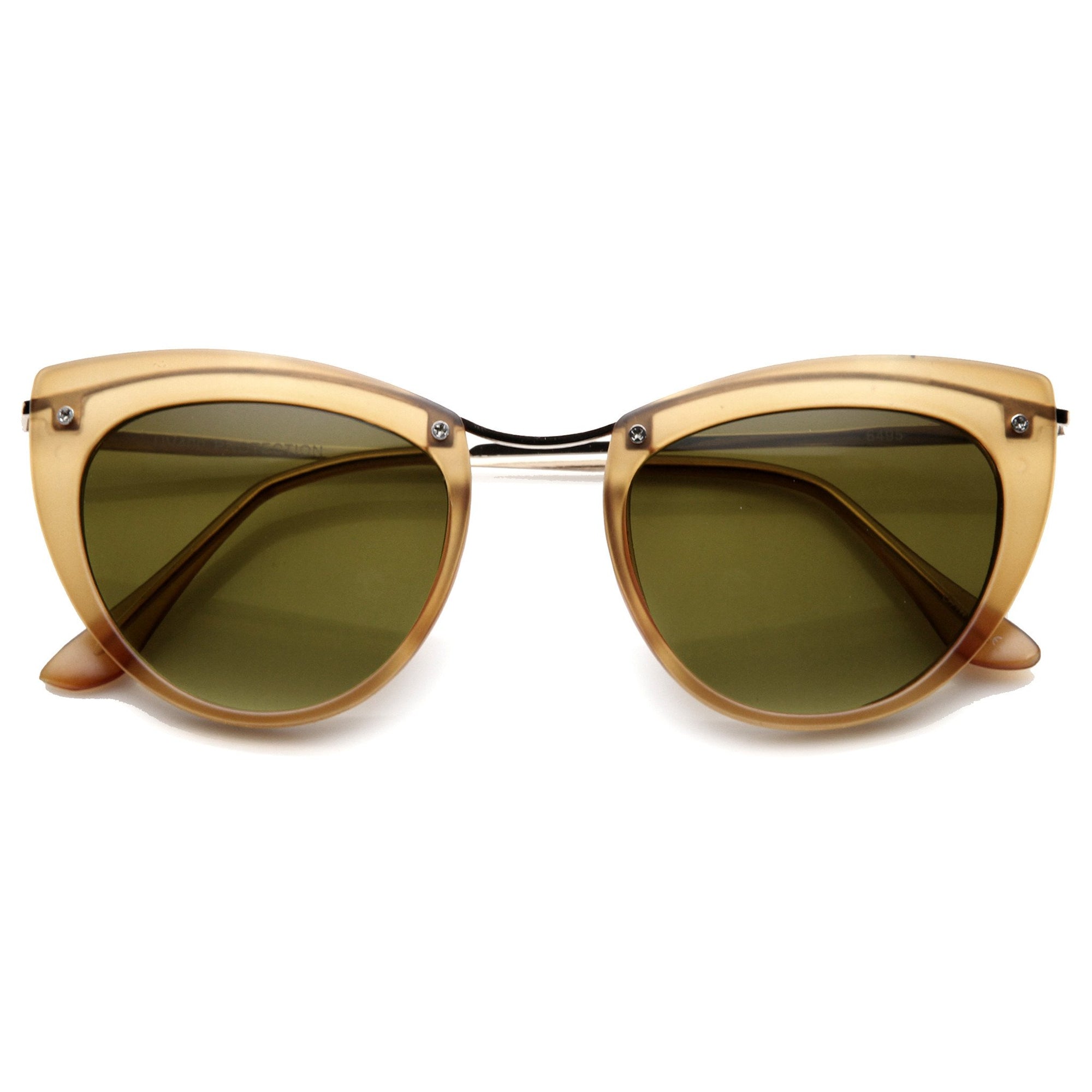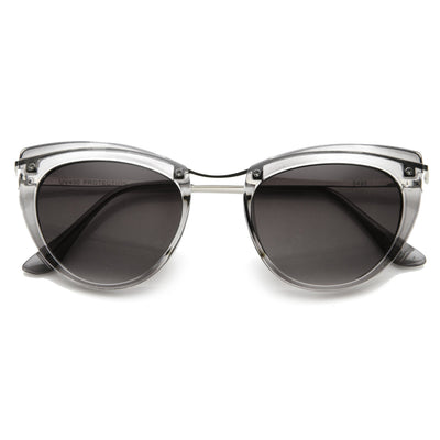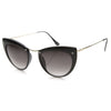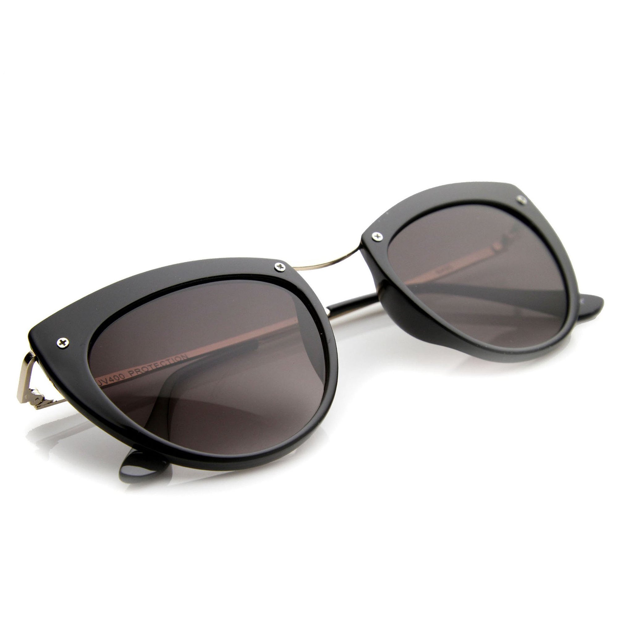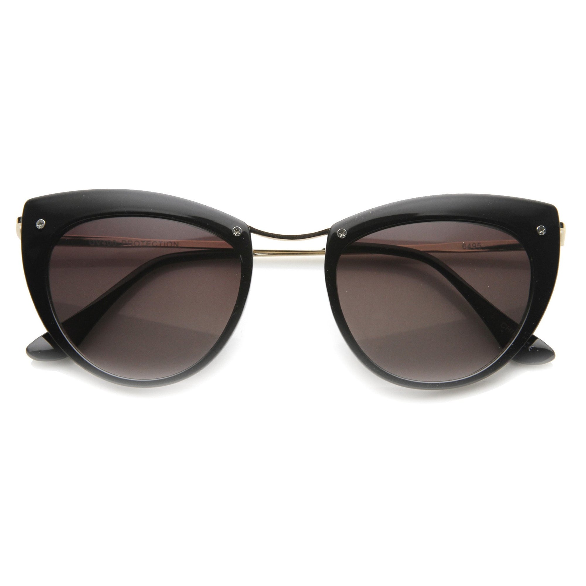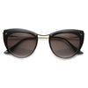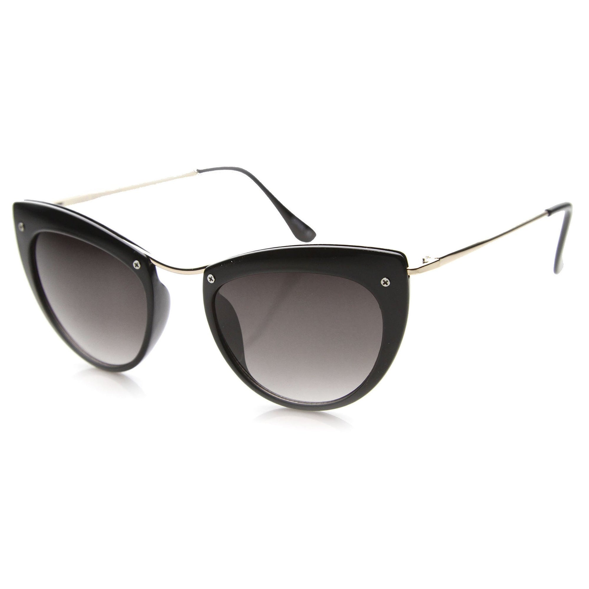Montura de tamaño mediano con silueta de ojo de gato que cuenta con tornillos expuestos en la parte superior de la montura y elegantes patillas metálicas altas. ¡Una montura tipo ojo de gato muy elegante que le da un aspecto de alta costura esta temporada! Fabricadas con una montura a base de acetato, bisagras metálicas y lentes degradadas con protección UV400.