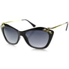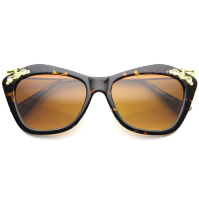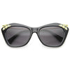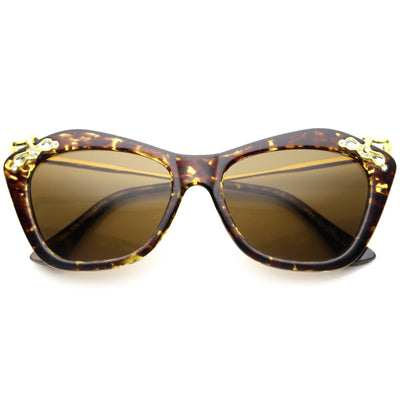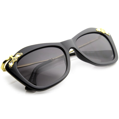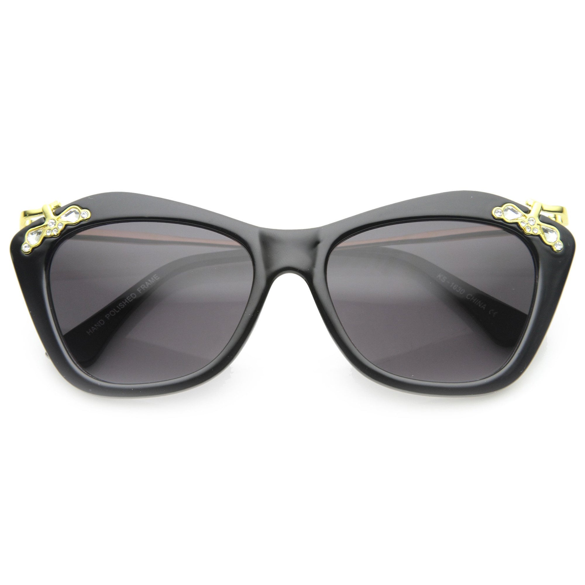 Elegantes gafas de sol tipo ojo de gato en ángulo para mujer. Las patillas delanteras están diseñadas con hermosos diseños de joyas. Fabricado con un marco de plástico, bisagras de metal y lentes de policarbonato con protección UV.