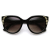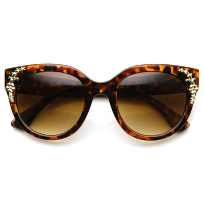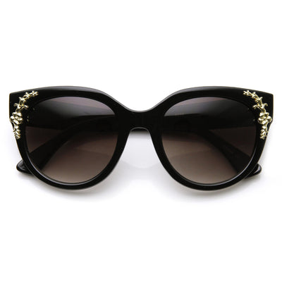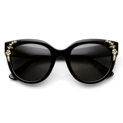 Silueta de ojo de gato de gran tamaño para mujer que presenta hermosos detalles florales que adornaban las sienes altas. Una elegante montura tipo ojo de gato de gran tamaño que aporta un toque de moda con clase a la colección de esta temporada. Fabricadas con una montura a base de plástico, bisagras de metal reforzado y lentes de policarbonato con protección UV400.