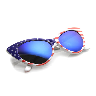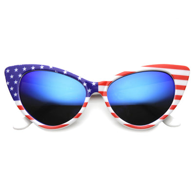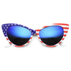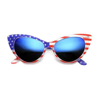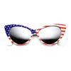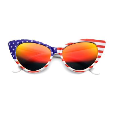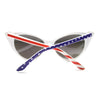 Muestre su patriotismo y apoyo a los EE. UU. con estilo con estas gafas de sol tipo ojo de gato, versión mod con la bandera estadounidense impresa, inspiradas en los años 50, con esquinas puntiagudas y lentes de colores llamativos. ¡Imprescindible para cualquiera que busque mostrar su patriotismo con un estilo de alta costura! Fabricado con una montura de plástico, bisagras de metal y lentes de policarbonato degradado con protección UV.