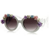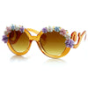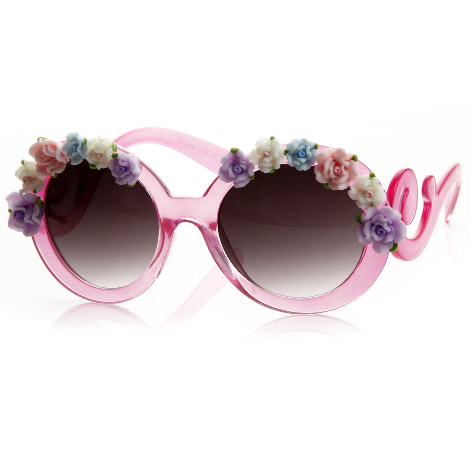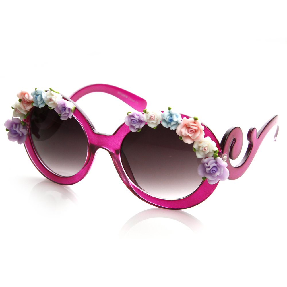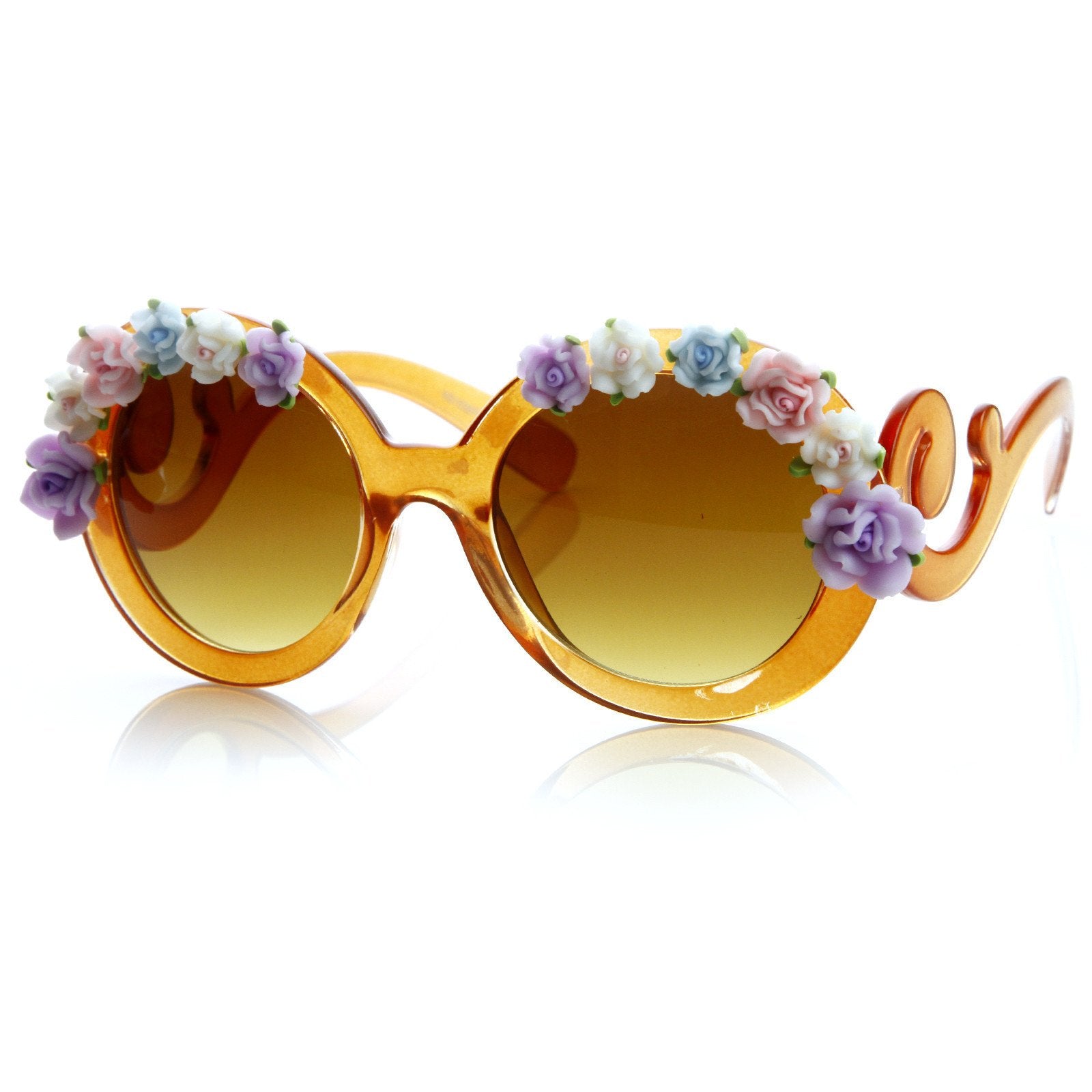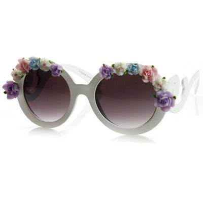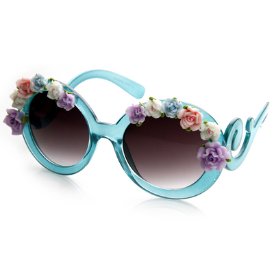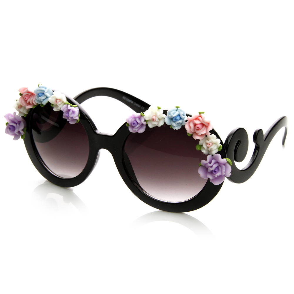 Women's oversize round silhouette frame with hand-painted ceramic adorned flowers and elegant inspired swirled arms. With all the lovely flowers and distinct high fashion details, these are sure to be a huge hit this season! Made from acetate based frame, metal hinges and gradient polycarbonate UV protected lenses.