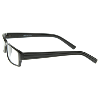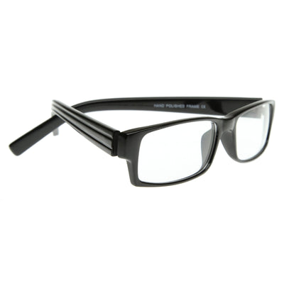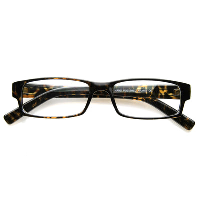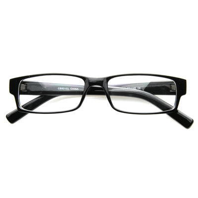 Modified rectangular clear lens glasses are one of the most popular reading frames we carry today. Designer inspired with a thin sleek sophisticated look, each pair provides a touch of class to any outfit. Made with an acetate based frame, metal hinges, and clear polycarbonate UV protected lenses.