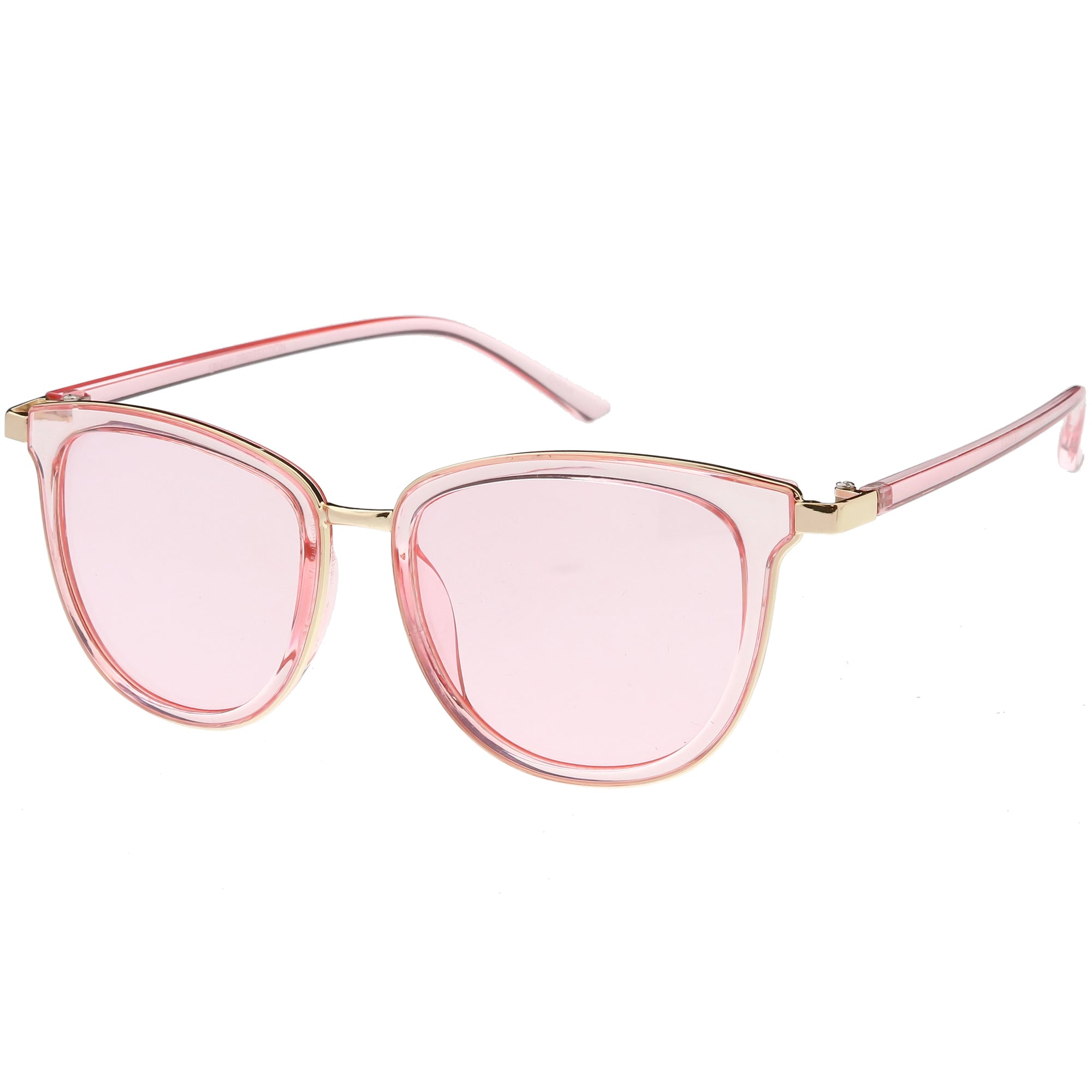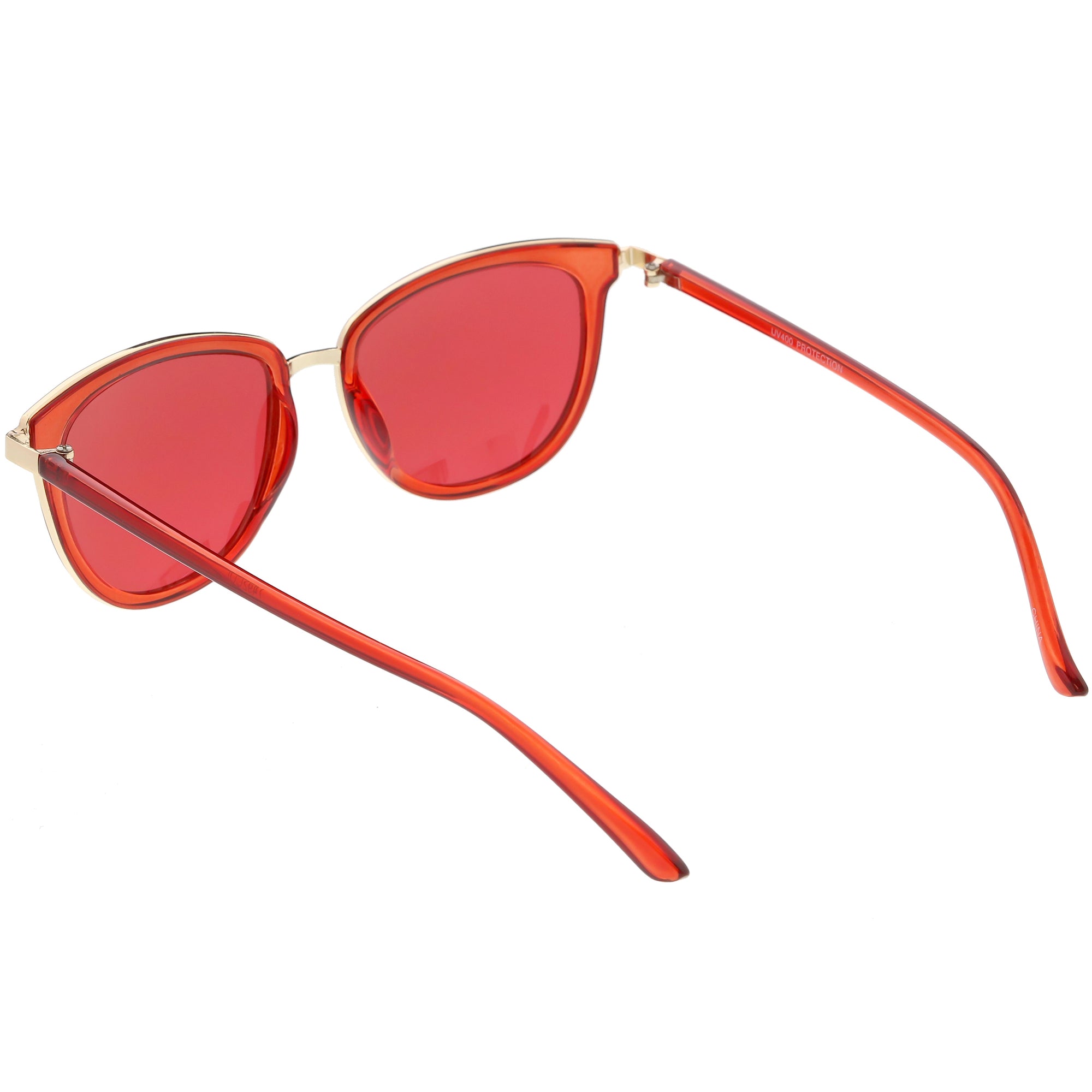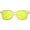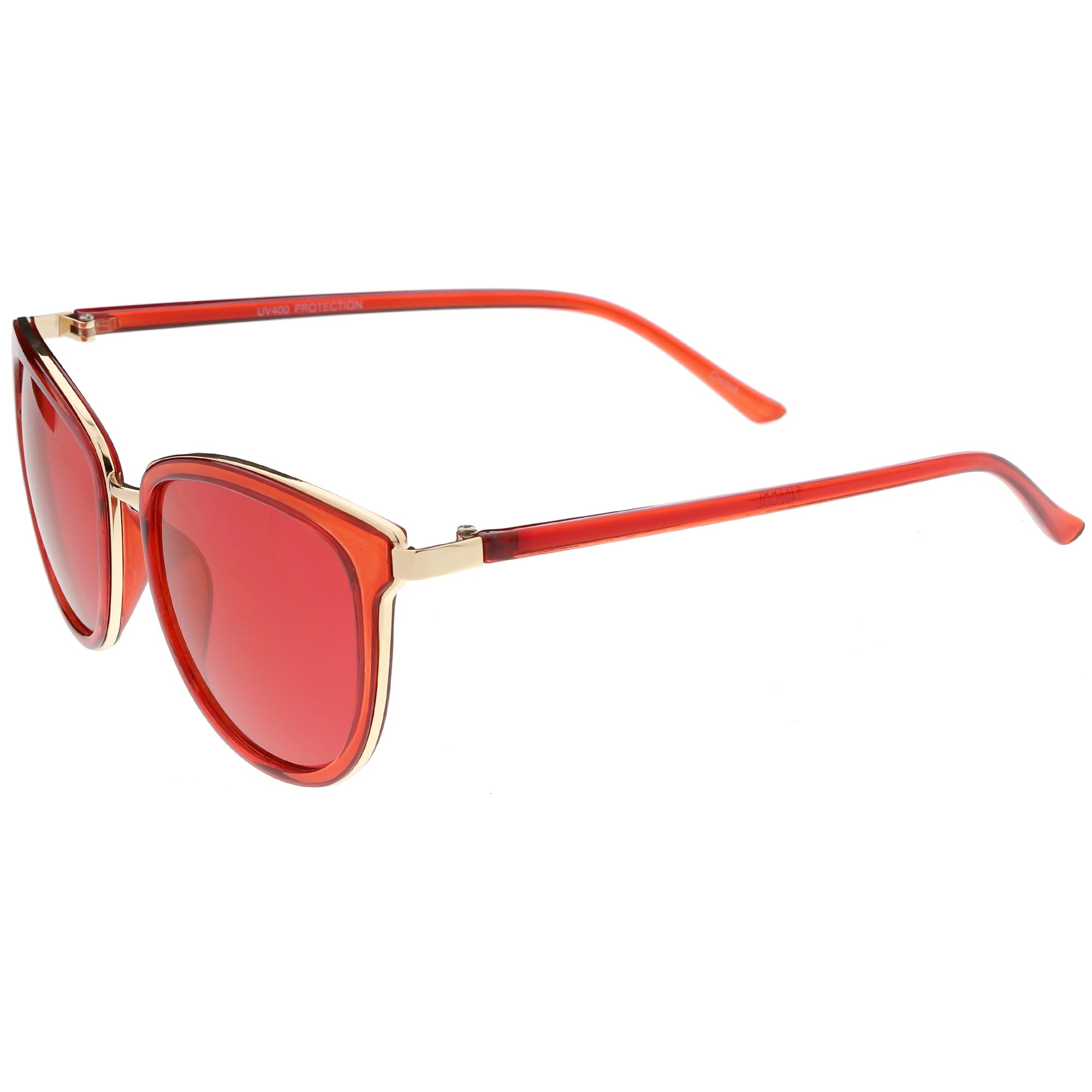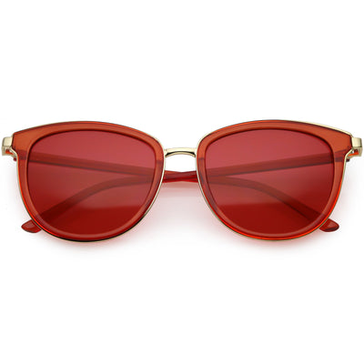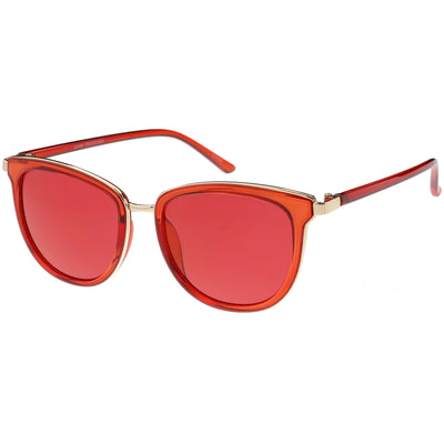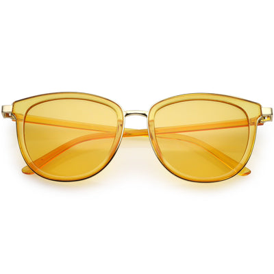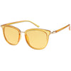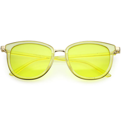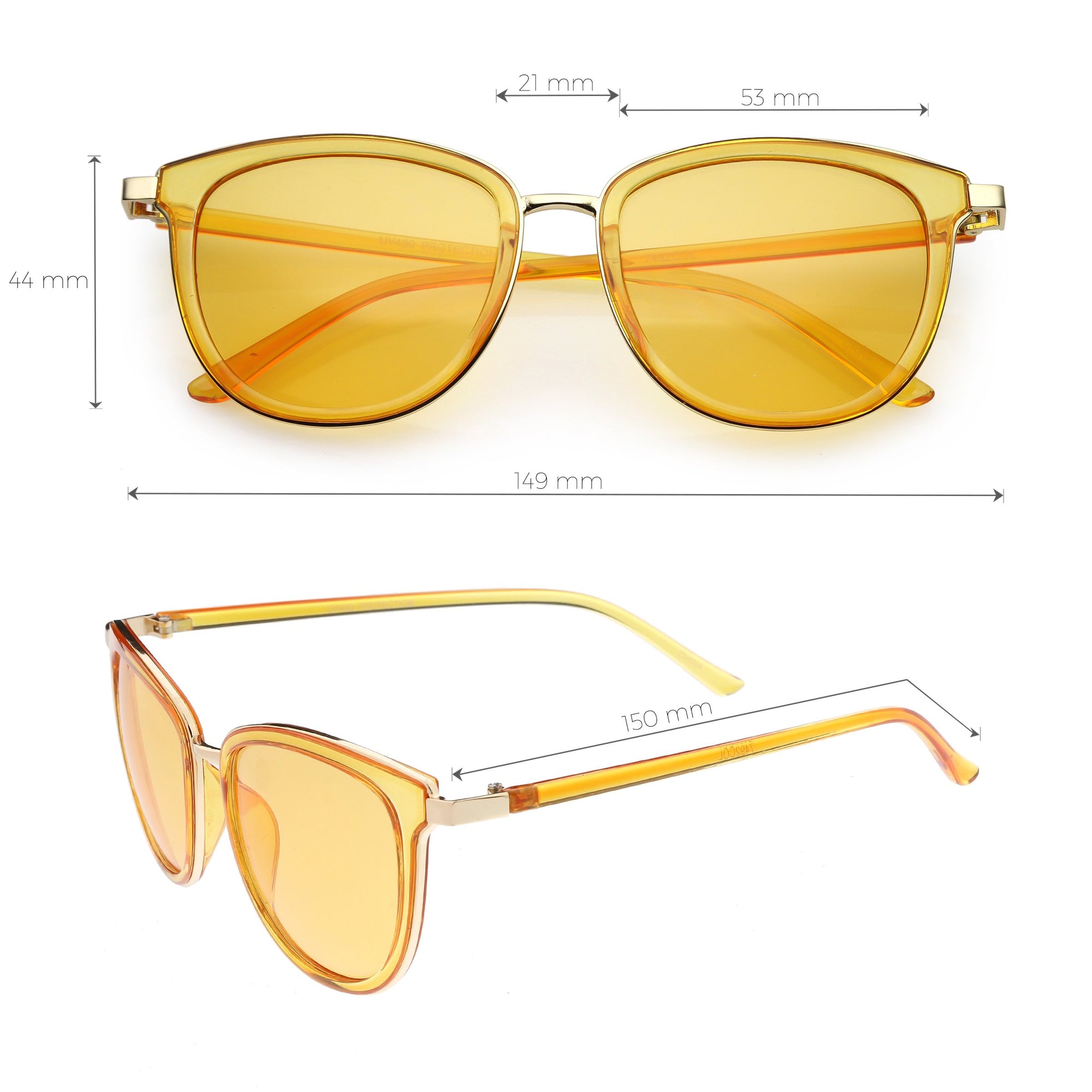 Embrace the warm weather seasons with these colorful horn rimmed sunglasses exquisitely designed with translucent frames with metal trim accents for added luxe. Color tinted square lenses add to this style's fun and playful appeal. Made with a plastic and metal based frame, metal hinges, and 100% UV protected lenses.