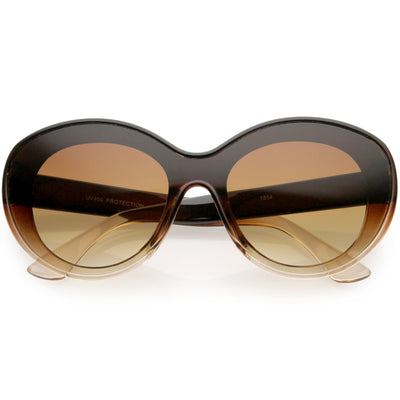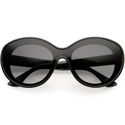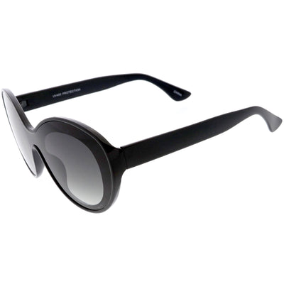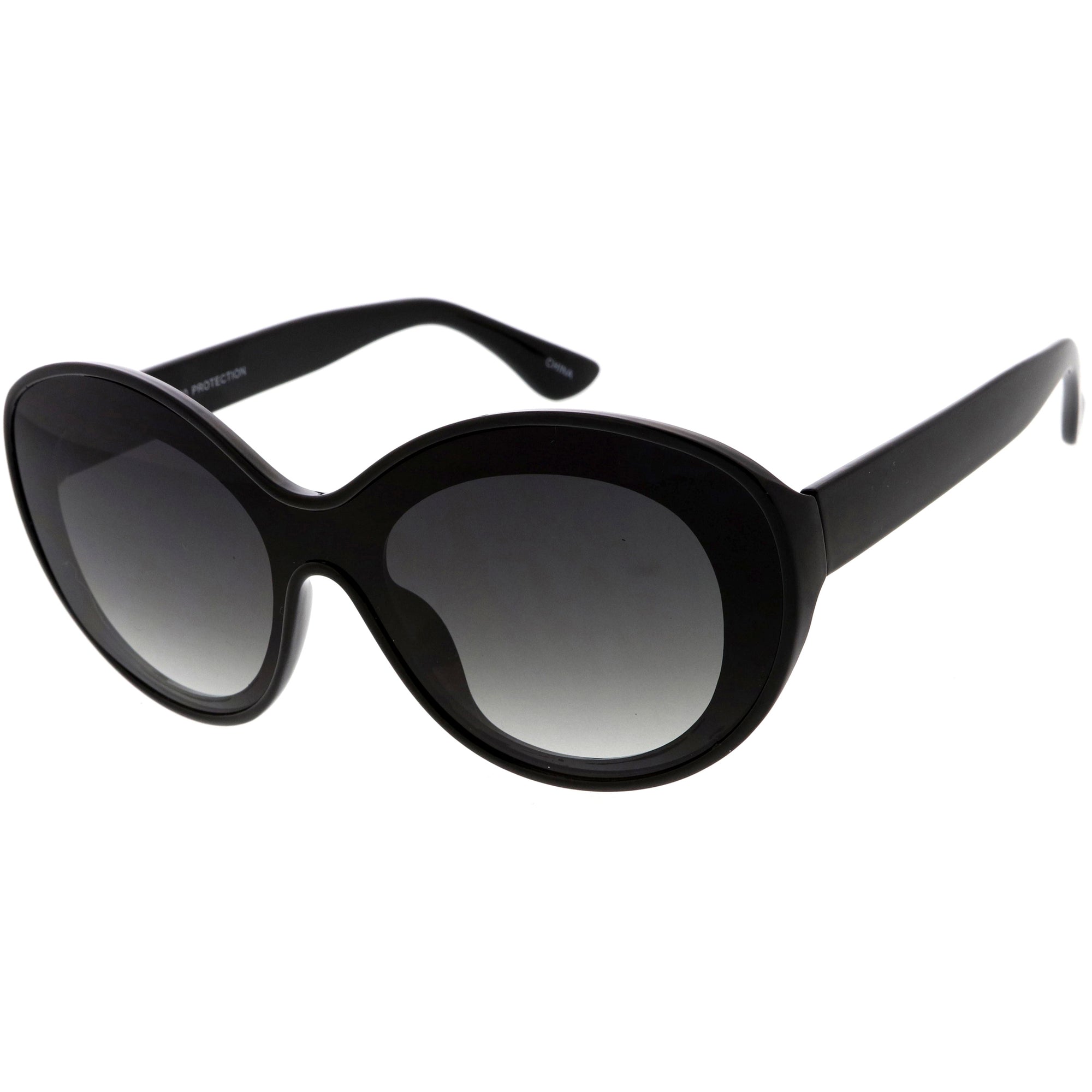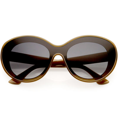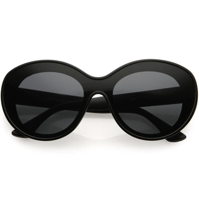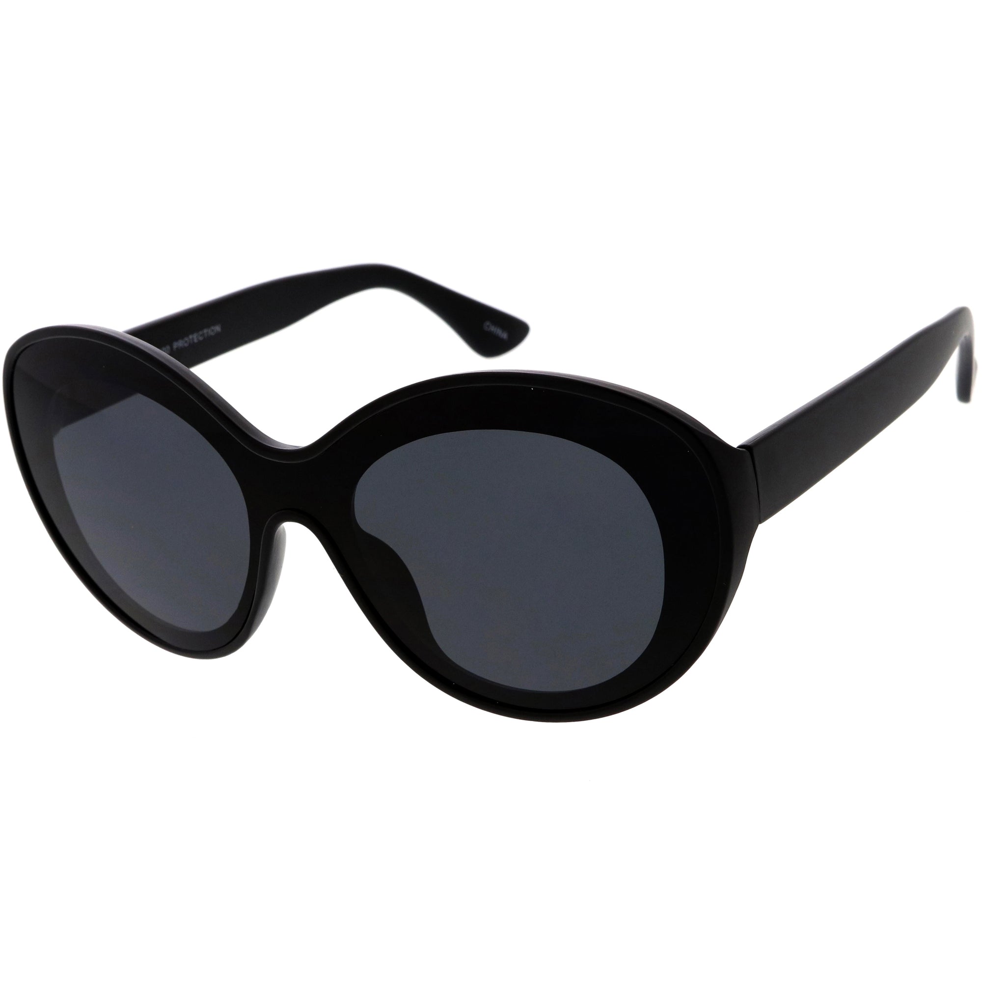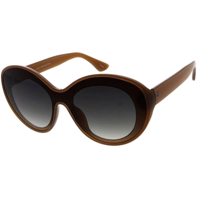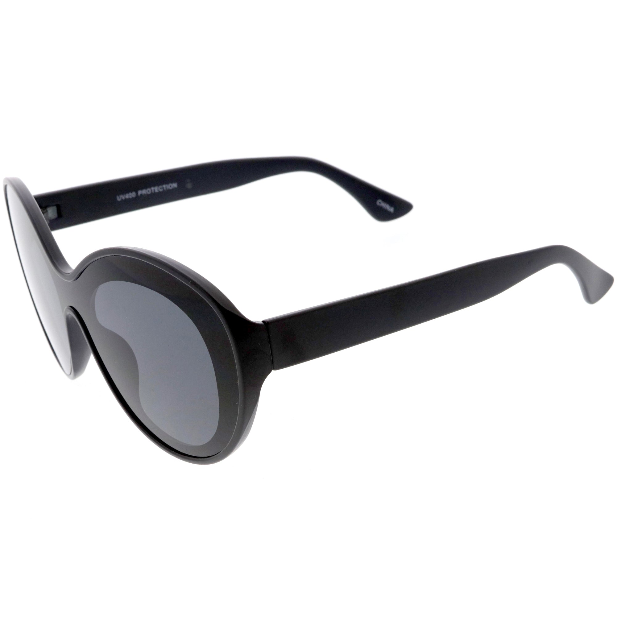 Crafted with an ovular silhouette, these retro-inspired pair of sunnies are crafted with neutral colored lenses. The oversize monolens shield design adds an element of luxury and elegance. Pair these with your everyday wardrobe or a scoop neck top for a 90s edit. Made with a plastic based frame, metal hinges, and 100% UV protected lenses.