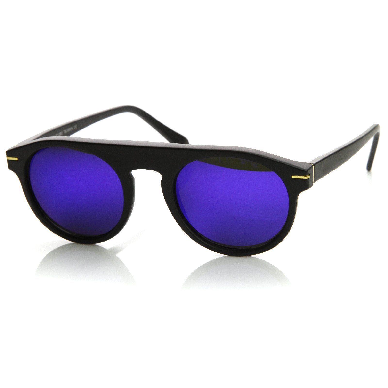 Rounded retro P3 aviator sunglasses, with flash mirrored lenses to add some flare to a classic European look. Produced from acetate based frame, metal hinges and gradient polycarbonate UV protected lenses.