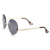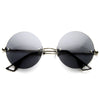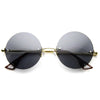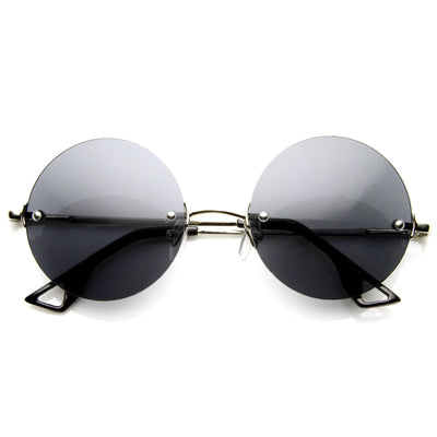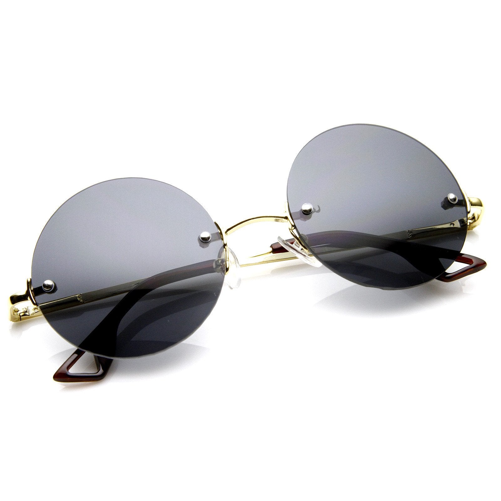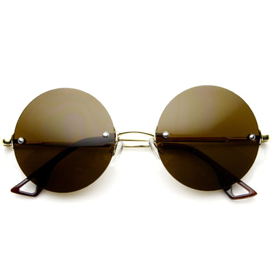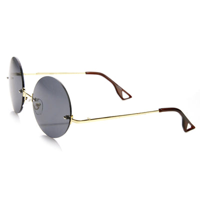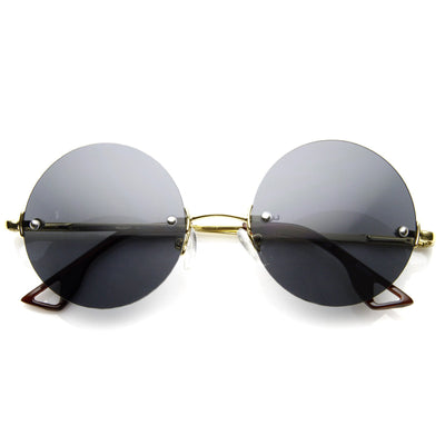 A medium sized unisex circle sunglass that features a frameless lens with metal arms and nose bridge. Elegant metal details with frameless circles give a retro Lennon look for this season. Made with metal arms, metal hinges, metal bridge, English style nose pieces, and UV protected polycarbonate lenses.