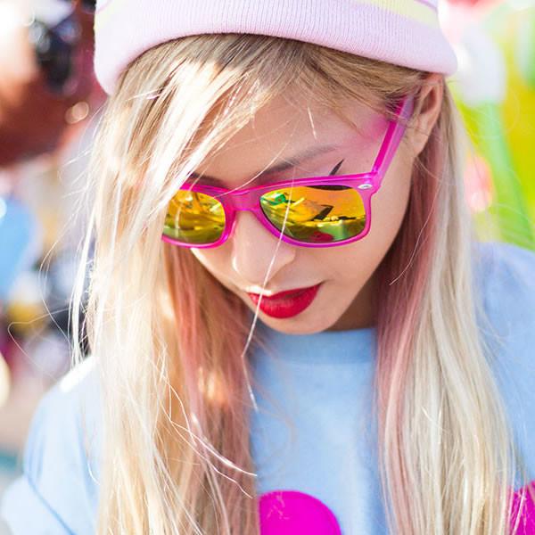 • Bright neon frosted horned rim sunglasses that feature an eye-catching color mirrored lens. A super fun addition to all of your warm and sunny days this season. Made with an acetate based frame, metal hinges and mirrored polycarbonate UV protected lens.