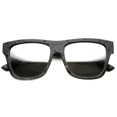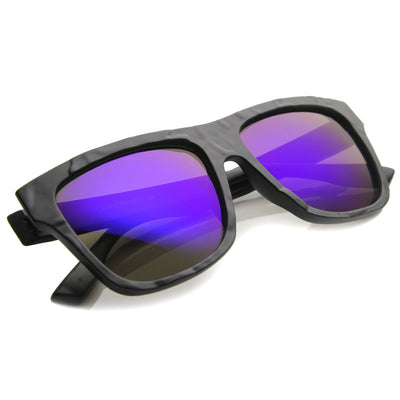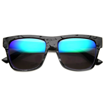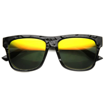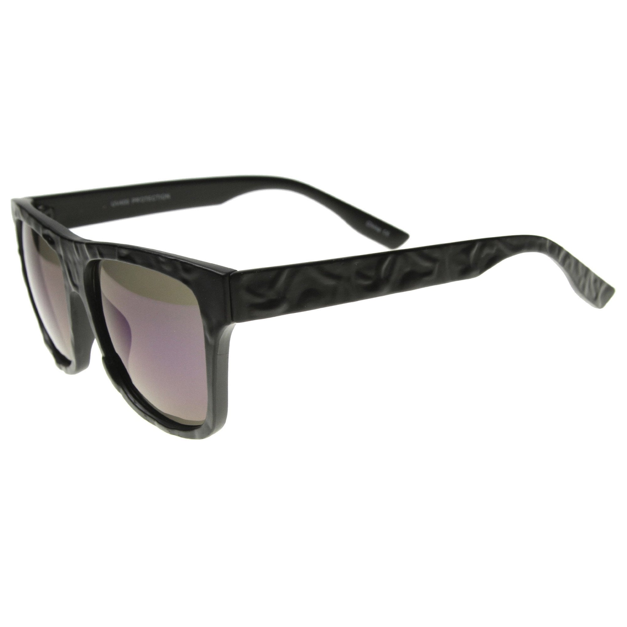 Classic rectangular horned rimmed sunglasses that feature a unique wrinkle textured frame and a vibrant flash mirrored lens. Add a splash of texture to your look this season with these unique flat top sunglasses. Made with a plastic based frame, metal hinges and color mirror polycarbonate UV protected lens.