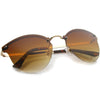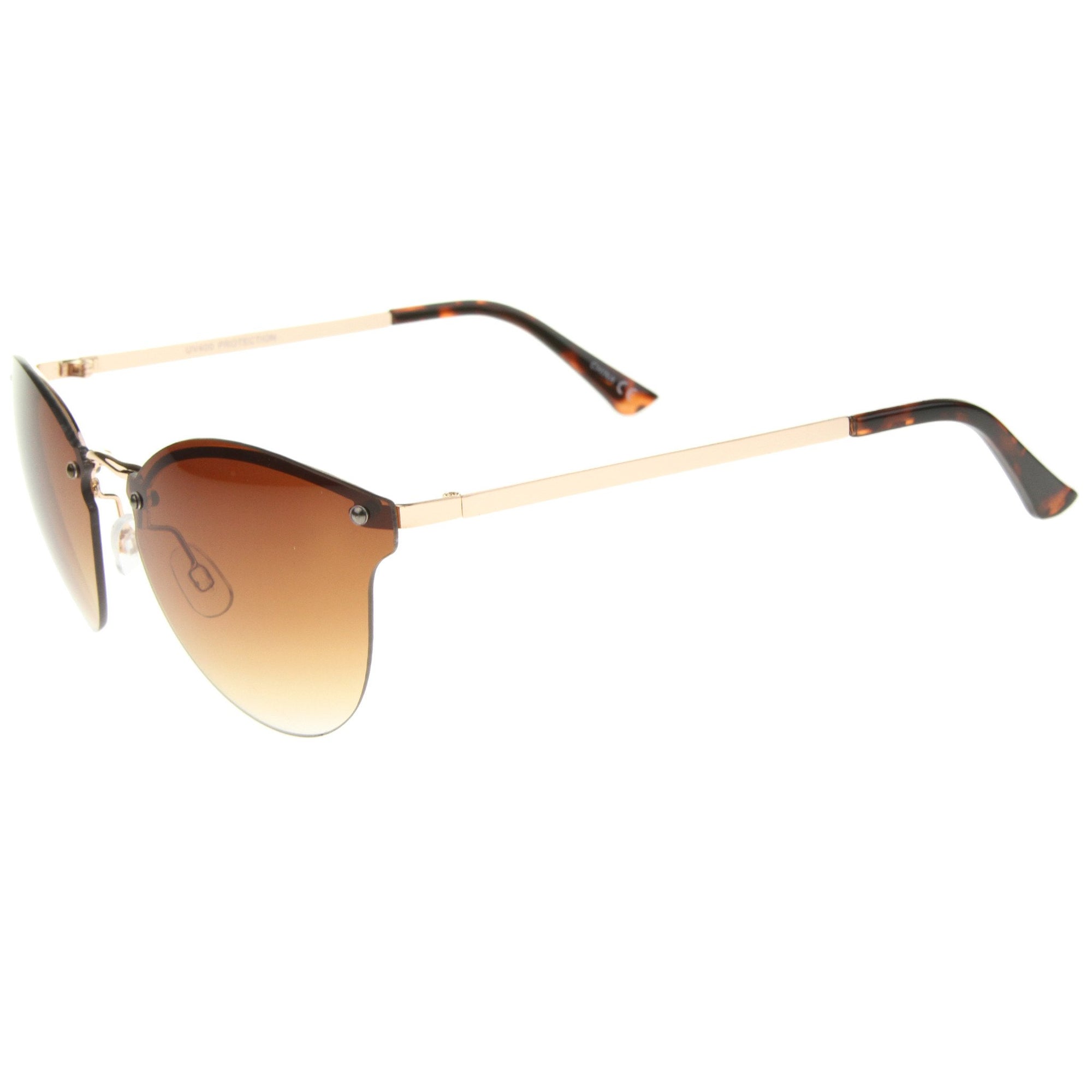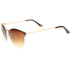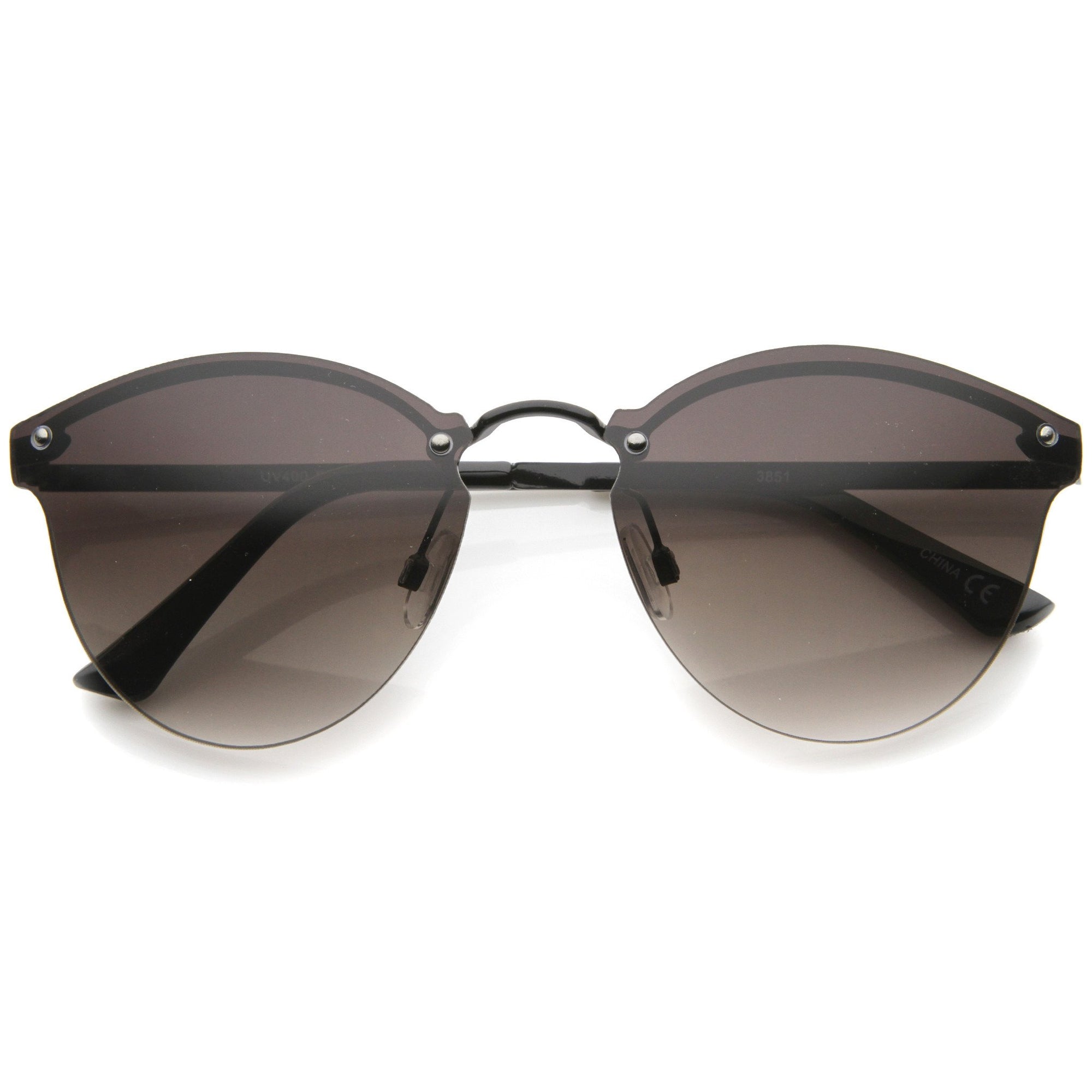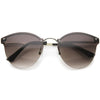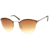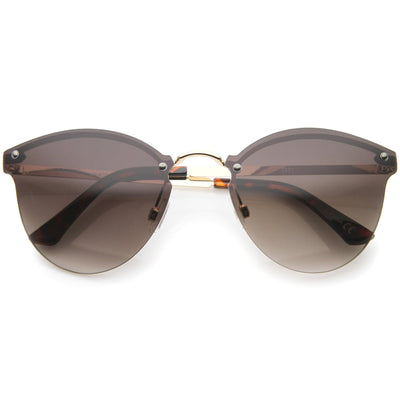 Sleek rimless round sunglasses feature a metal nose bridge and studded bridge accents. A curved metal bridge and circular frame design create a flattering, polished look. High sitting full metal temples with a plastic tip finish off this sophistcated style for an accessory sure to complement any outfit. Made with a plastic based frame, reinforced metal hinges and tinted polycarbonate UV protected lenses.
