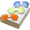 Classic metal teardrop aviator frame with eye catching color mirror colors. Made with spring loaded hinges, English style nose pieces and flash color polycarbonate UV protected lenses.