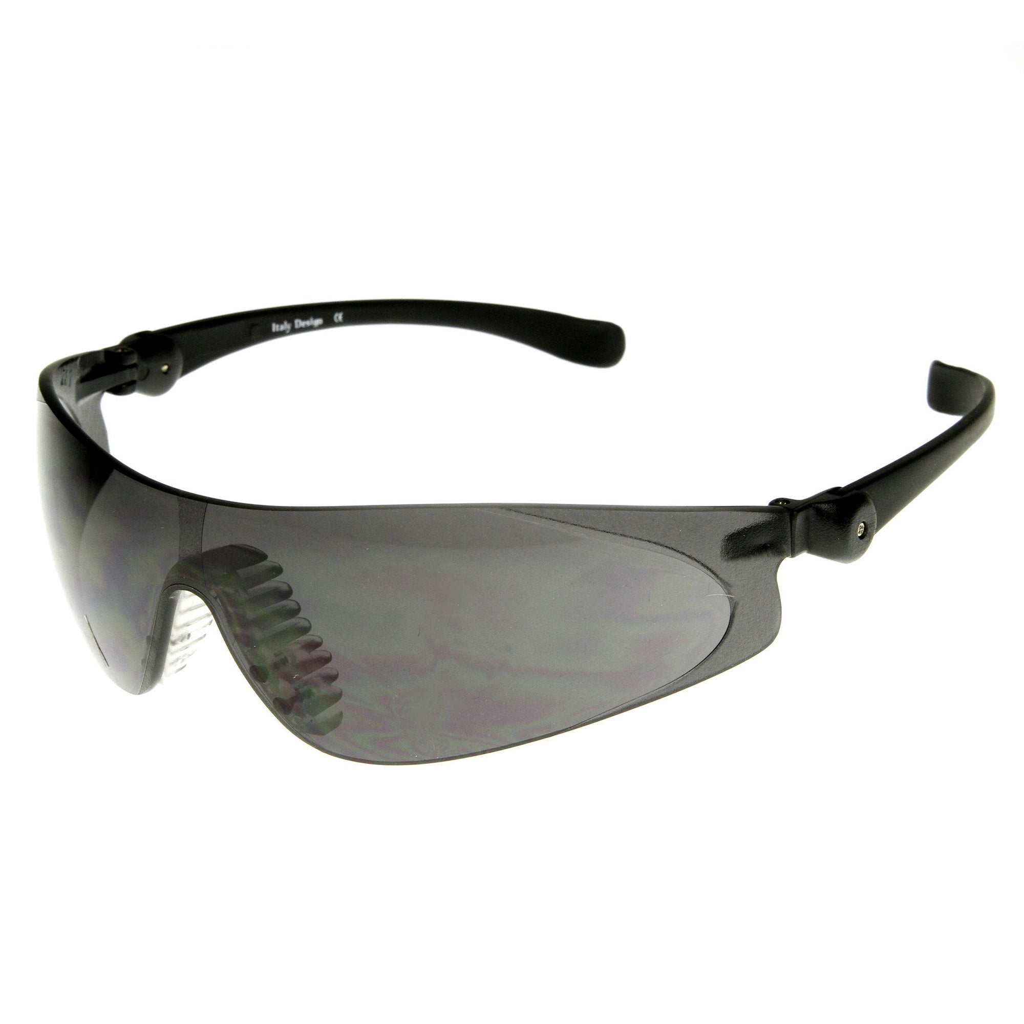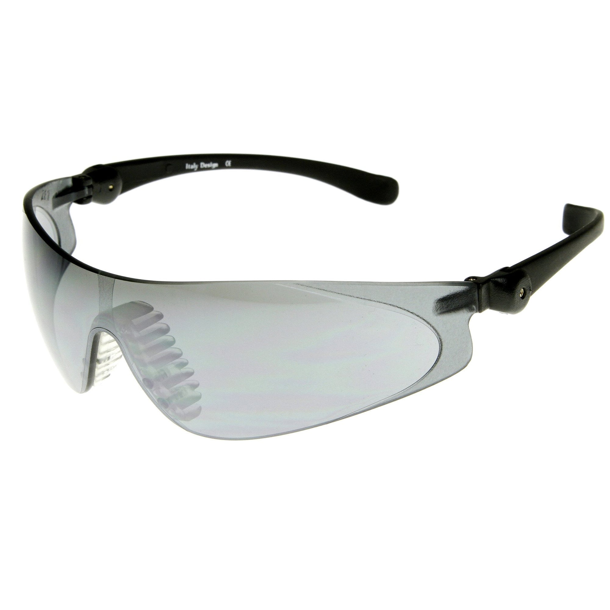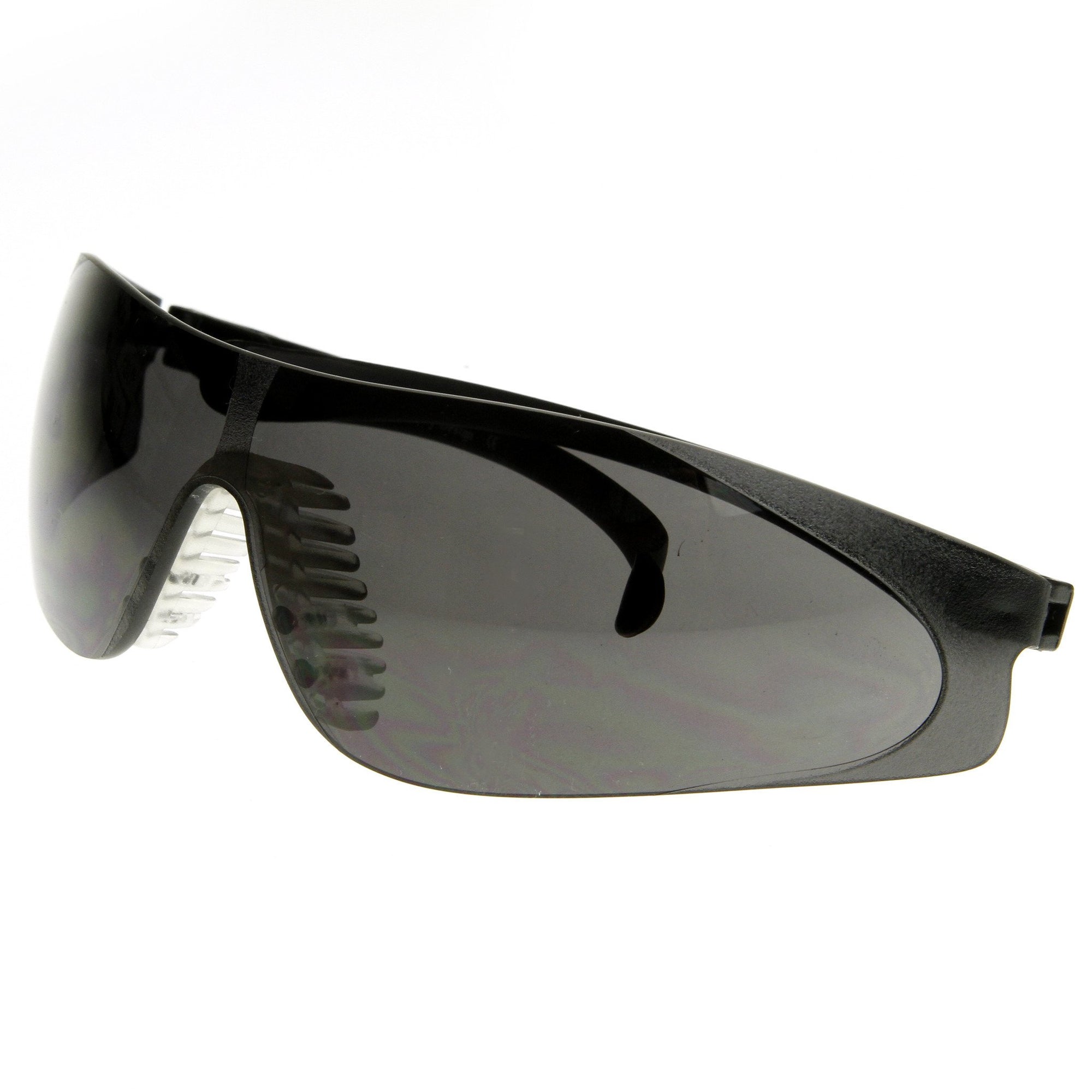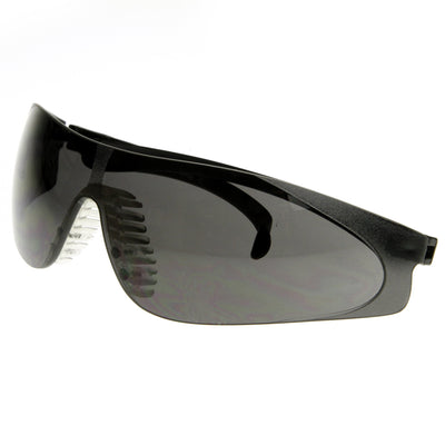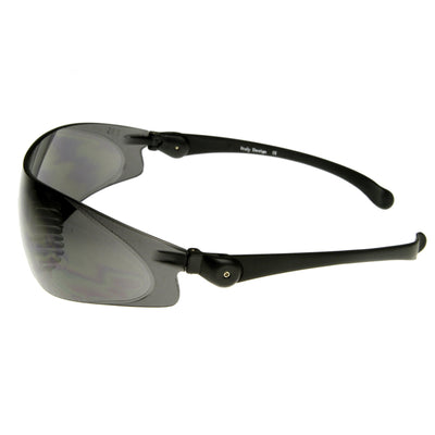 • Shield wrap professional grade protection safety goggles that offer a rimless frame and an adjustable pivot temples for optimal comfort. These safety goggles provide protection against moderate impact hazards and debris. Conforms with ANSI 787.1 standards. Made with polycarbonate based frame, pin hinges and IRPC UV protected polycarbonate lenses.