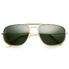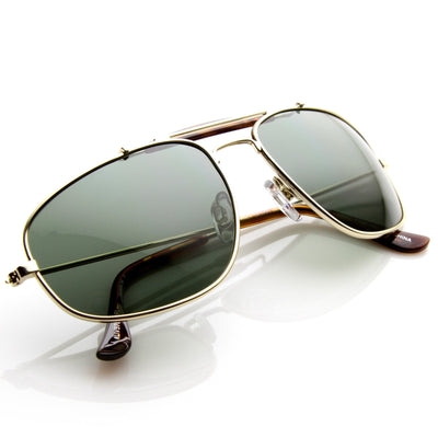 Classic iconic aviator sunglasses that feature a prominent brow bar across the middle of the frame and an anti-glare polarized lens. Made with a metal based frame, classic metal hinges, and polarized UV protected lens.