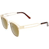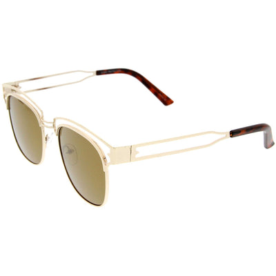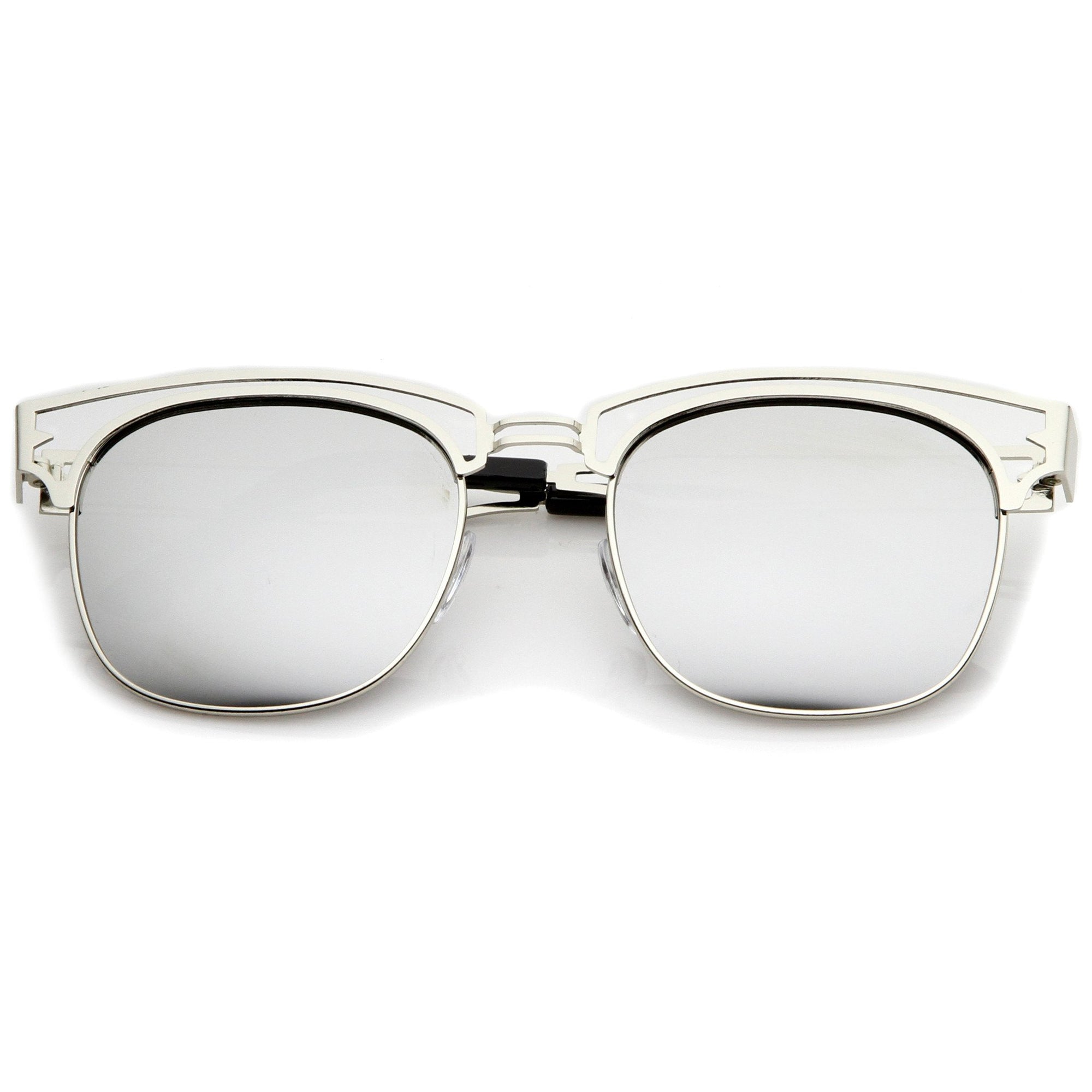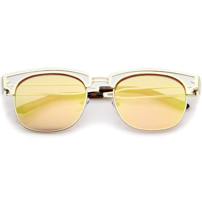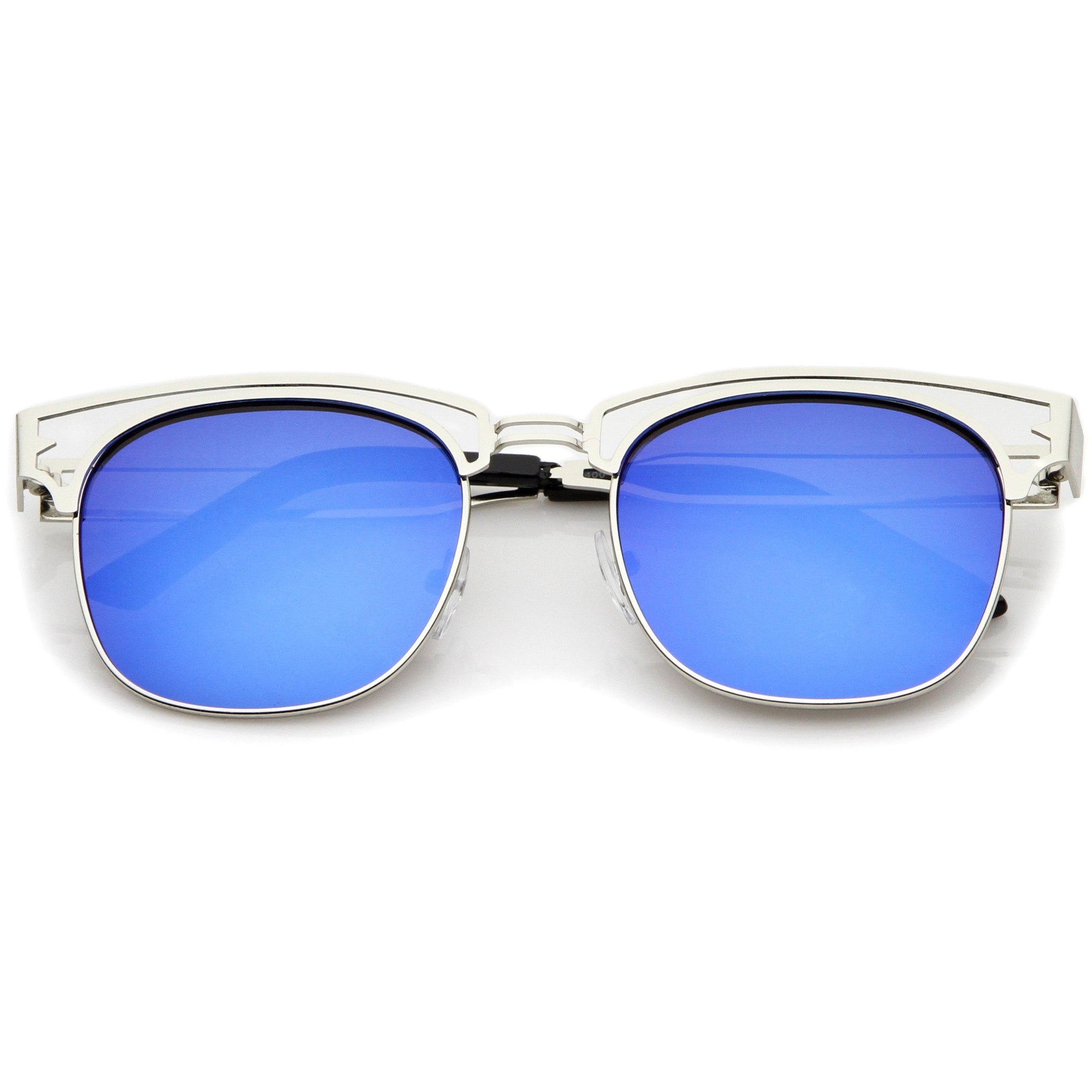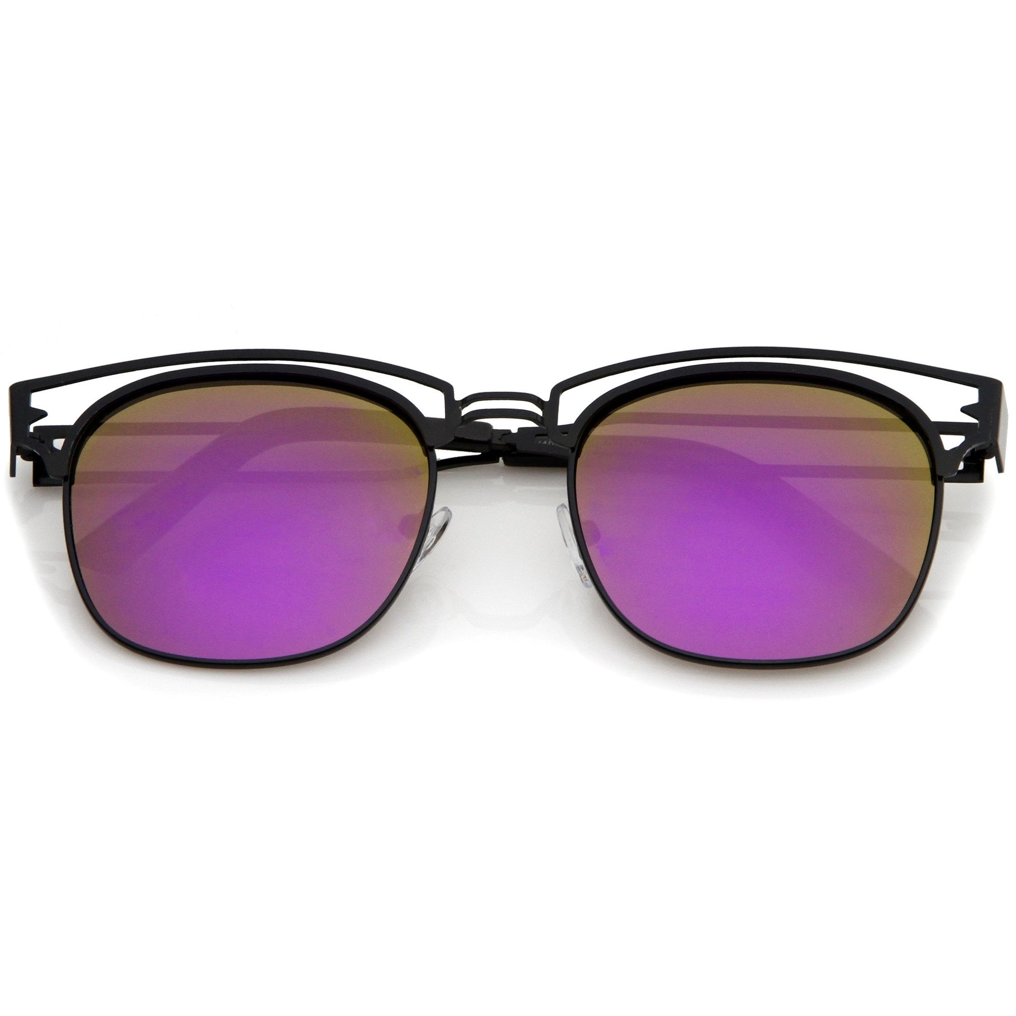 Edgy and luxurious, these full metal frame sunglasses feature a horn rimmed style frame with a sleek open metal design throughout. High sitting temples add to this stylish look, while square colored mirror lenses offer eye-catching appeal. Wear it for a day exploring the city or hanging out with friends. Made with a metal based frame, English style nose pieces, metal hinges, and reflective UV400 protective lenses.