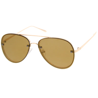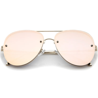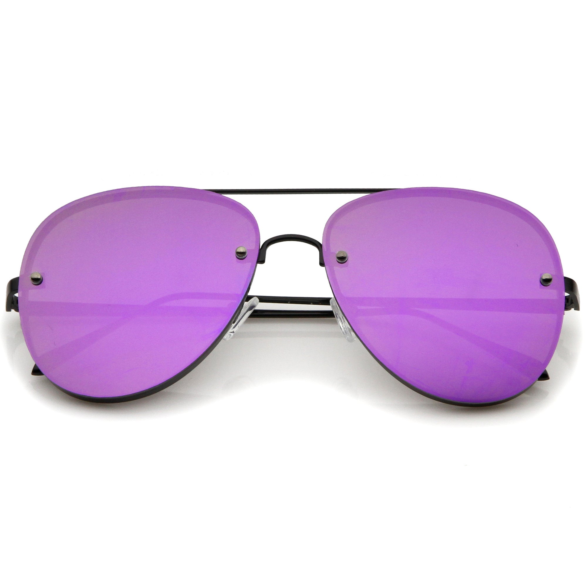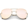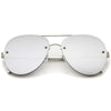 A classic shape with a modern design, these exquisitely crafted sunglasses feature a rimless aviator frame with ultra-slim metal temples and brow bar. Teardrop-shaped colored mirror flat lenses and rivets at the front give these sunglasses it's luxurious and eye-catching finish. Versatile enough to wear from season to season, these rimless aviator sunglasses can be easily paired with any look. Made with a metal based frame, English style nose pieces, metal hinges, and reflective UV400 protective lenses.