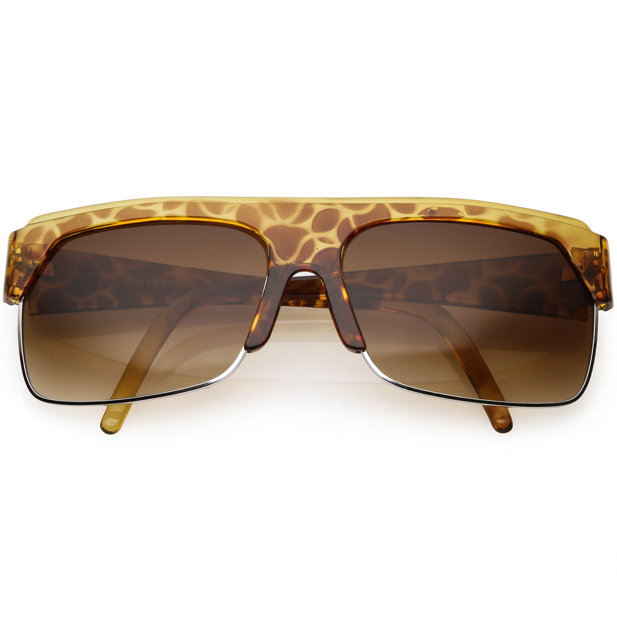 Add vintage flair to your look with these semi-rimless rectangle sunglasses. With an oversize and flat top design, these true vintage sunglasses feature neutral colored gradient lenses and stylishly wide arms for a bold effect. Pair these rectangle sunglasses with a retro inspired outfit for added glamour. Made with a plastic and metal based frame, reinforced metal hinges, and 100% UV protected lenses. NOTE: True Vintage styles come as is with minor wear due to the nature of its authentic vintage age and design.
