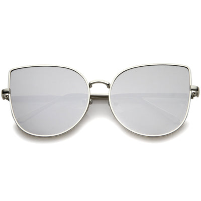 Chic and sophisticated, these oversized sunglasses are designed with a cat eye silhouette and a slim metal frame. Colored mirror flat lenses and metal tip temples complete this luxurious style and classy style. Versatile and feminine, these must-have cat eye sunglasses are a great addition to our cat eye collection. Made with a metal based frame, English style nose pieces, metal hinges, and polycarbonate UV400 protective lenses.