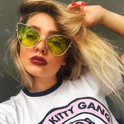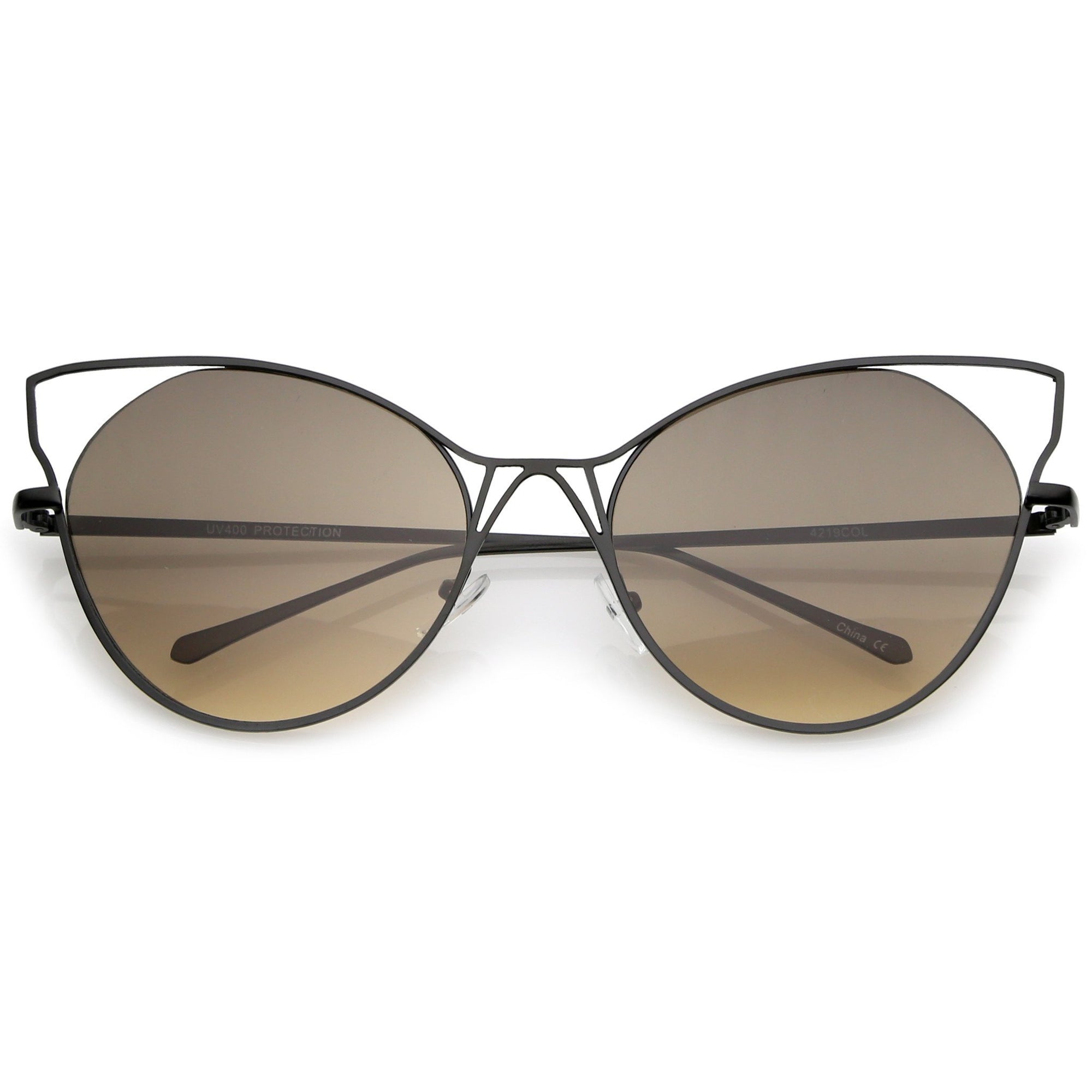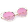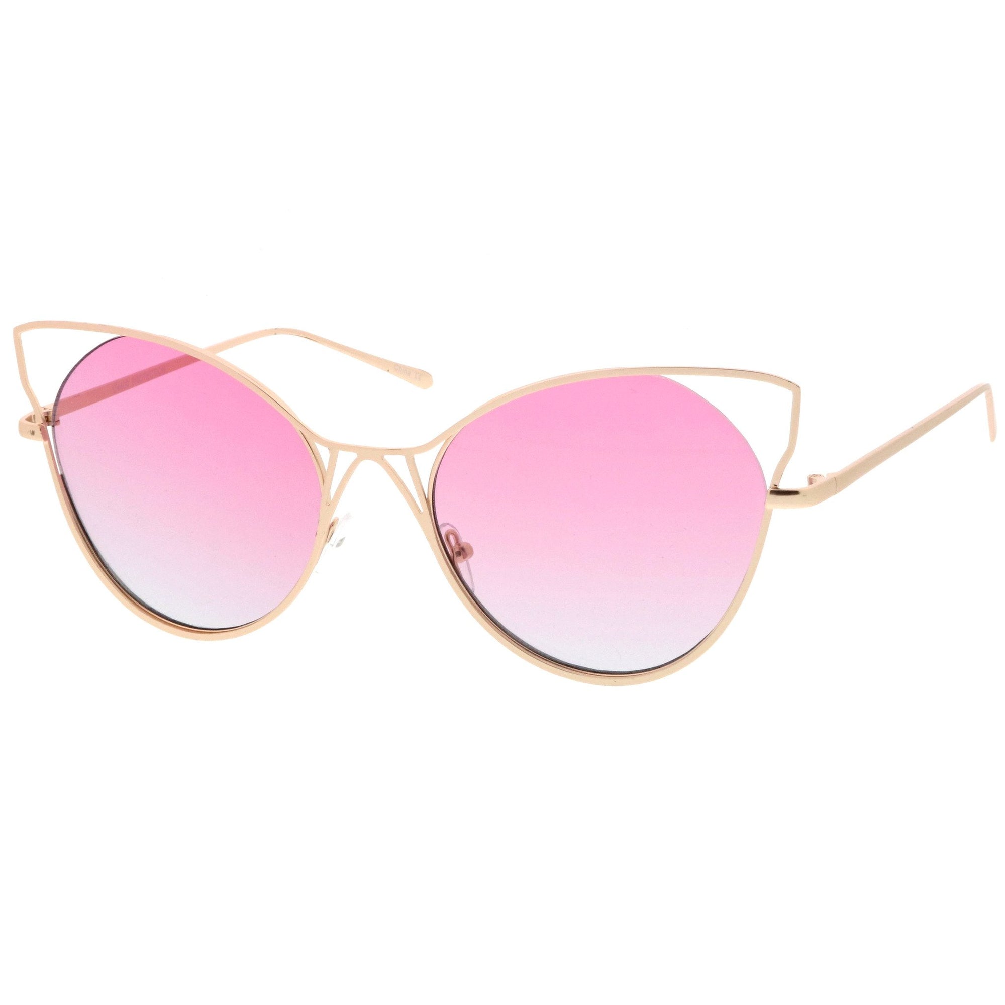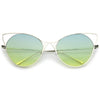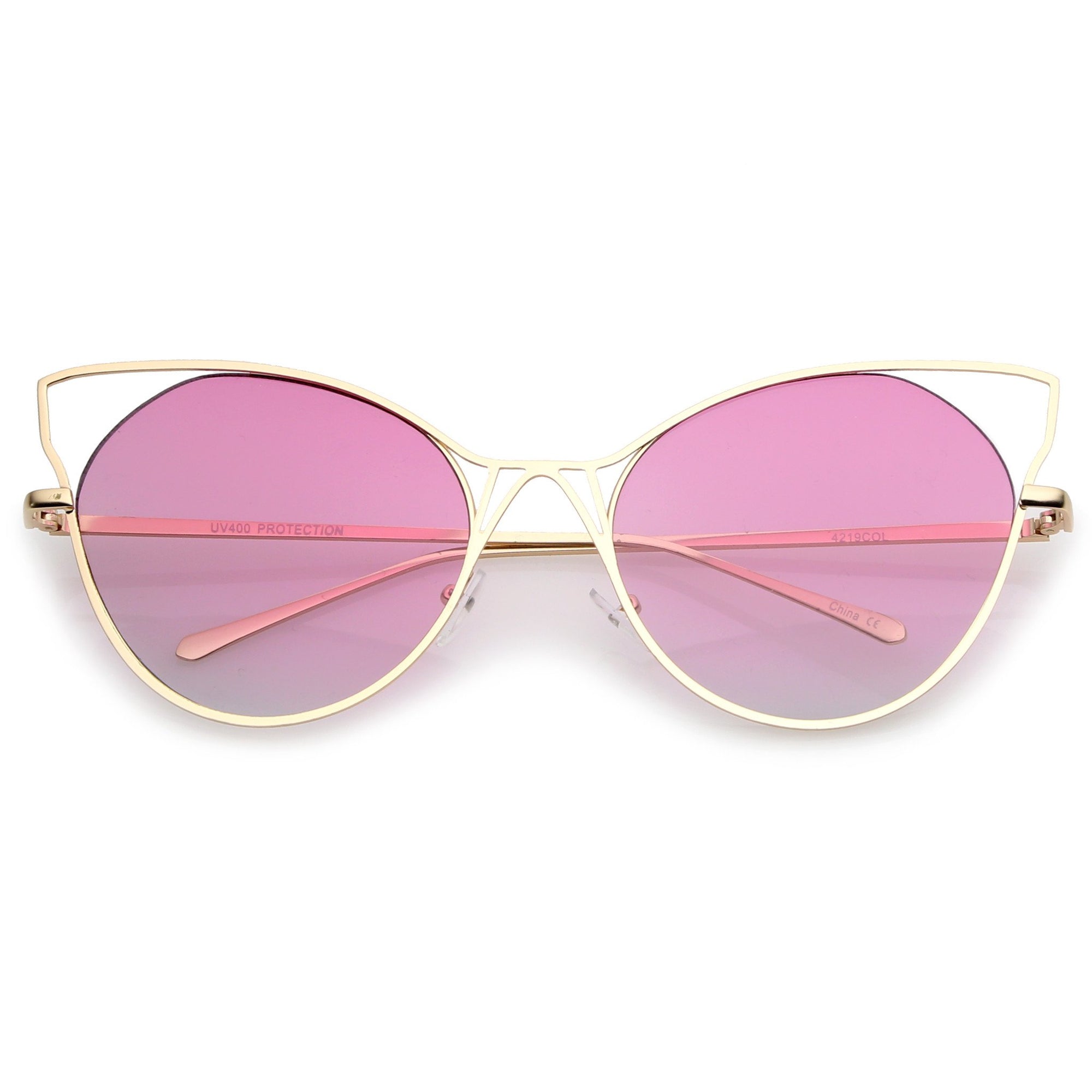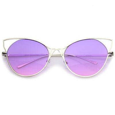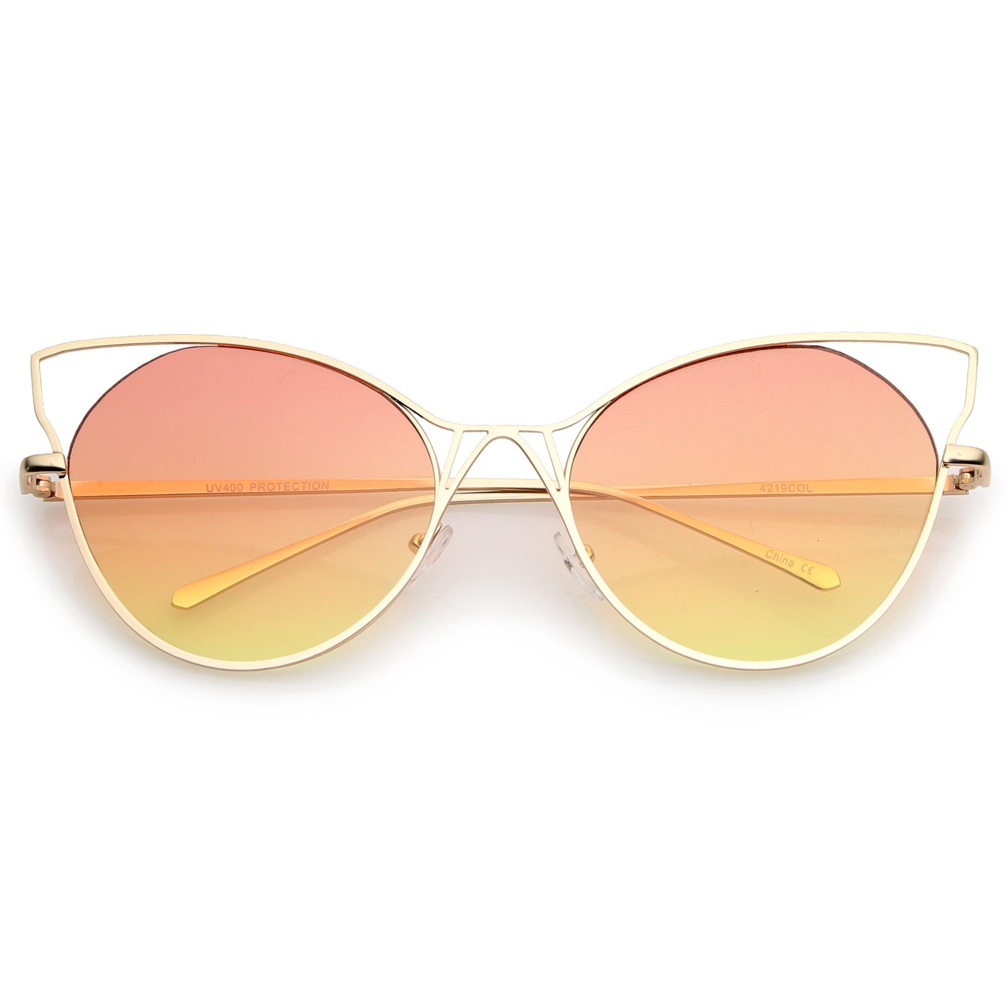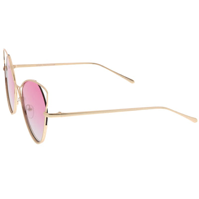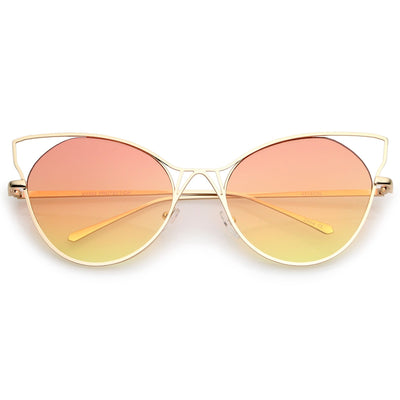 Make a statement with these oversize cat eye sunglasses featuring an open metal design and ultra slim temples for a sophisticated feel. Accented with super flat lenses in colorful gradient hues, these bold sunglasses are perfect for a day in the sun. Made with a metal based frame, English style nose pieces, metal hinges, and polycarbonate UV400 protected lenses.