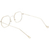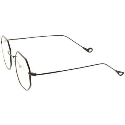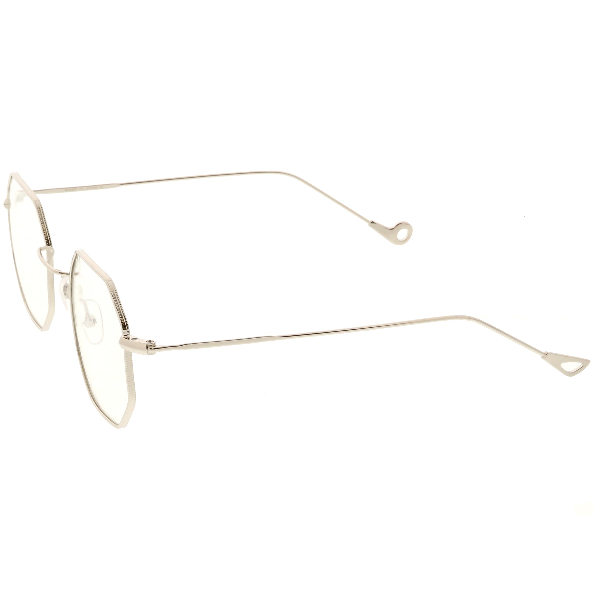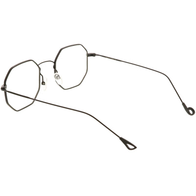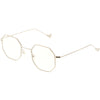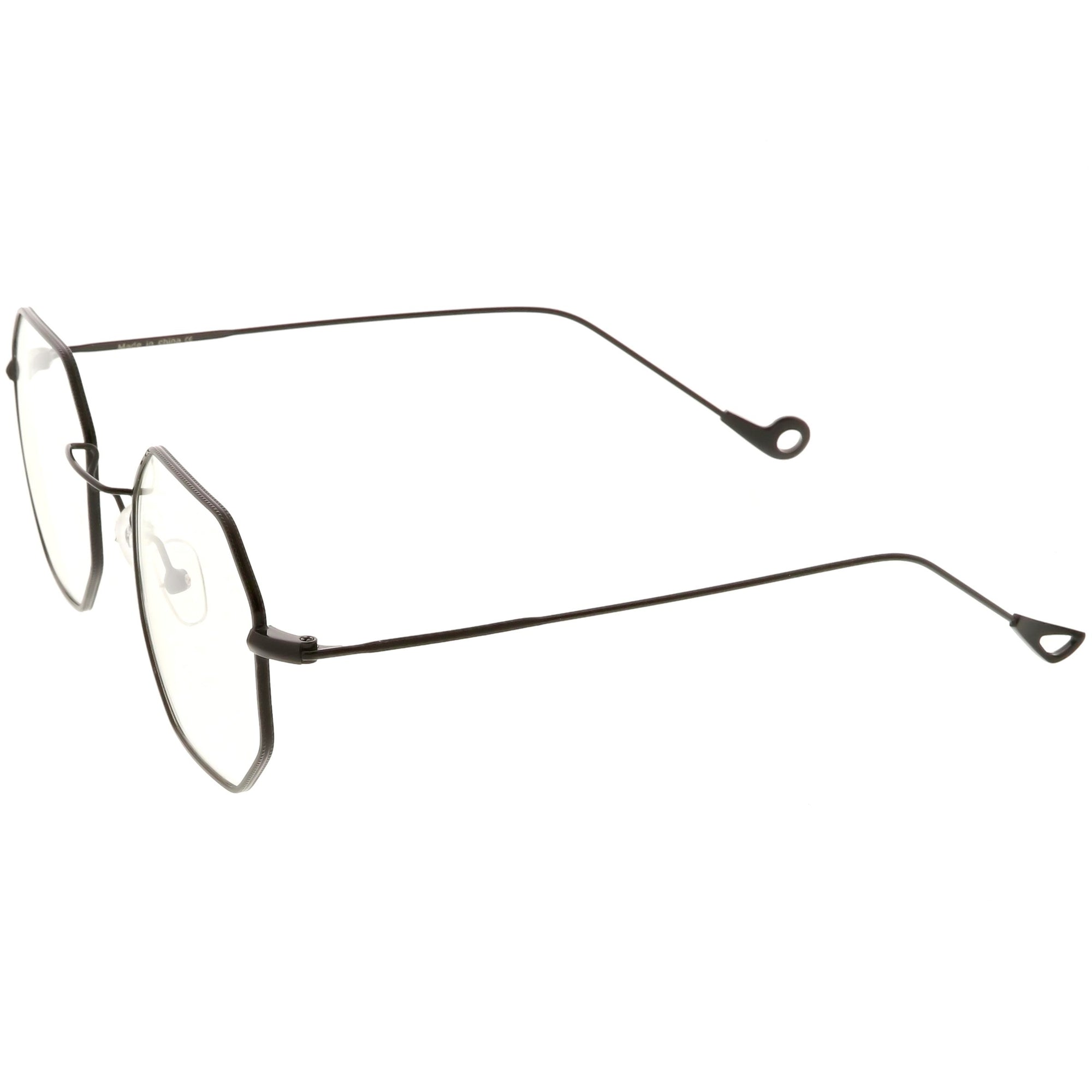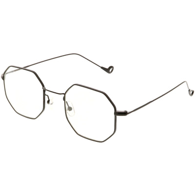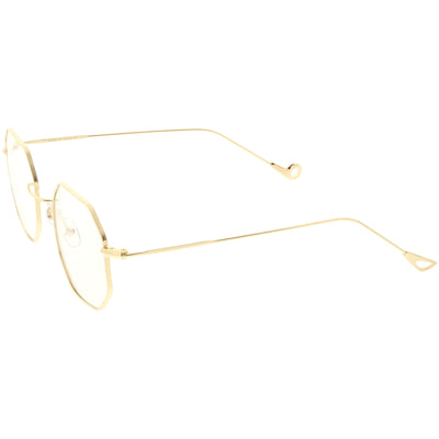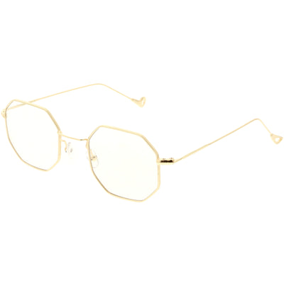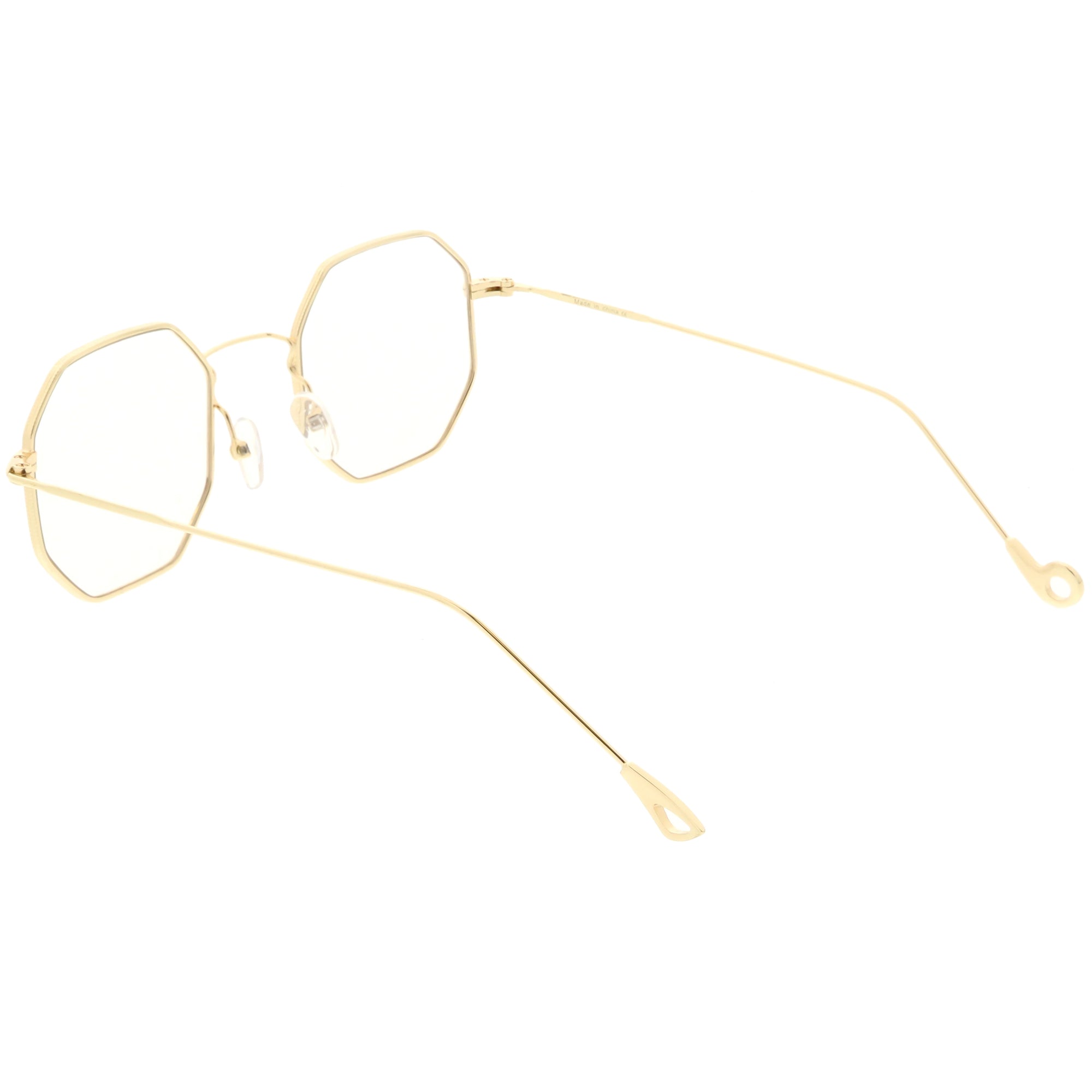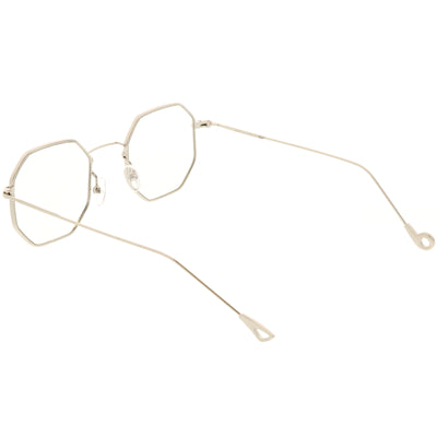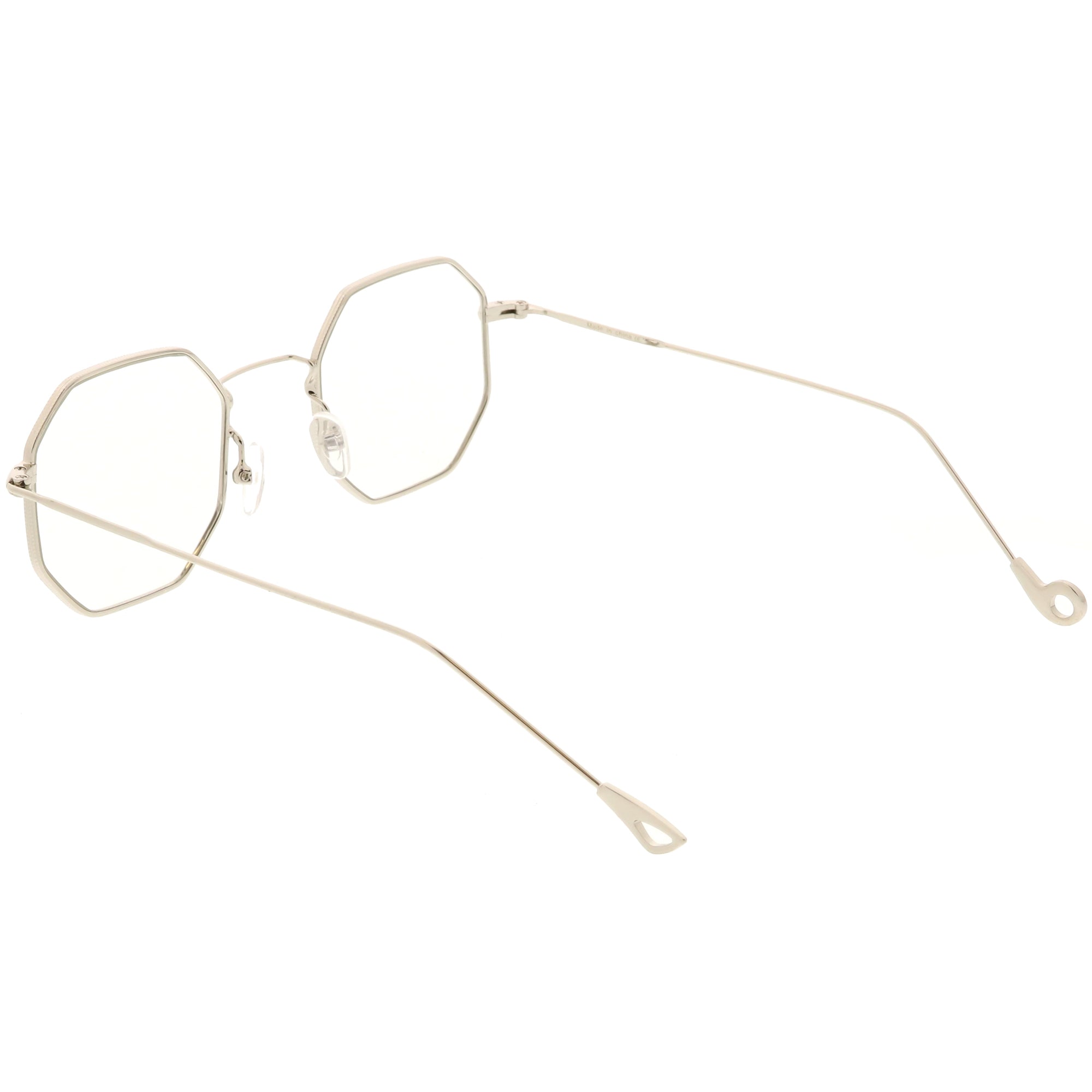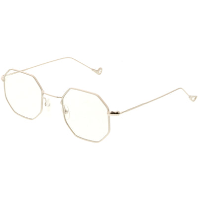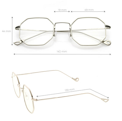 • Retro geometric octagon eyeglasses featuring ultra slim arms with unique cutouts at the arm tips. Complete with clear flat lenses, these lightweight and stylish eyeglasses are a total must-have style. Made with a metal based frame, adjustable English style nose pieces, metal hinges, and 100% UV protected lenses.