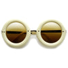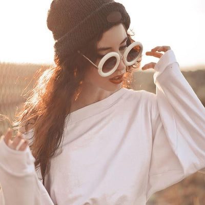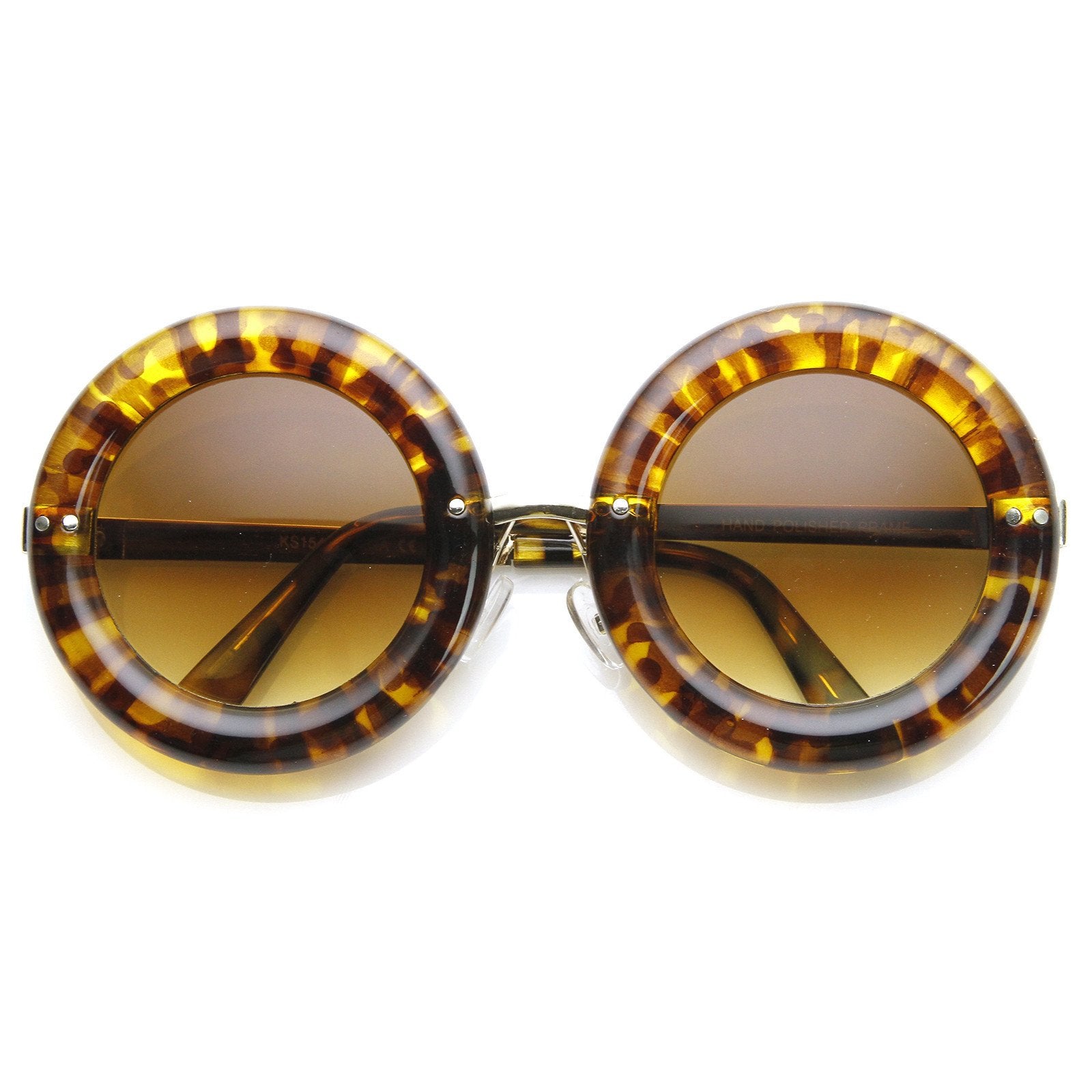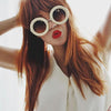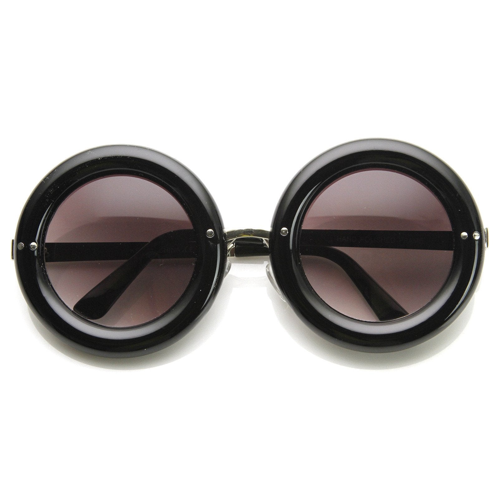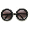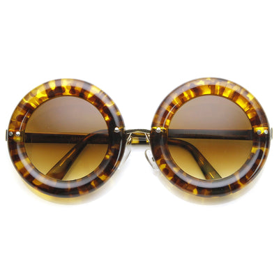 Womens oversized round sunglasses that feature elegant metal temples and a bold rimmed circular frame that kind of resembles a delicious donut. These aesthetically rounded sunnies are a super stylish addition to this seasons collection. Made with a plastic based frame, metal hinges and UV protected polycarbonate lenses.