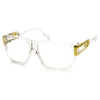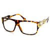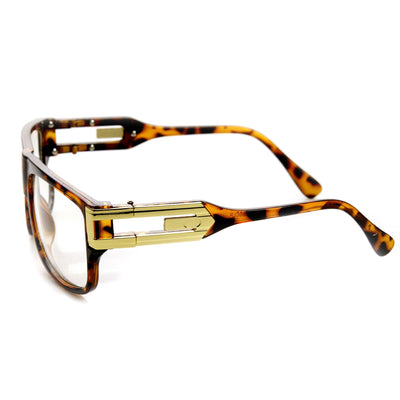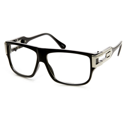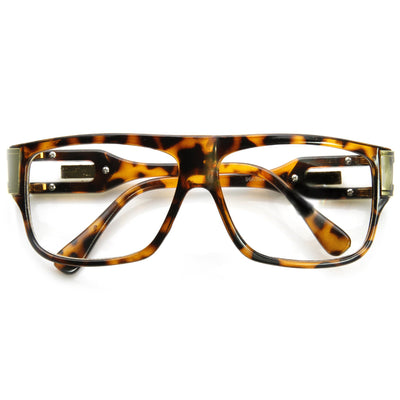 Classic flat top aviator that features a bold plastic frame with elegant double hinged metal temples. The bold lines and prominent metal temples give these retro aviators a very masculine look for the season. Made with an acetate based frame, double hinged metal temples, and UV protected polycarbonate lenses.