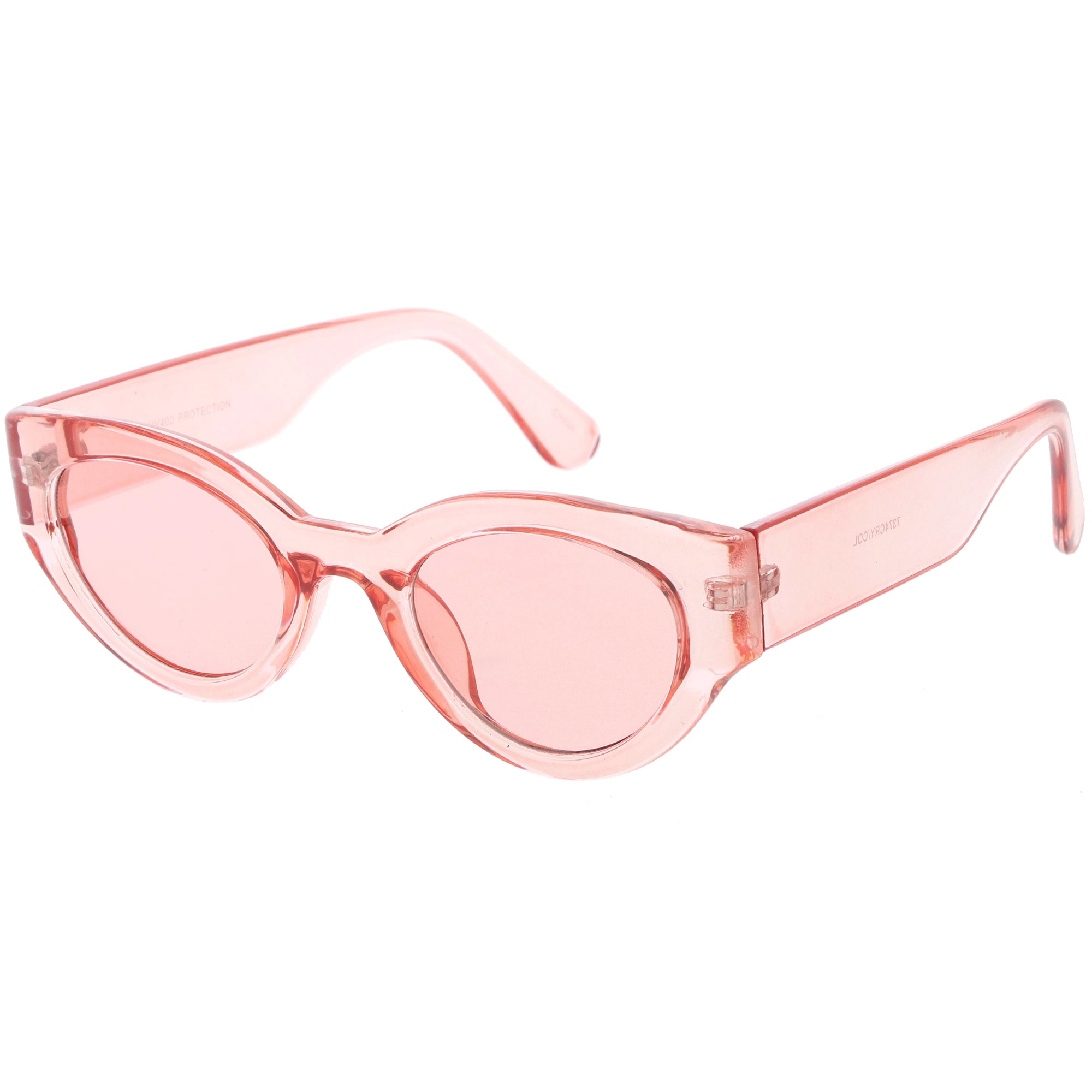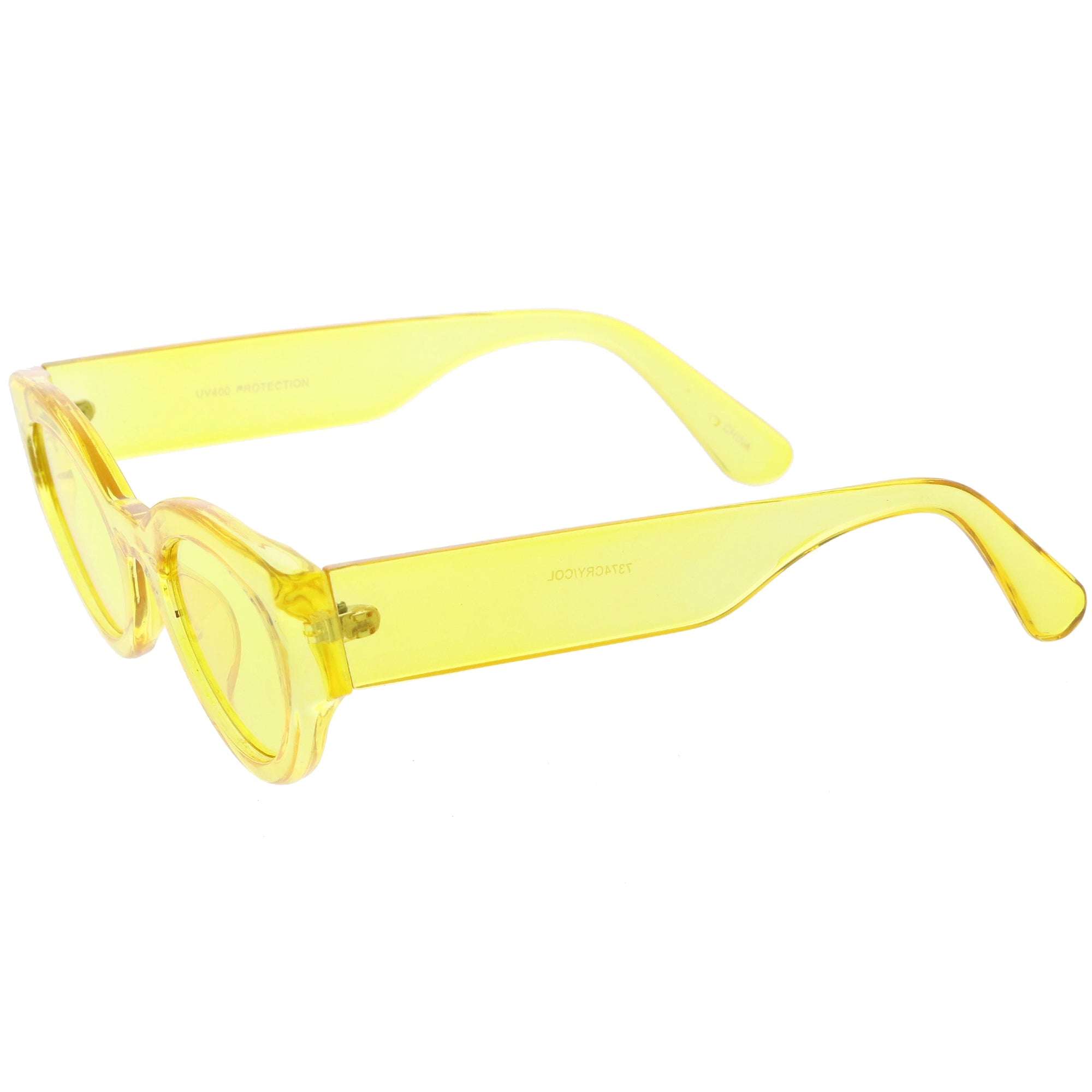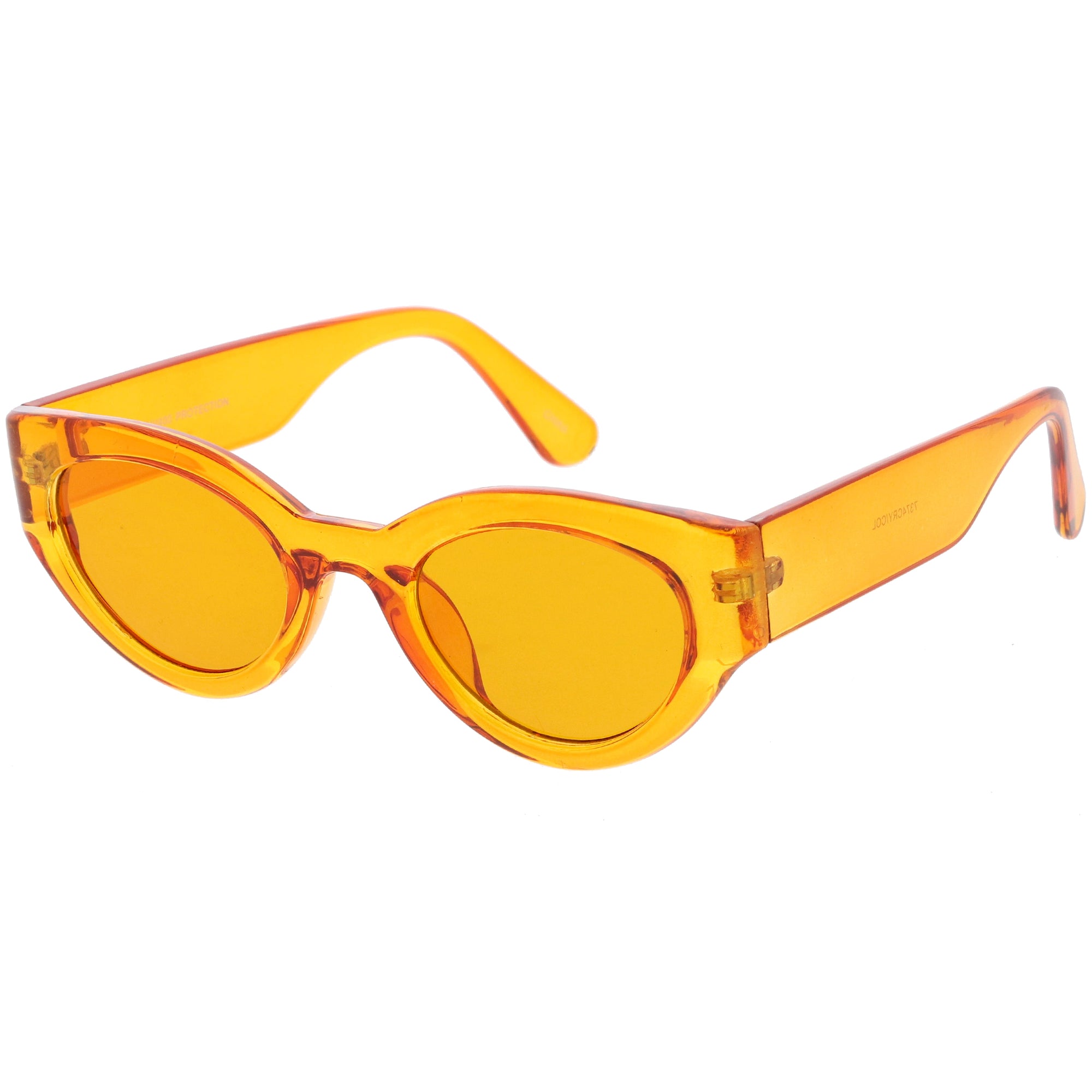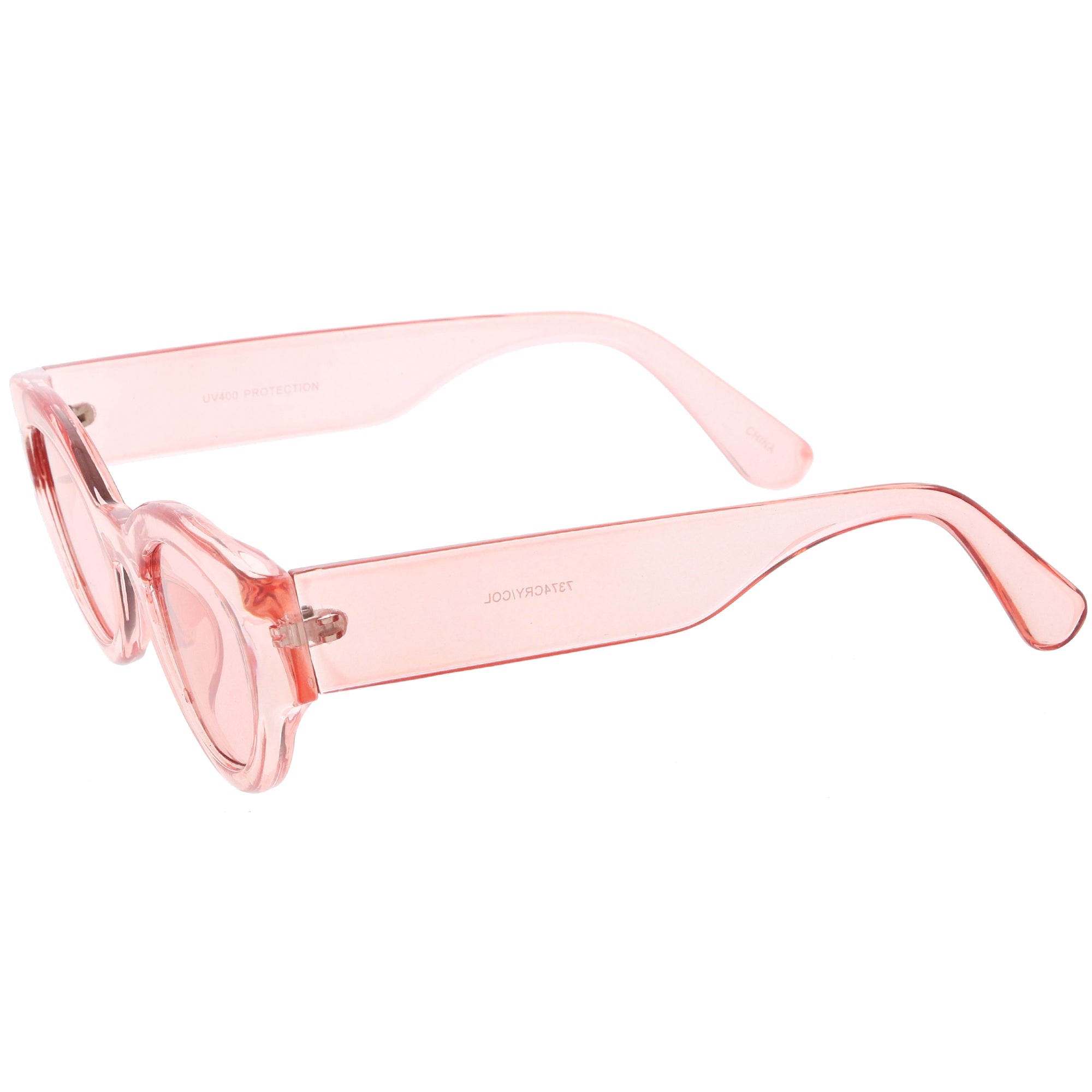 • Bold cat eye sunglasses featuring a thick translucent frame and oval flat lenses in fun color tinted hues. Accented with stylishly wide arms, these cat eye sunglasses are designed in matte and shiny finishes for a variety of looks. Made with a plastic based frame, reinforced metal hinges, and 100% UV protected lenses.