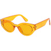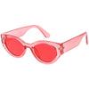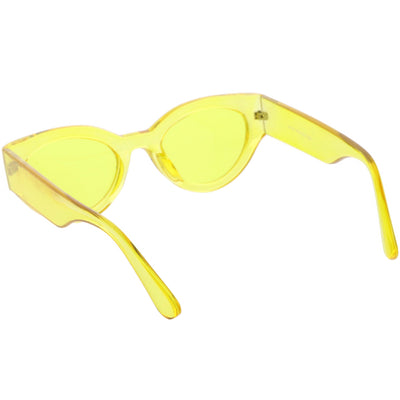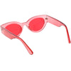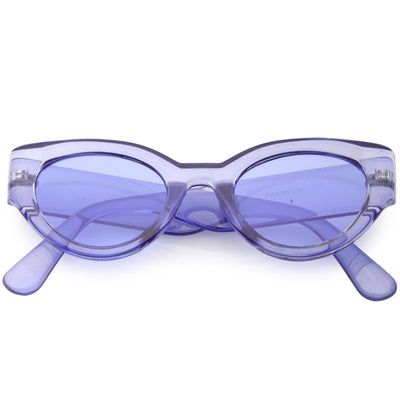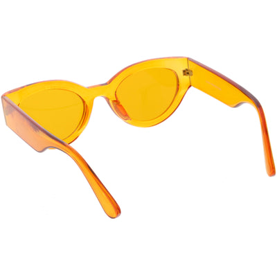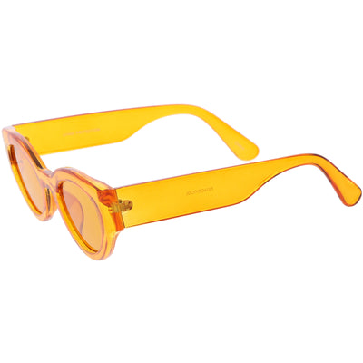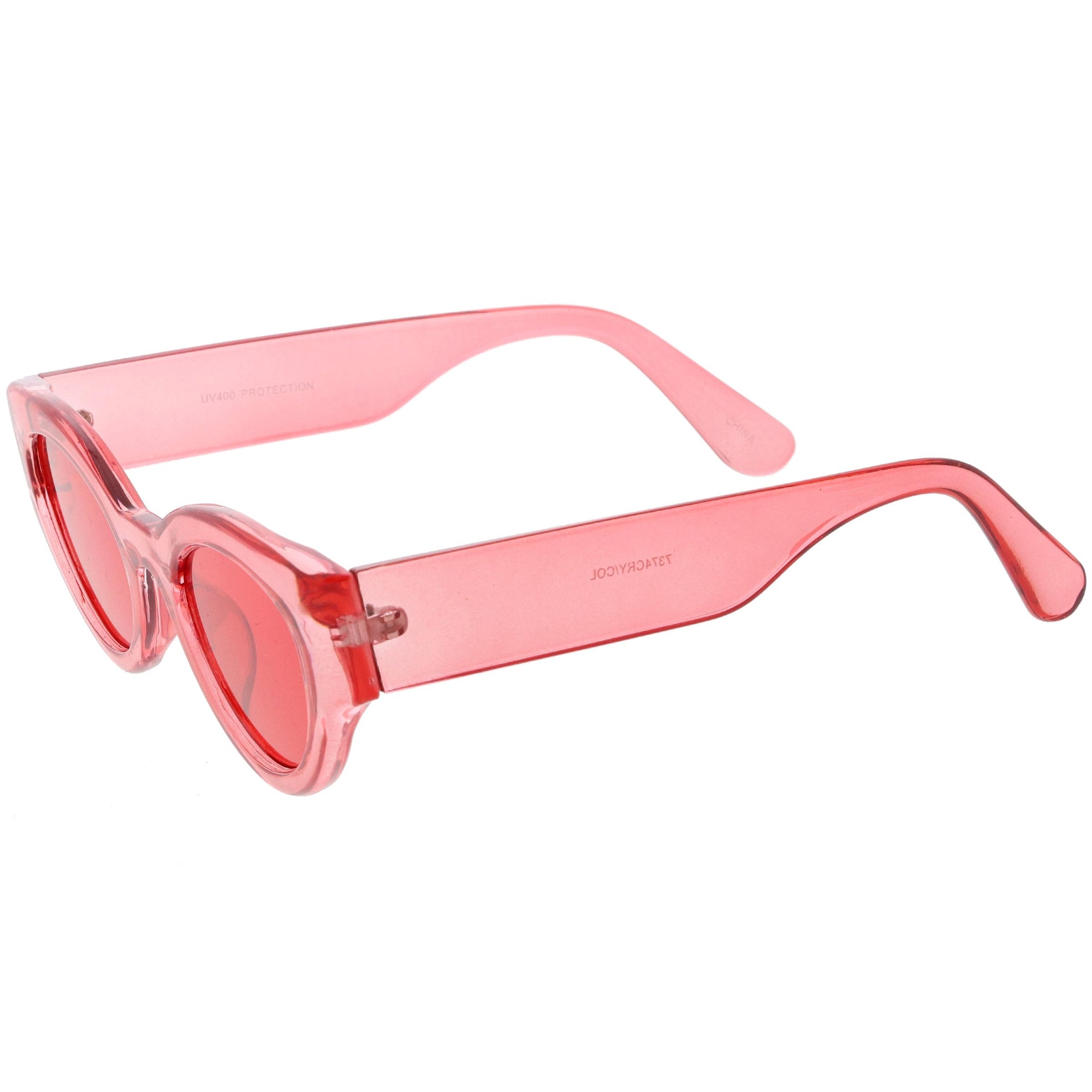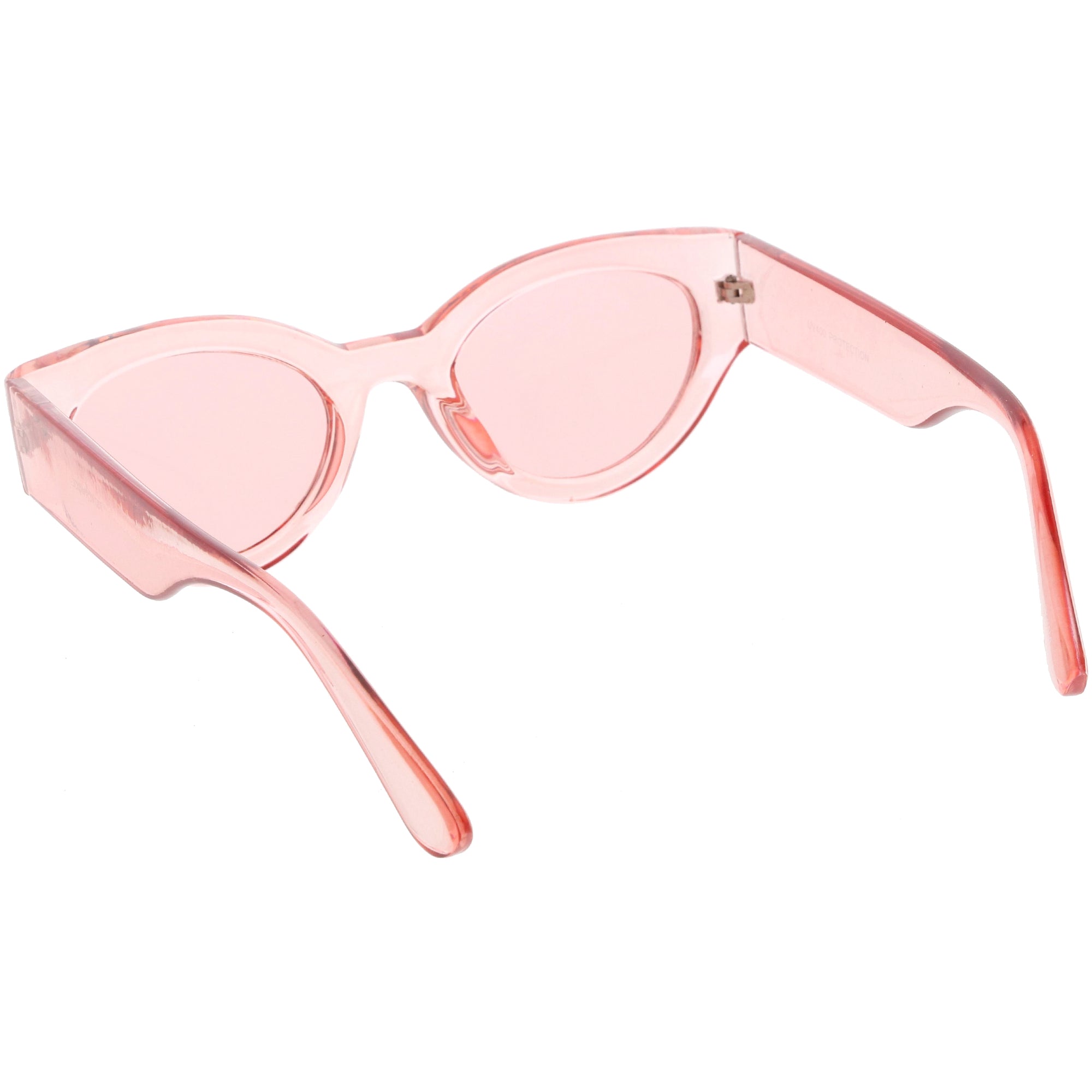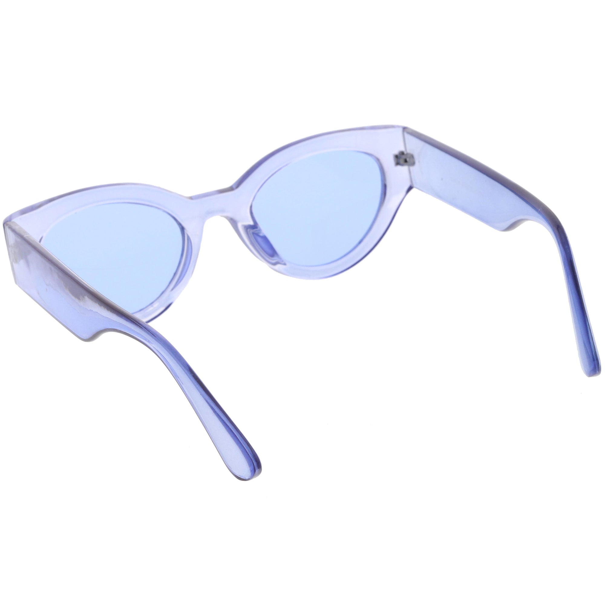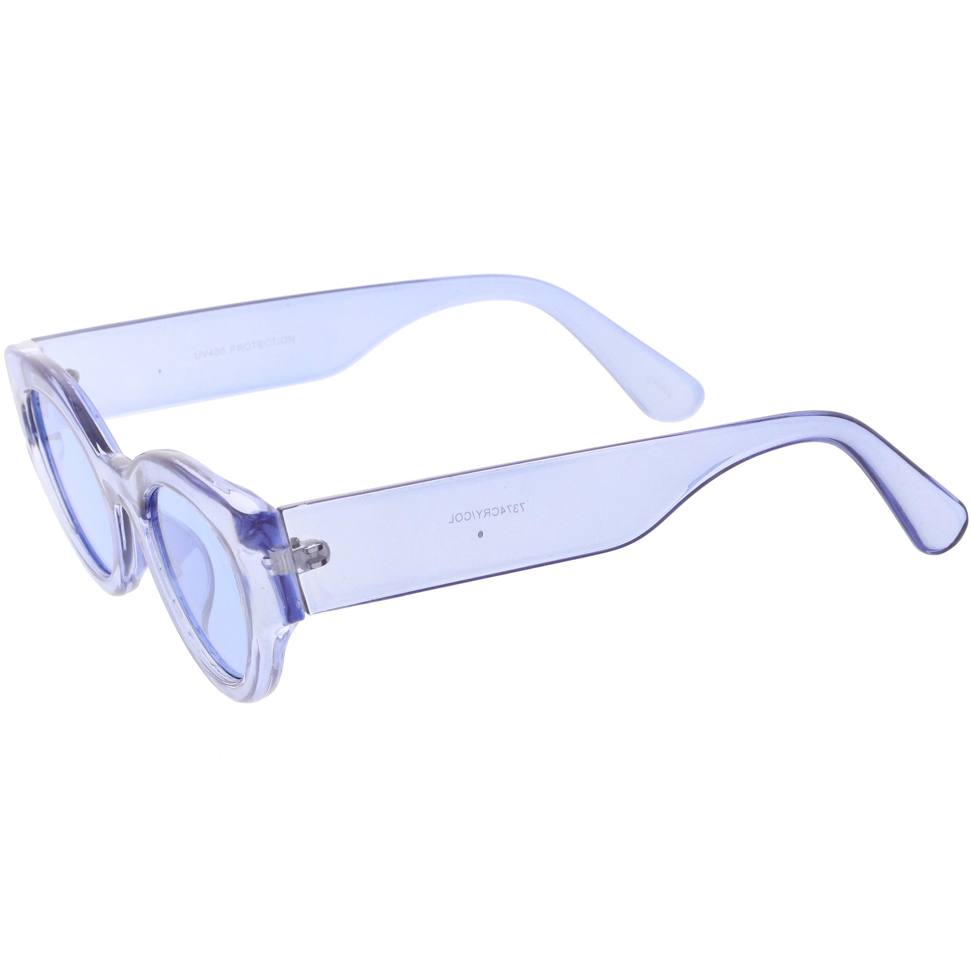 • Bold cat eye sunglasses featuring a thick translucent frame and oval flat lenses in fun color tinted hues. Accented with stylishly wide arms, these cat eye sunglasses are designed in matte and shiny finishes for a variety of looks. Made with a plastic based frame, reinforced metal hinges, and 100% UV protected lenses.