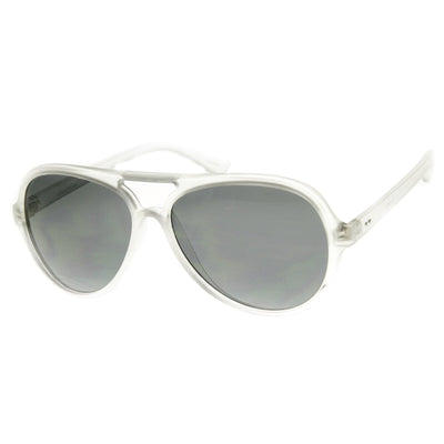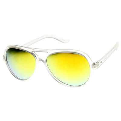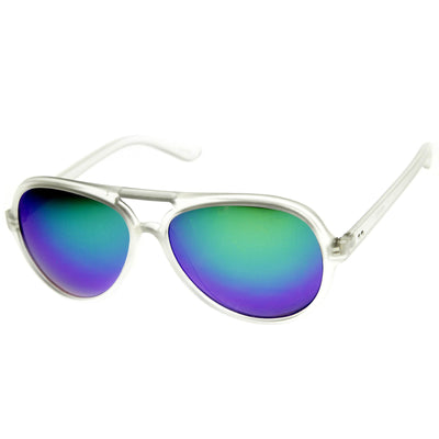 Classic plastic aviator sunglasses that feature a cool frosted frame and an eye-catching color mirrored lens. A classic shape with stand out features that will look great on both men and women this season. Made with an acetate based frame, reinforced metal hinges and polycarbonate UV protected lens.
