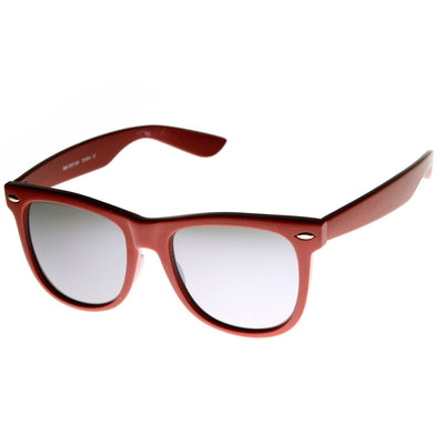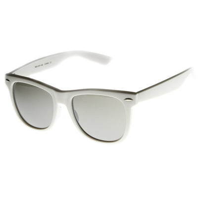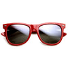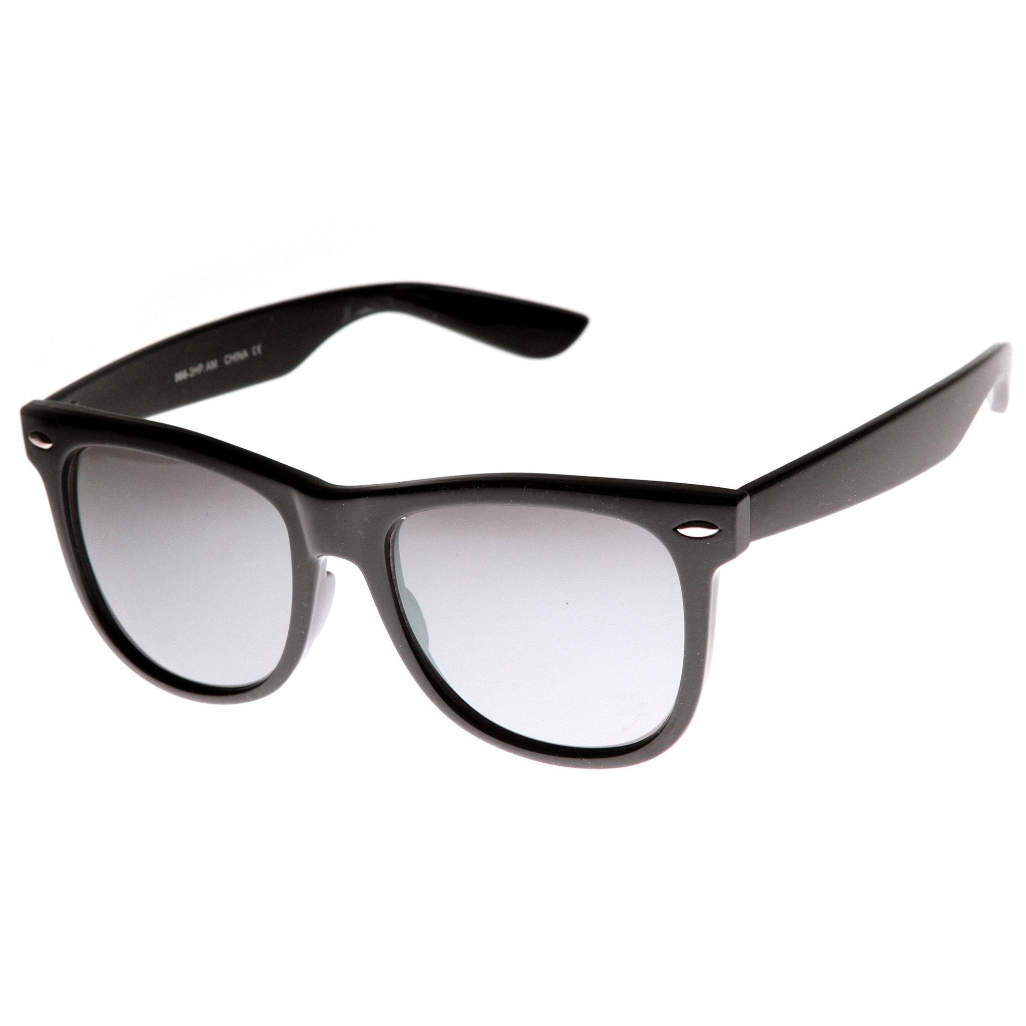• A slightly larger modified version of the classic horned rim design that features a mirrored lens. You can't go wrong with the classic frame, so feel free to wear these in any season. Made with a plastic based frame, metal hinges and flash UV protected polycarbonate lenses.