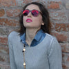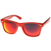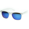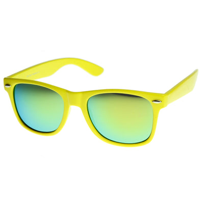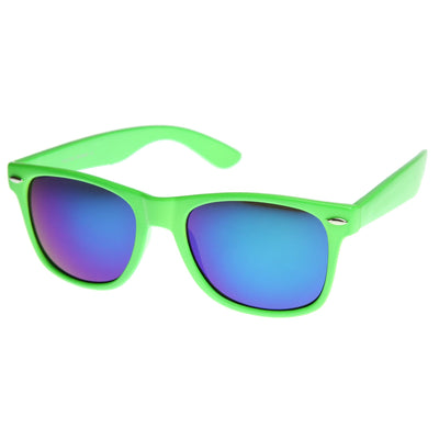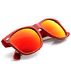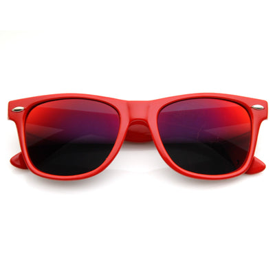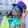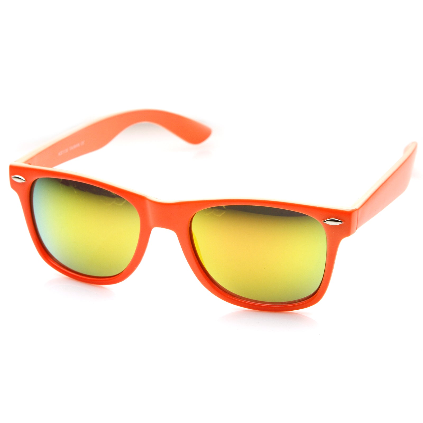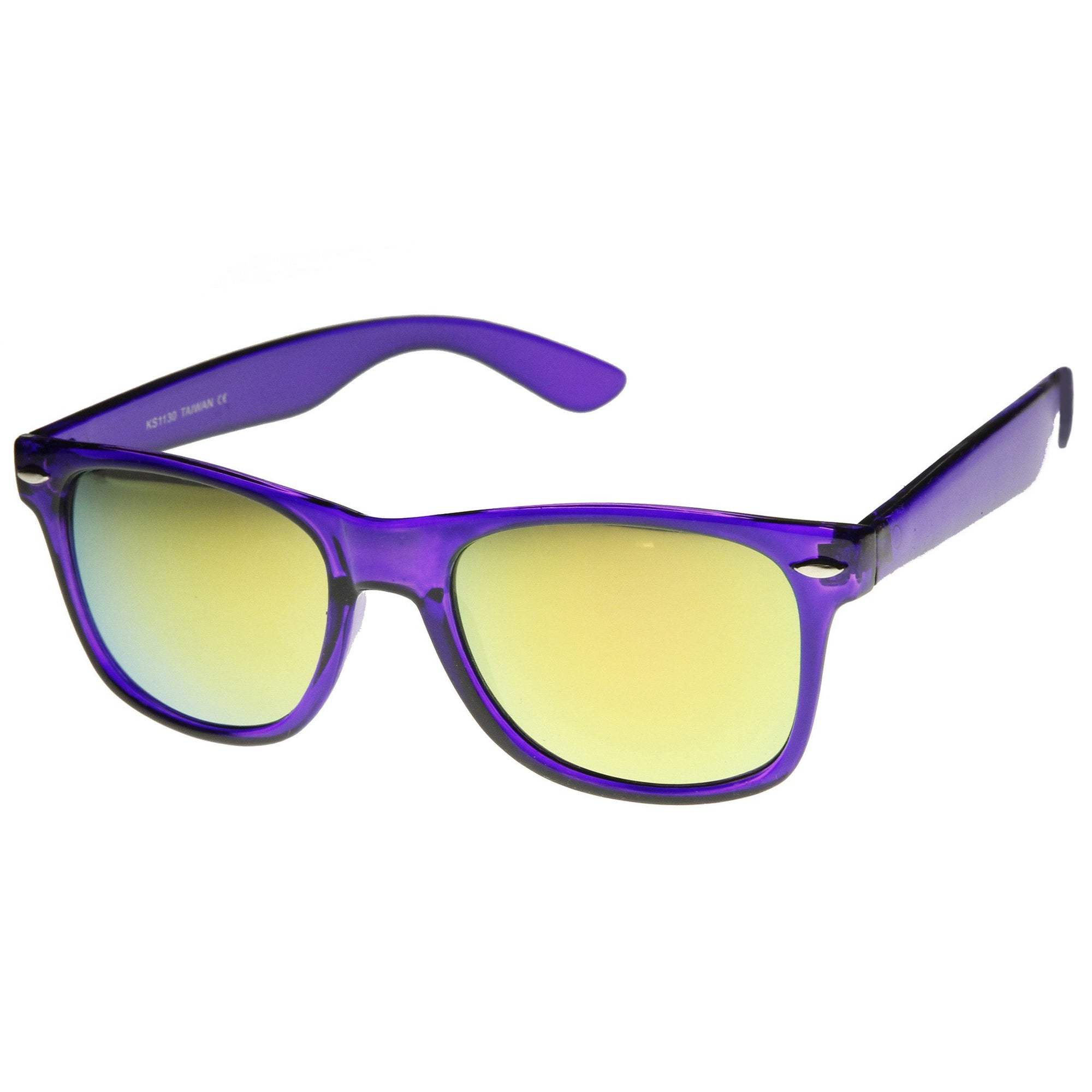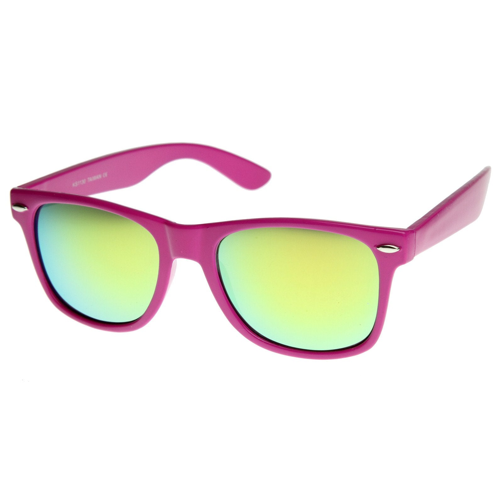 Bright and flashy color version of the timeless classic horned rim frame that features vibrant reflective color lenses. Made with an acetate based frame, metal hinges and color mirror polycarbonate UV protected lenses.