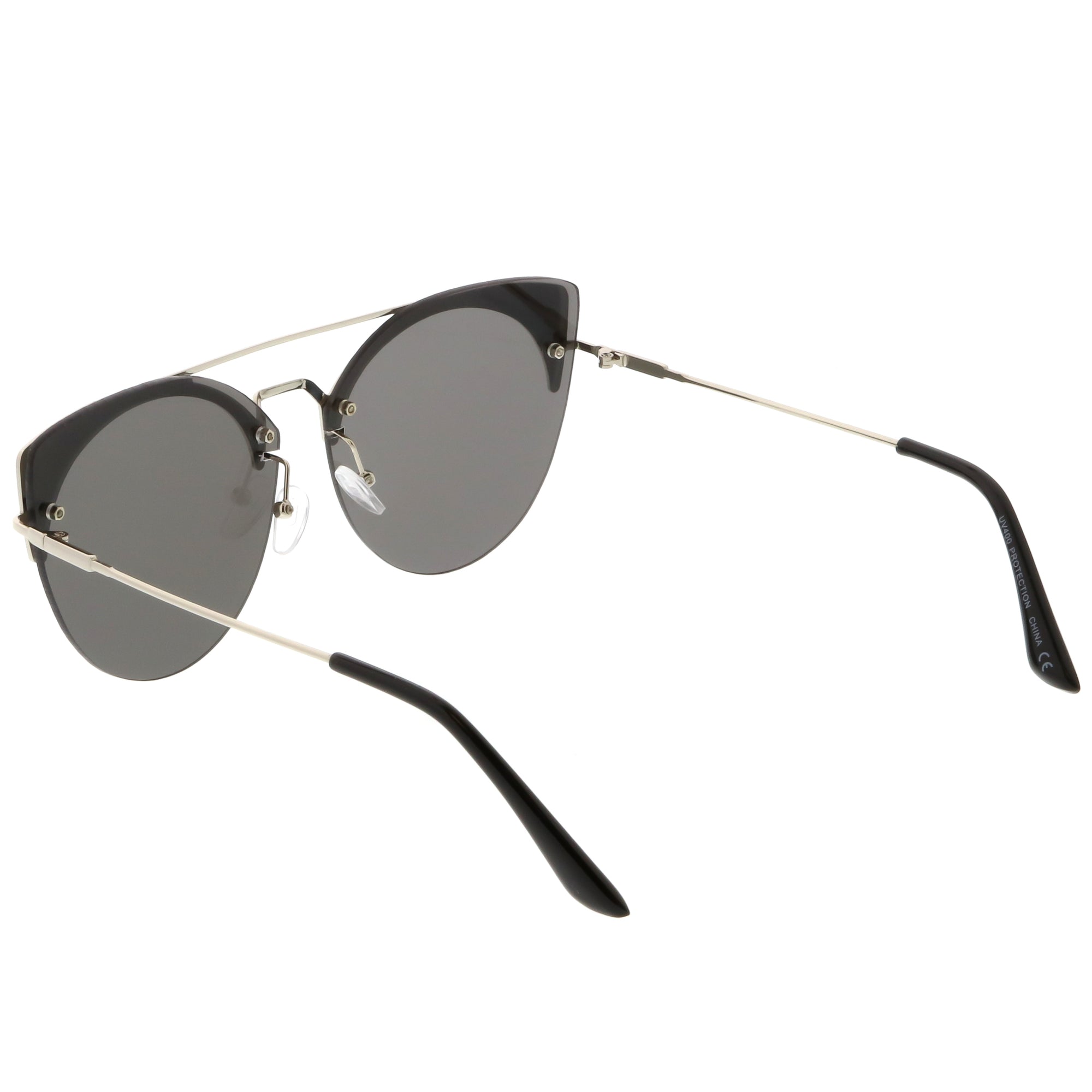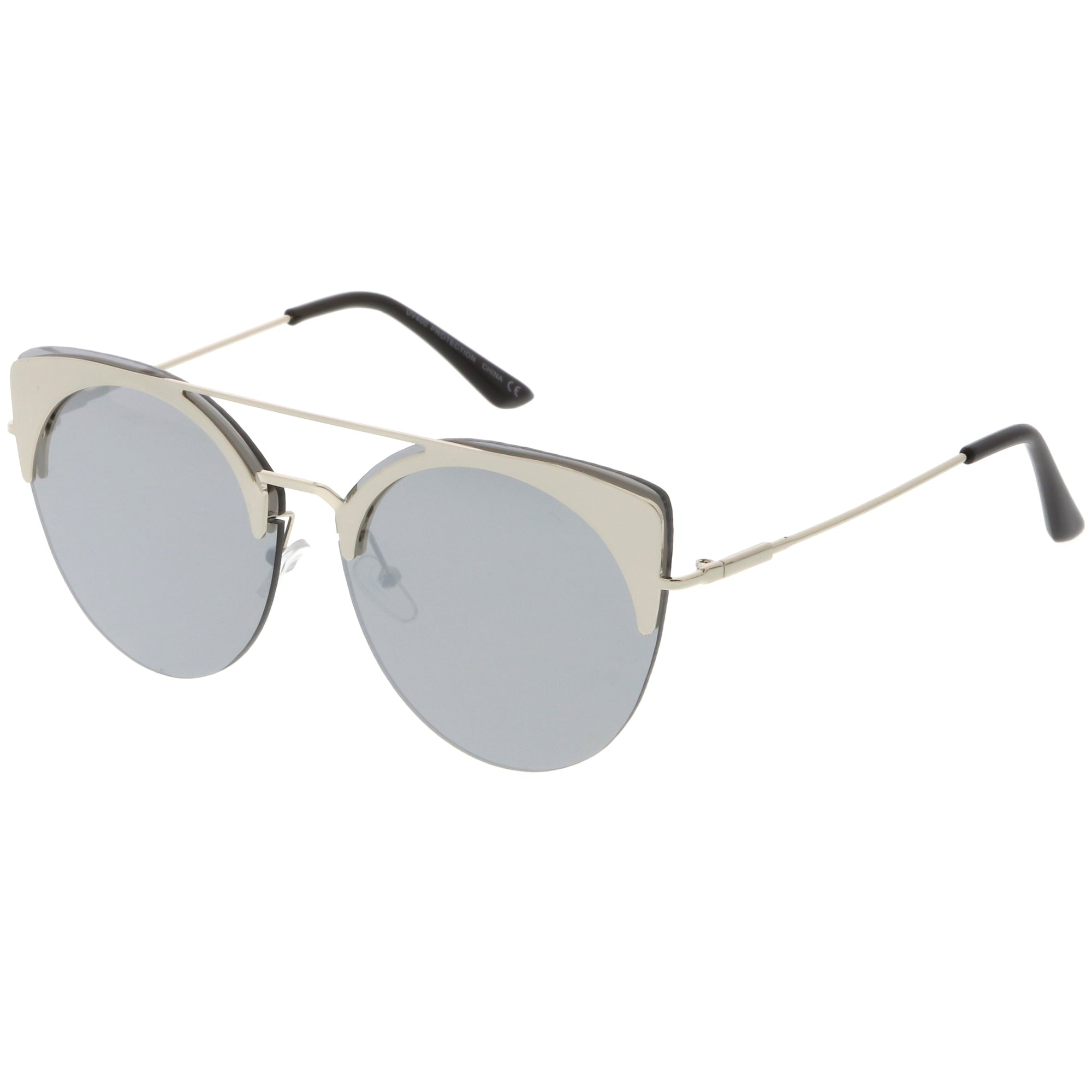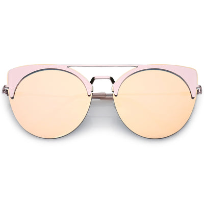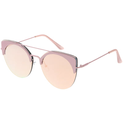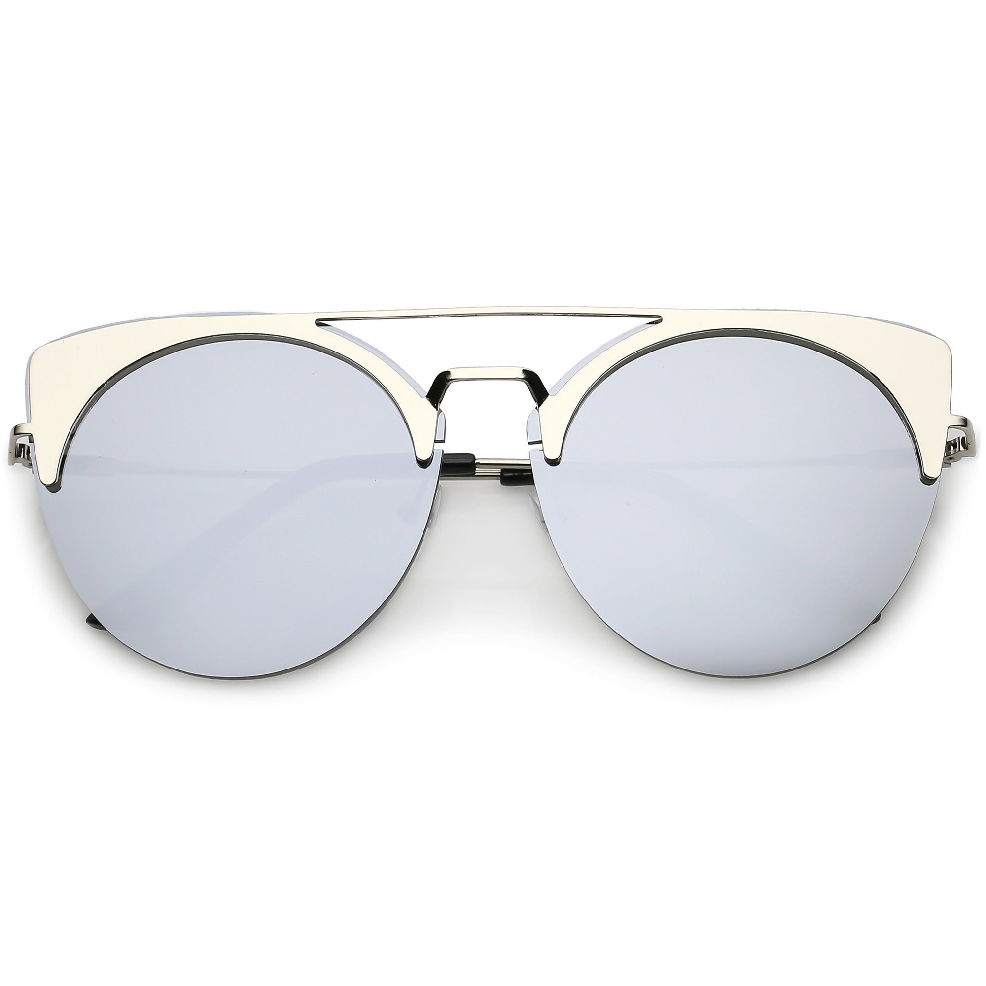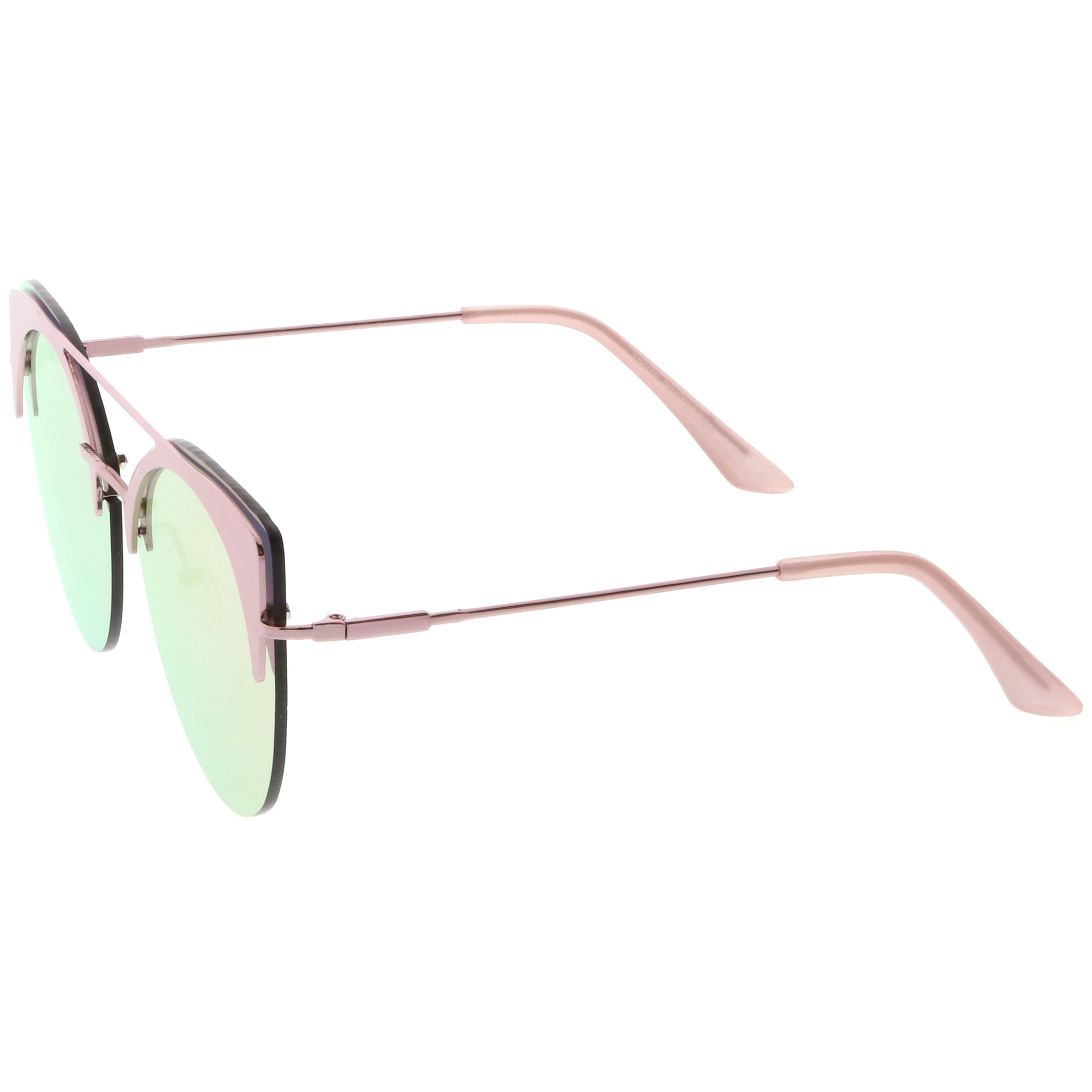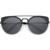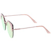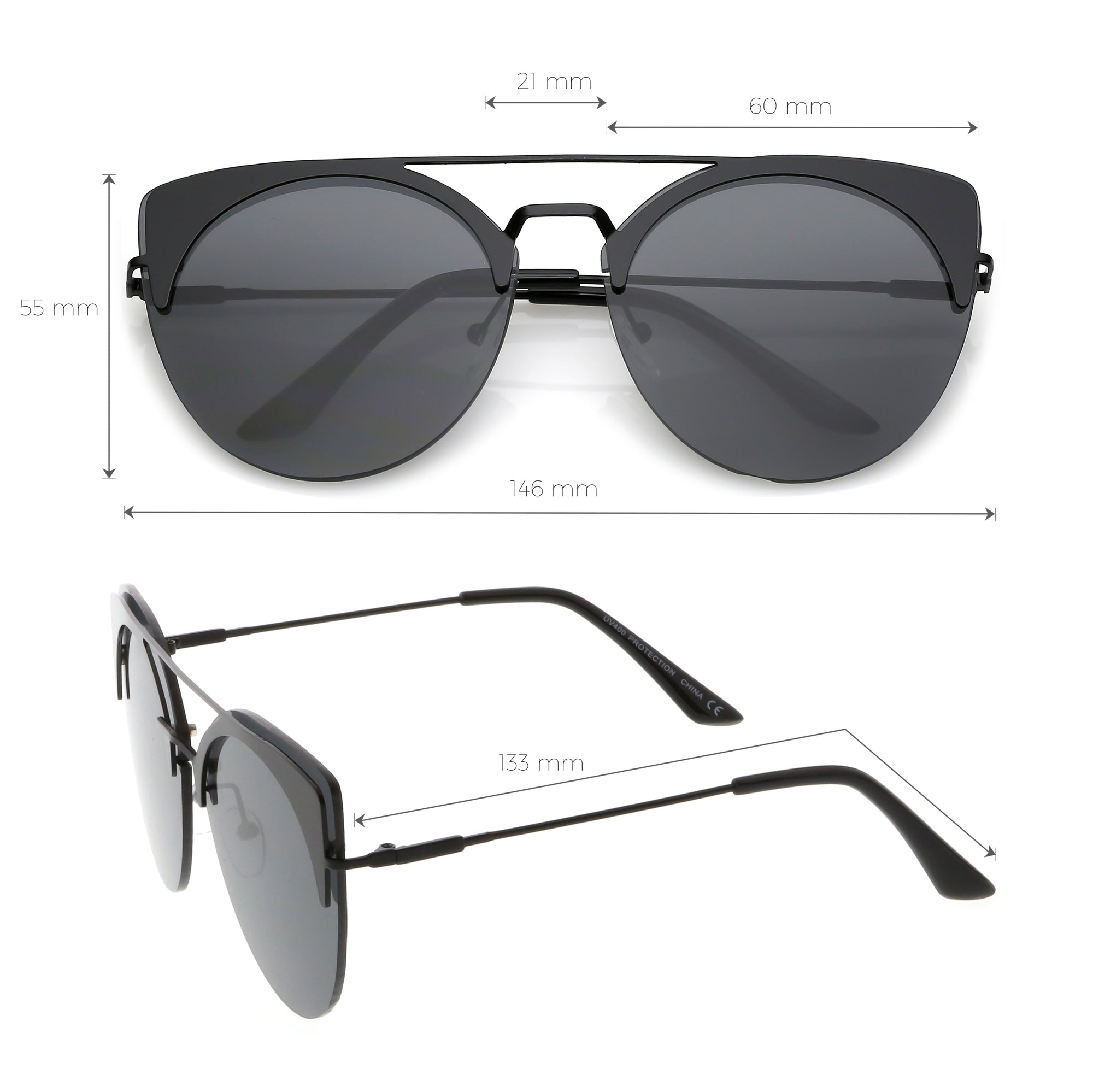 Make these oversize cat eye sunglasses your next go-to pair for any day wear or a fun outing with friends! These rimless cat eye sunglasses are simple yet jazzed up with its mirrored round flat lens and unique double crossbar with metal overlay on the lens. Complete with ultra slim arms, these sunglasses are sure to be a favorite. Made with a metal based frame, adjustable English style nose pieces, metal hinges, and 100% UV protected lenses.