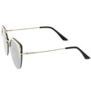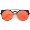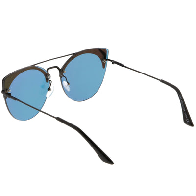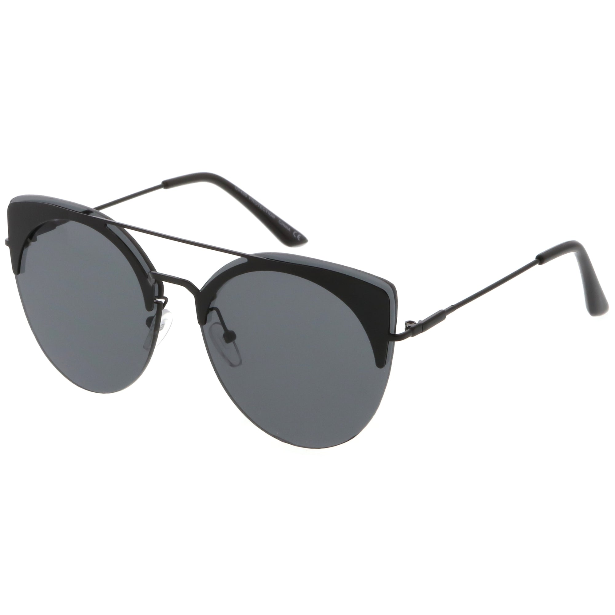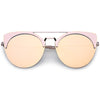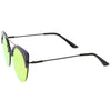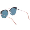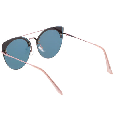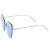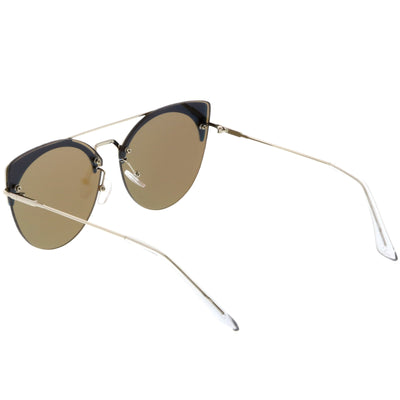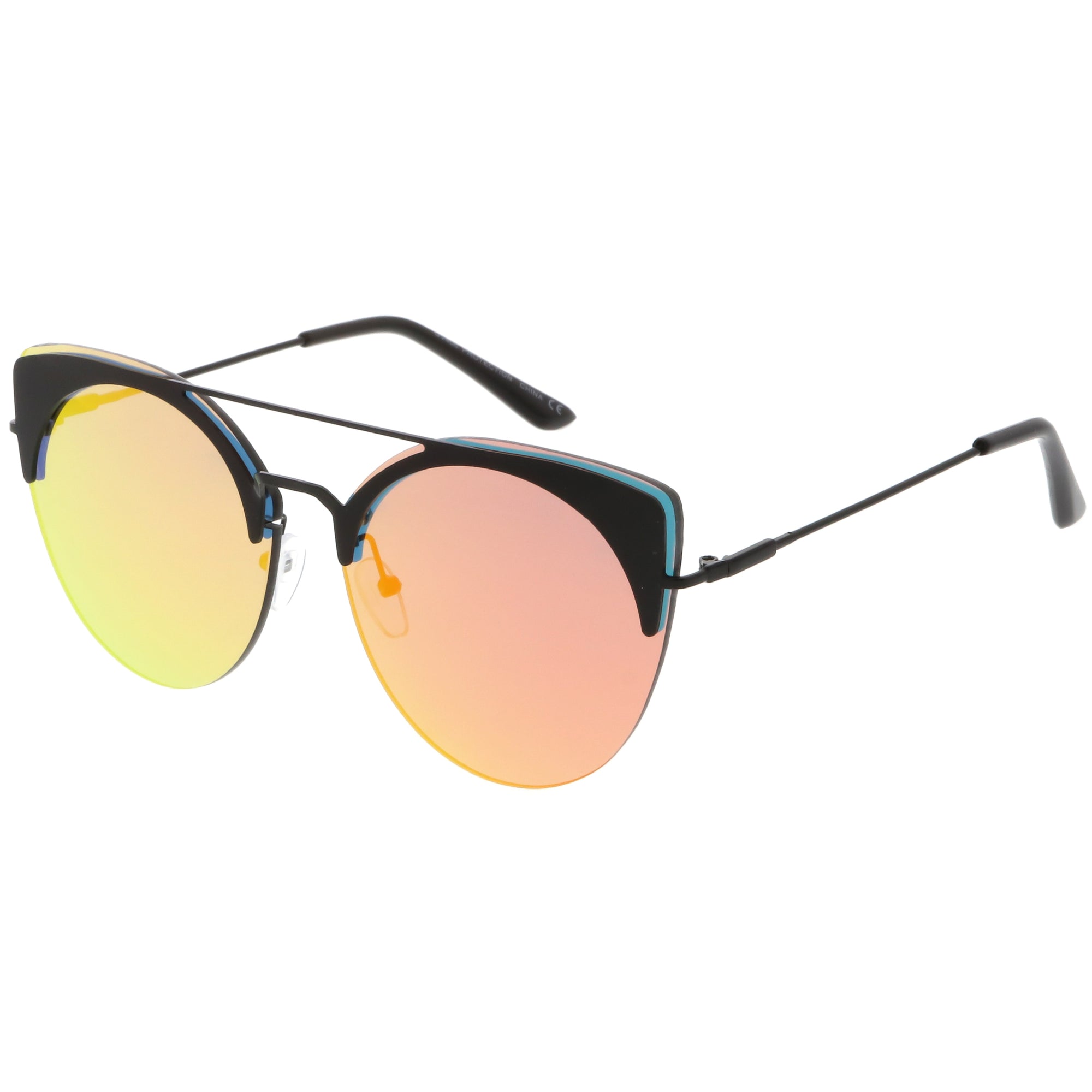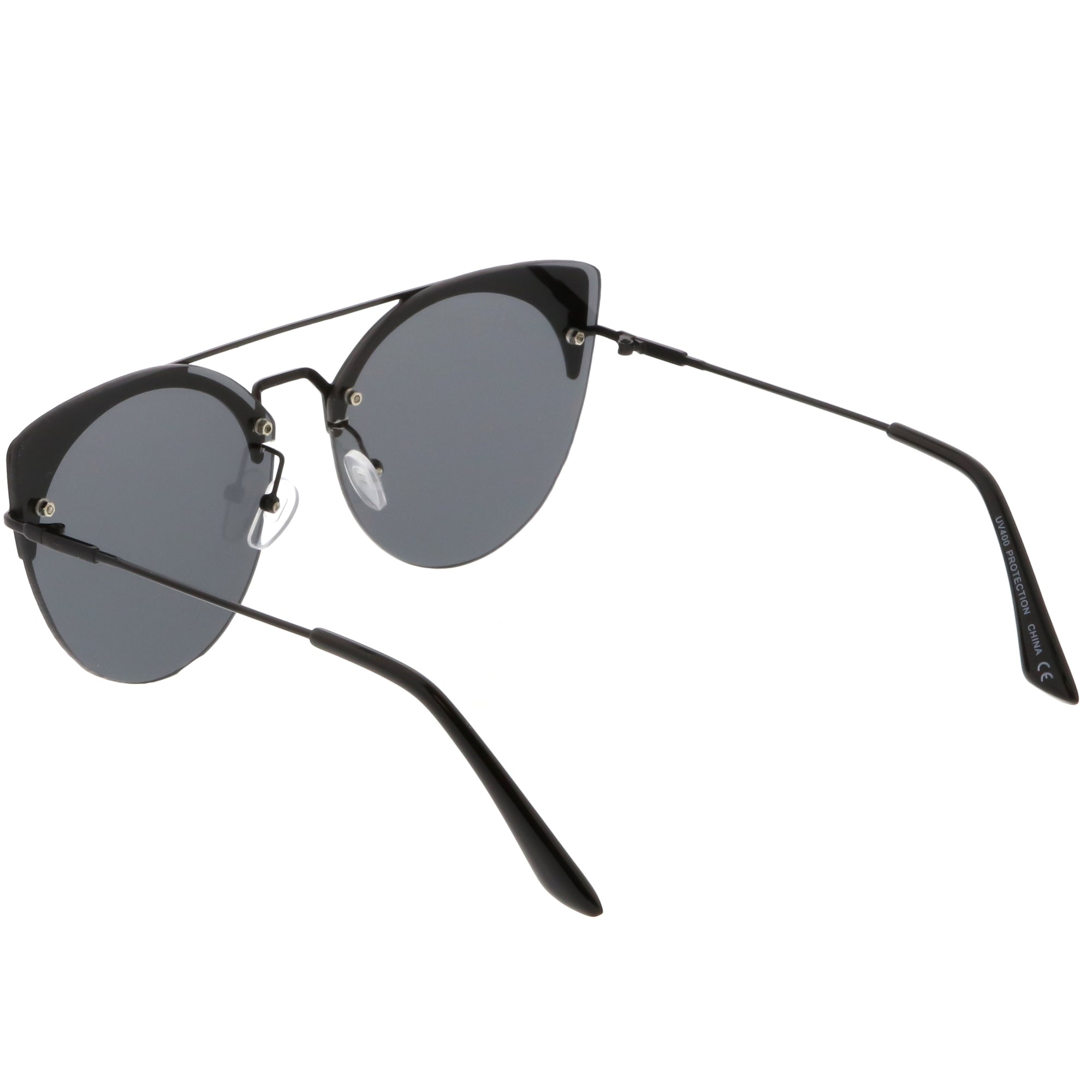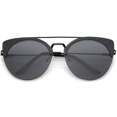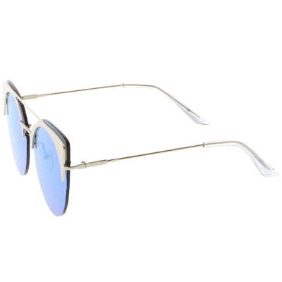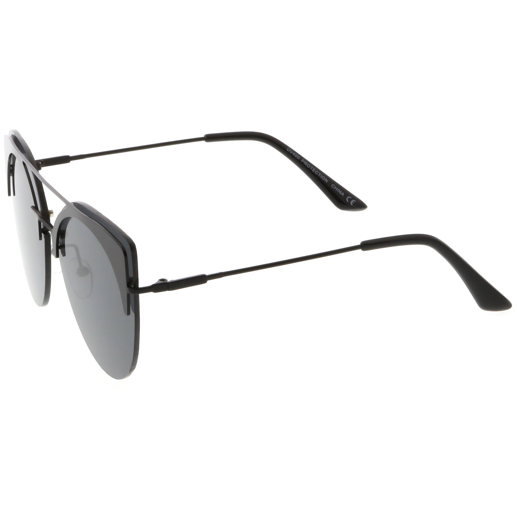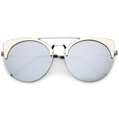 Make these oversize cat eye sunglasses your next go-to pair for any day wear or a fun outing with friends! These rimless cat eye sunglasses are simple yet jazzed up with its mirrored round flat lens and unique double crossbar with metal overlay on the lens. Complete with ultra slim arms, these sunglasses are sure to be a favorite. Made with a metal based frame, adjustable English style nose pieces, metal hinges, and 100% UV protected lenses.