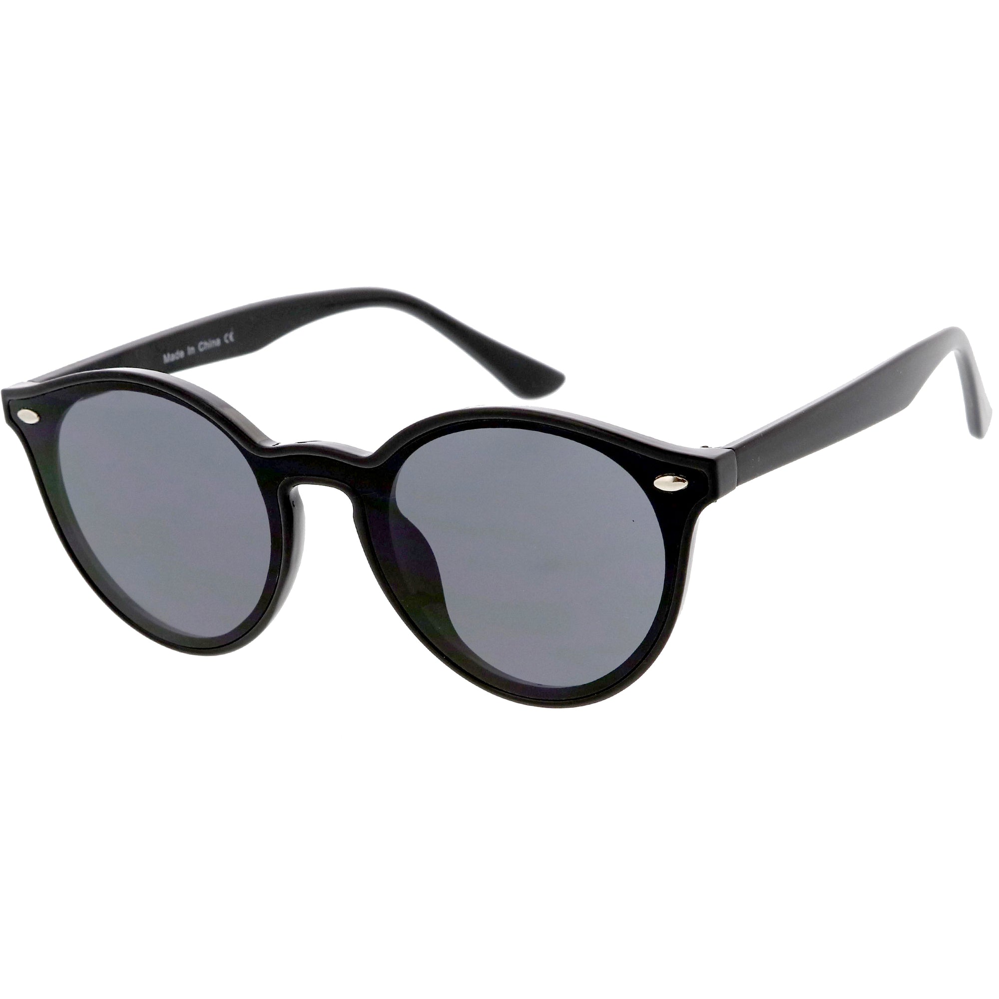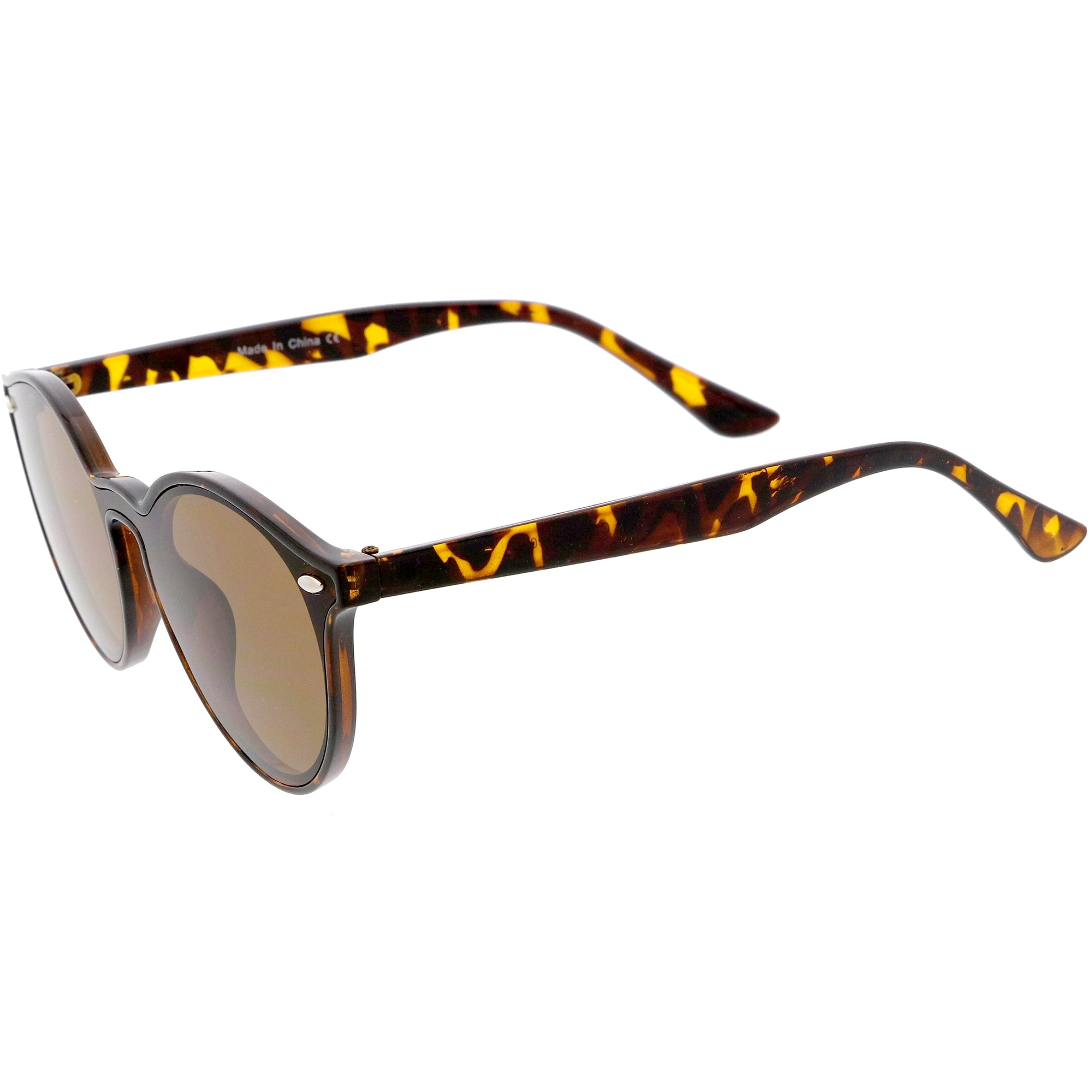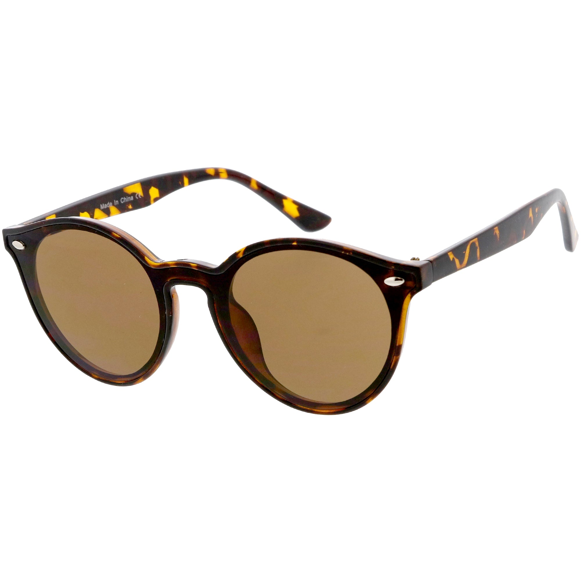 • Designed with a classic frame shape, these round sunglasses feature a subtle horn rimmed design and high sitting arms. A flush mono lens in mirrored, color tinted, and neutral hues adds to this style's sleek look, while metal rivet accents adorn the front frame giving it a sophisticated finish. Complete with a classic keyhole nose bridge, these horn rimmed round sunglasses are a must-have accessory. Made with a plastic based frame, reinforced metal hinges, and 100% UV protected lenses.
