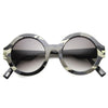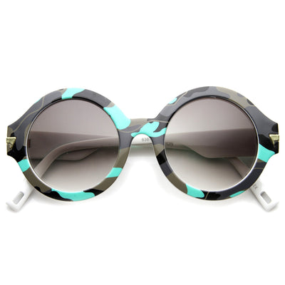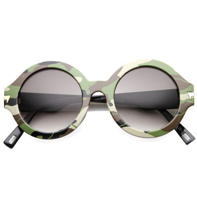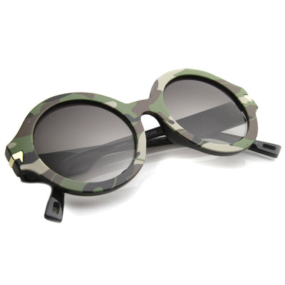 Bold round horned rimmed frames contrast a retro design with an edgy textured camo print. Eye catching camouflage patterns and accented metal arm details provide a splash of style sure to set any outfit apart. Made with a plastic based frame, metal hinges and clear UV protected polycarbonate lens.