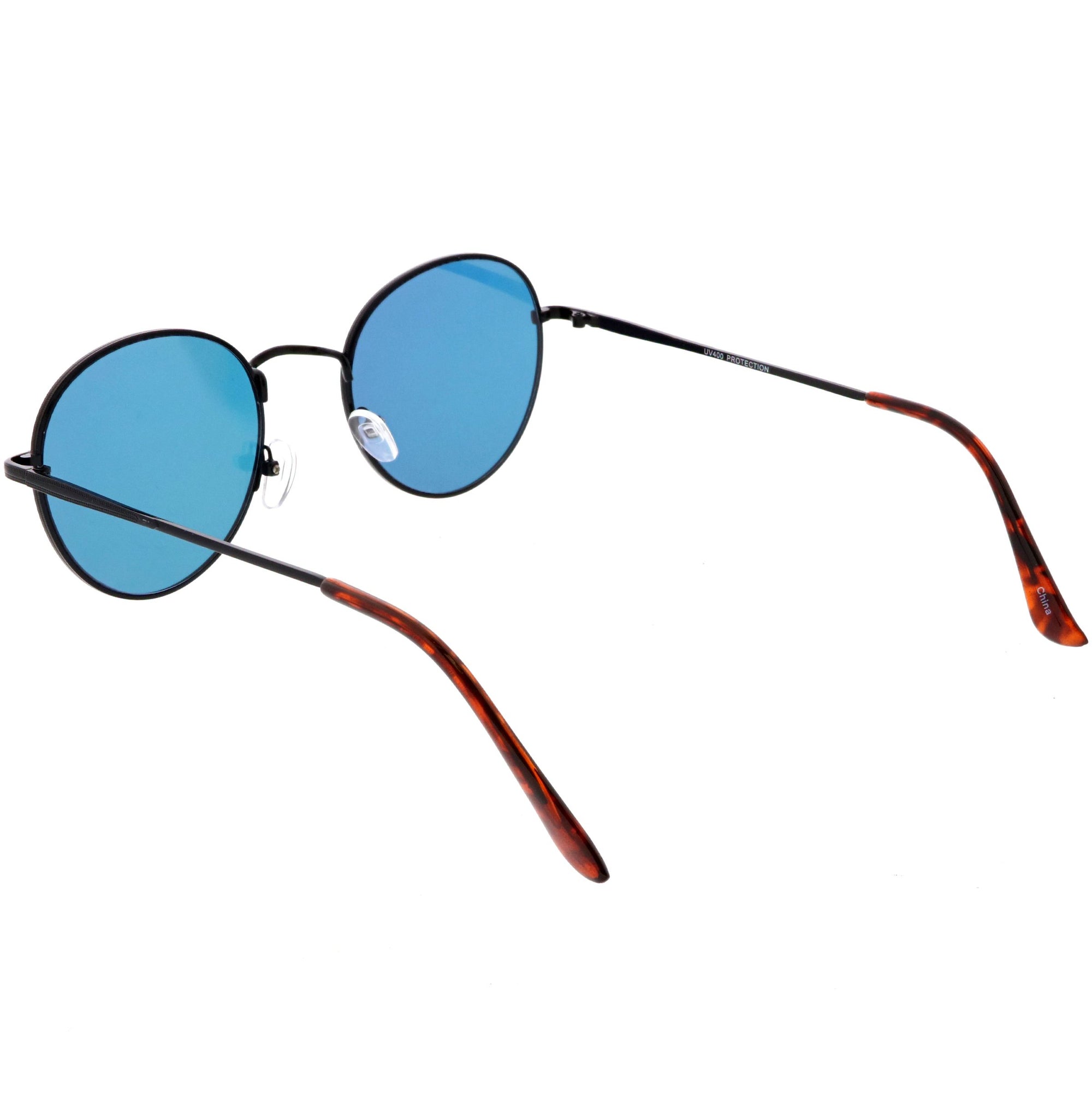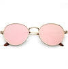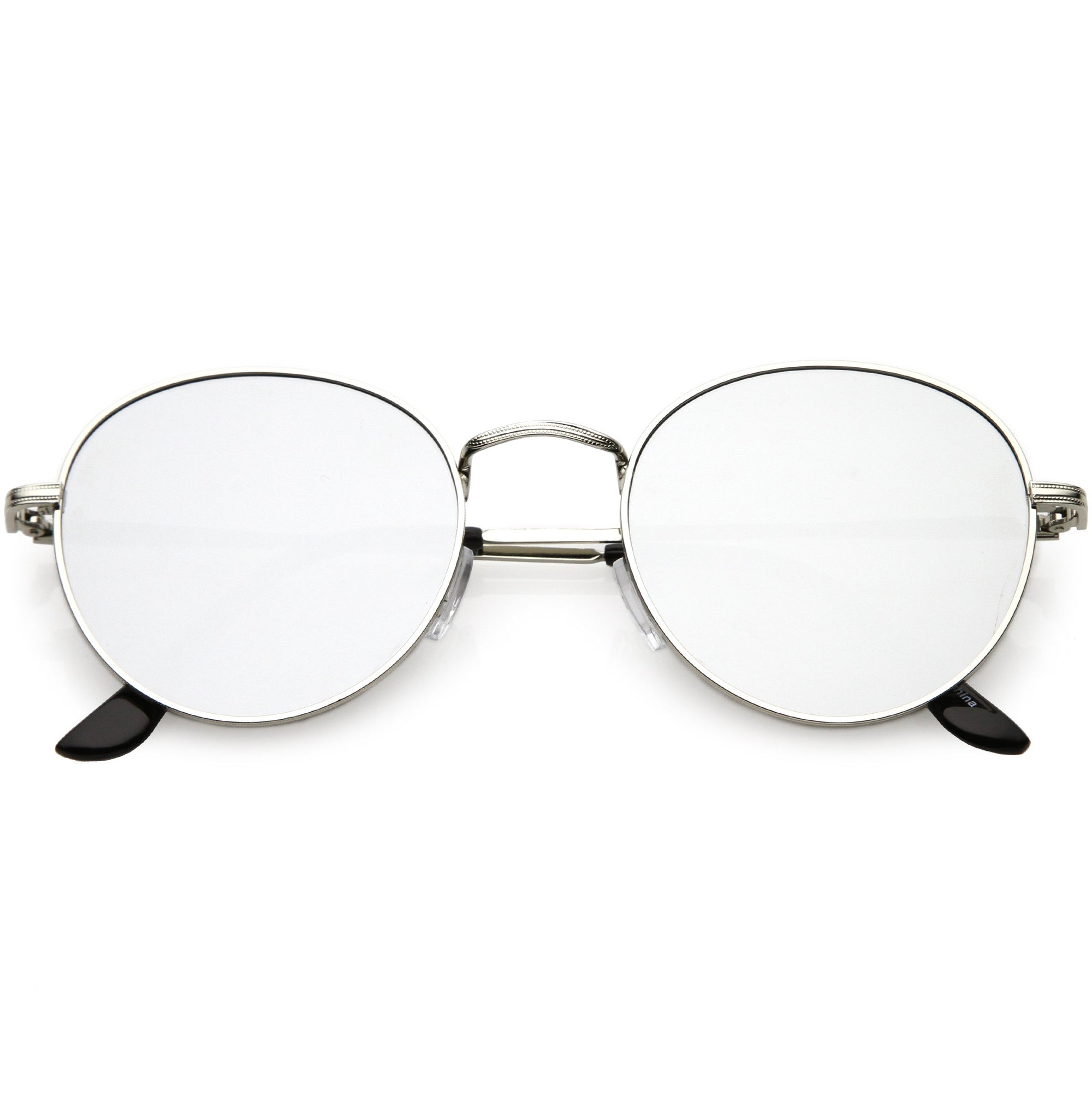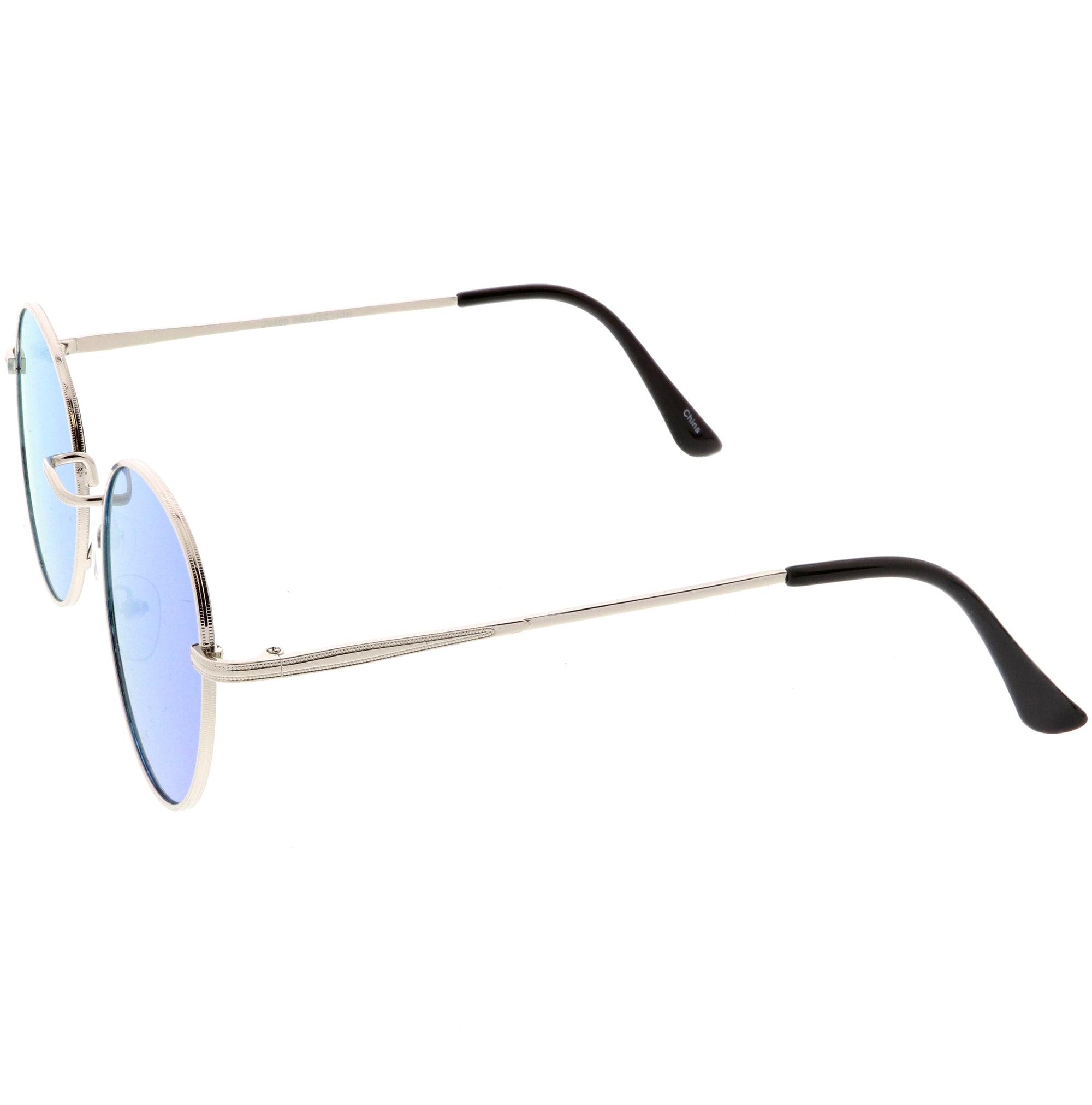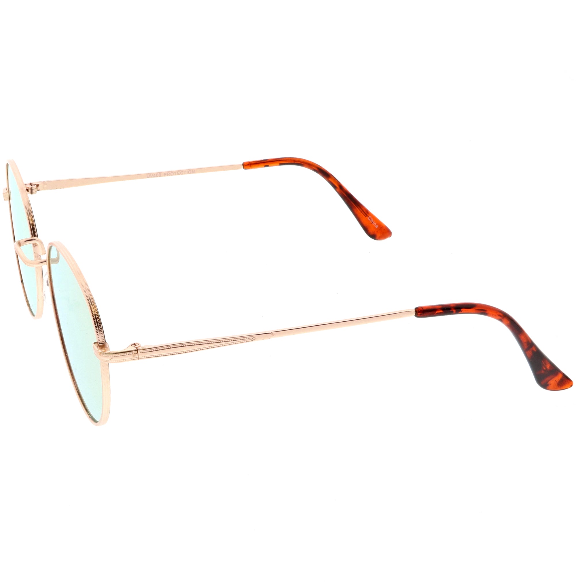 This classic style is perfect to pair with everyday wear. The round color mirrored flat lenses allow you to add a touch of color to your accessory closet. The slim temples and engraved metal detail gives this style a sleek look. Finished with a metal based frame, adjustable English style nose pieces, metal hinges, and 100% UV protected lenses.