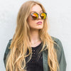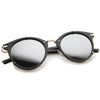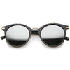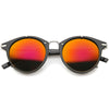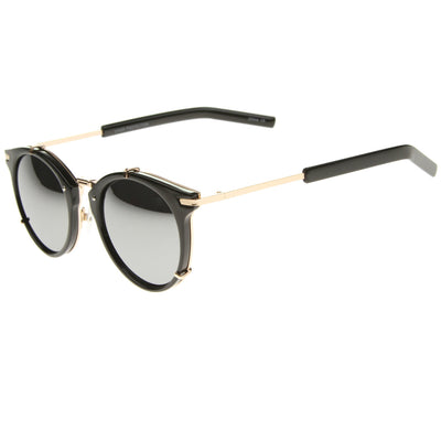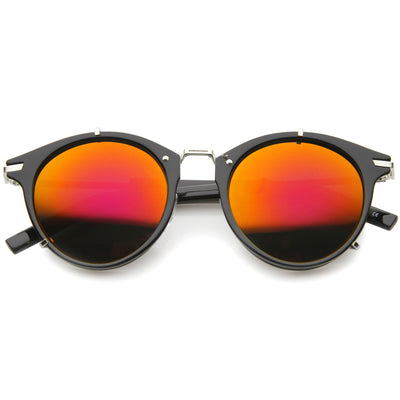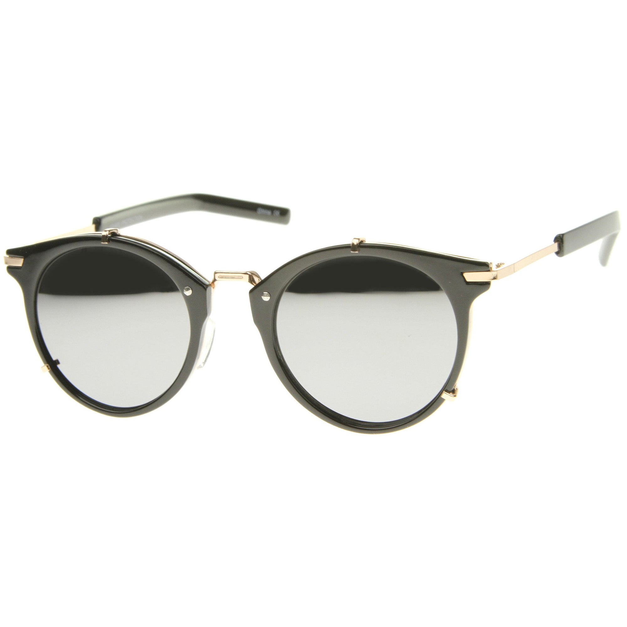 - Round p-3 shaped frame that features a full metal reinforced frame and an eye-catching color mirrored lens. The reinforced metal frame gives it the appearance of a rear clip-on lens giving them a unique and stylish look this season. Made with a plastic and metal based frame, metal hinges and color mirrored UV400 protected lens.