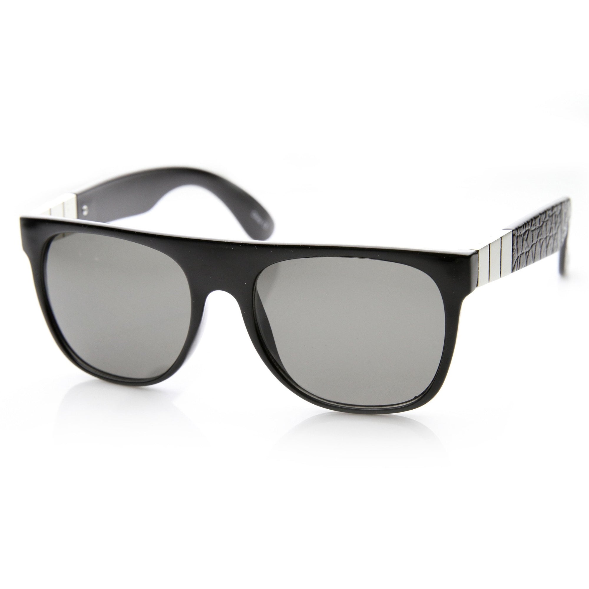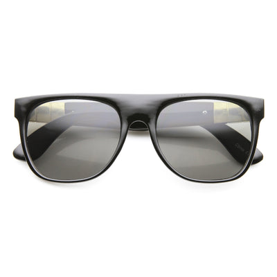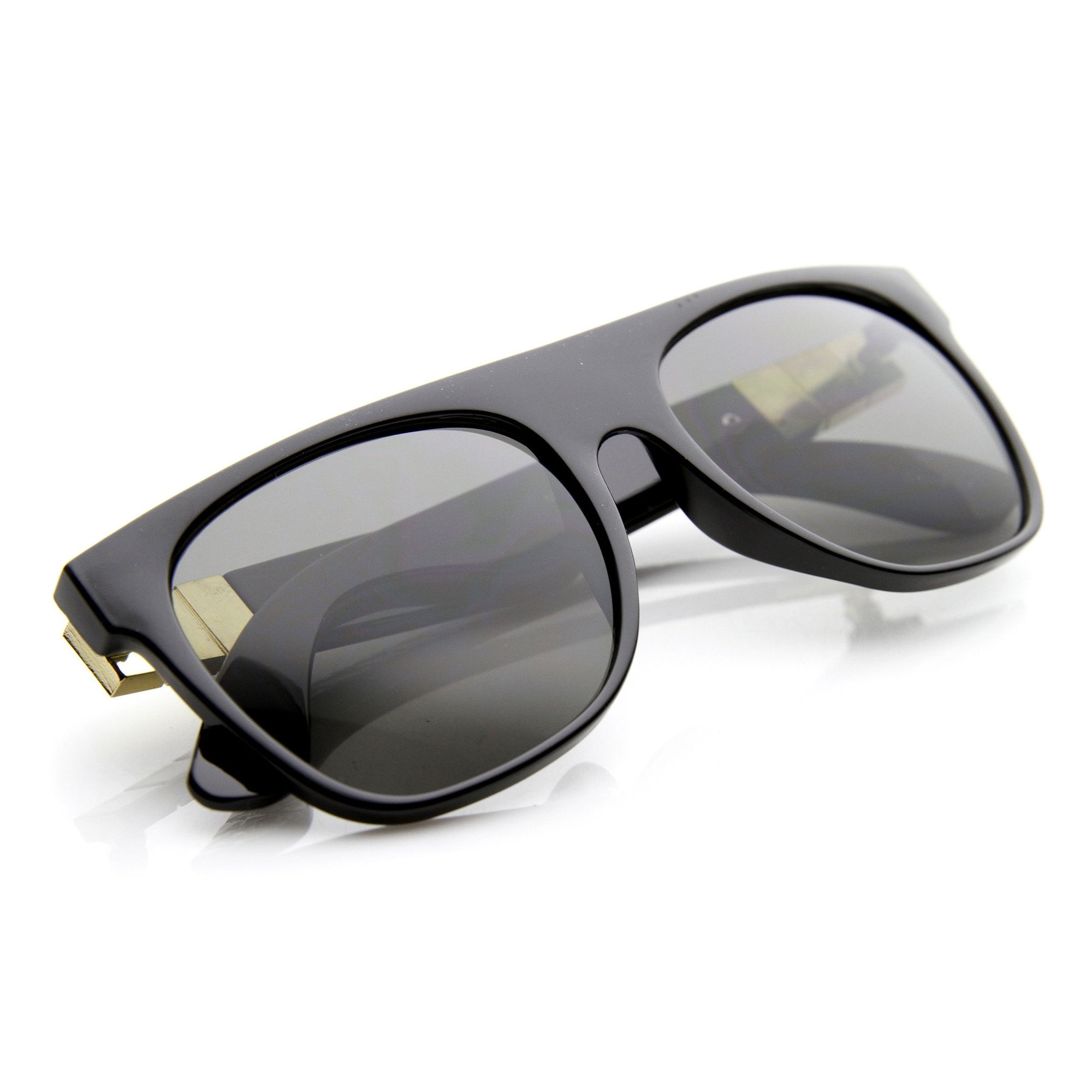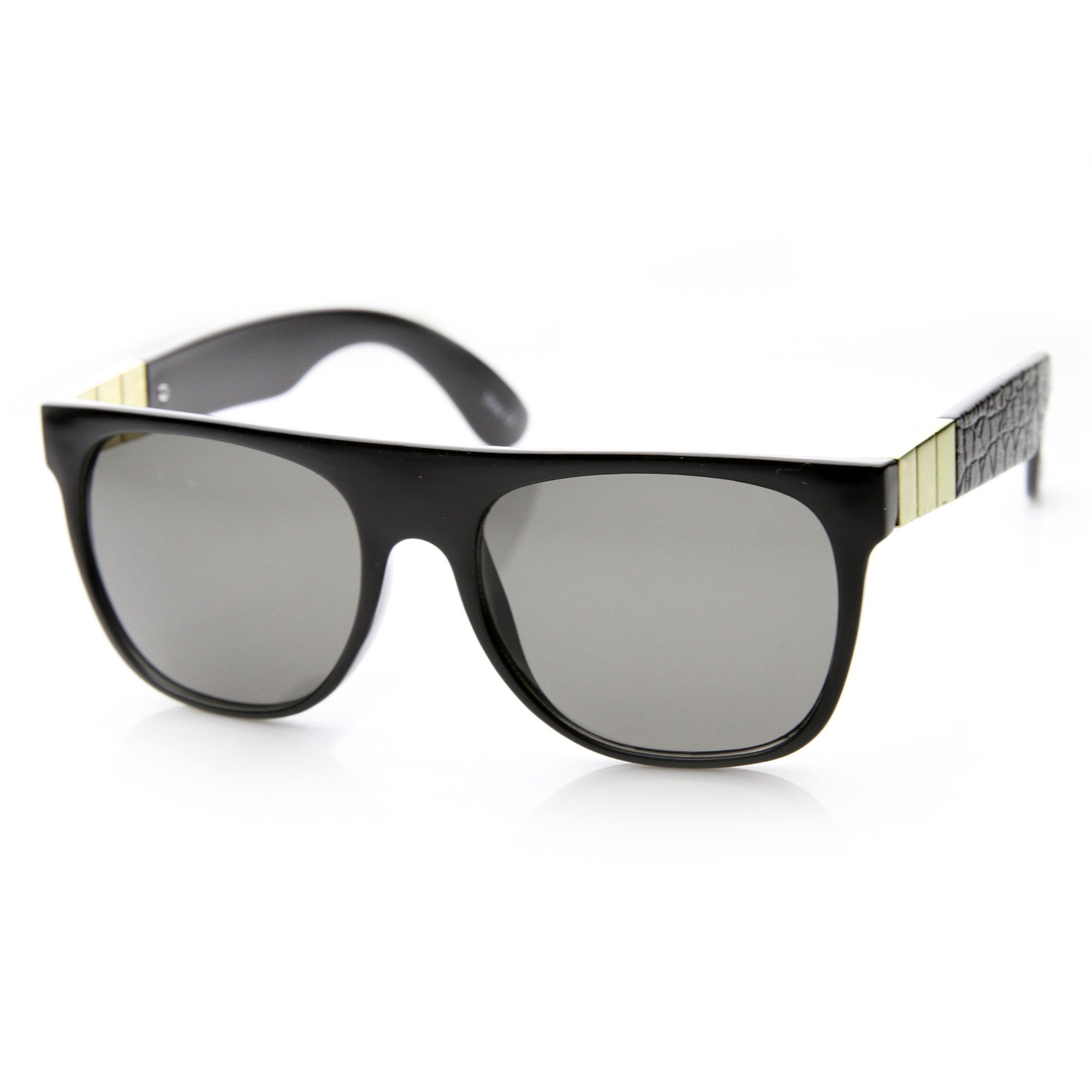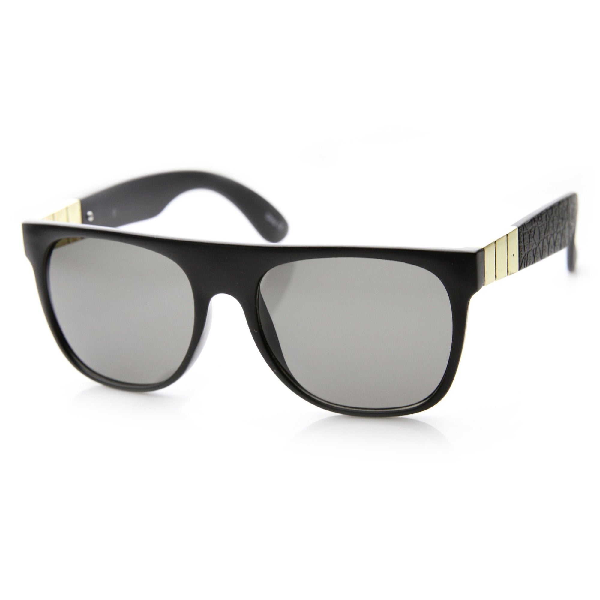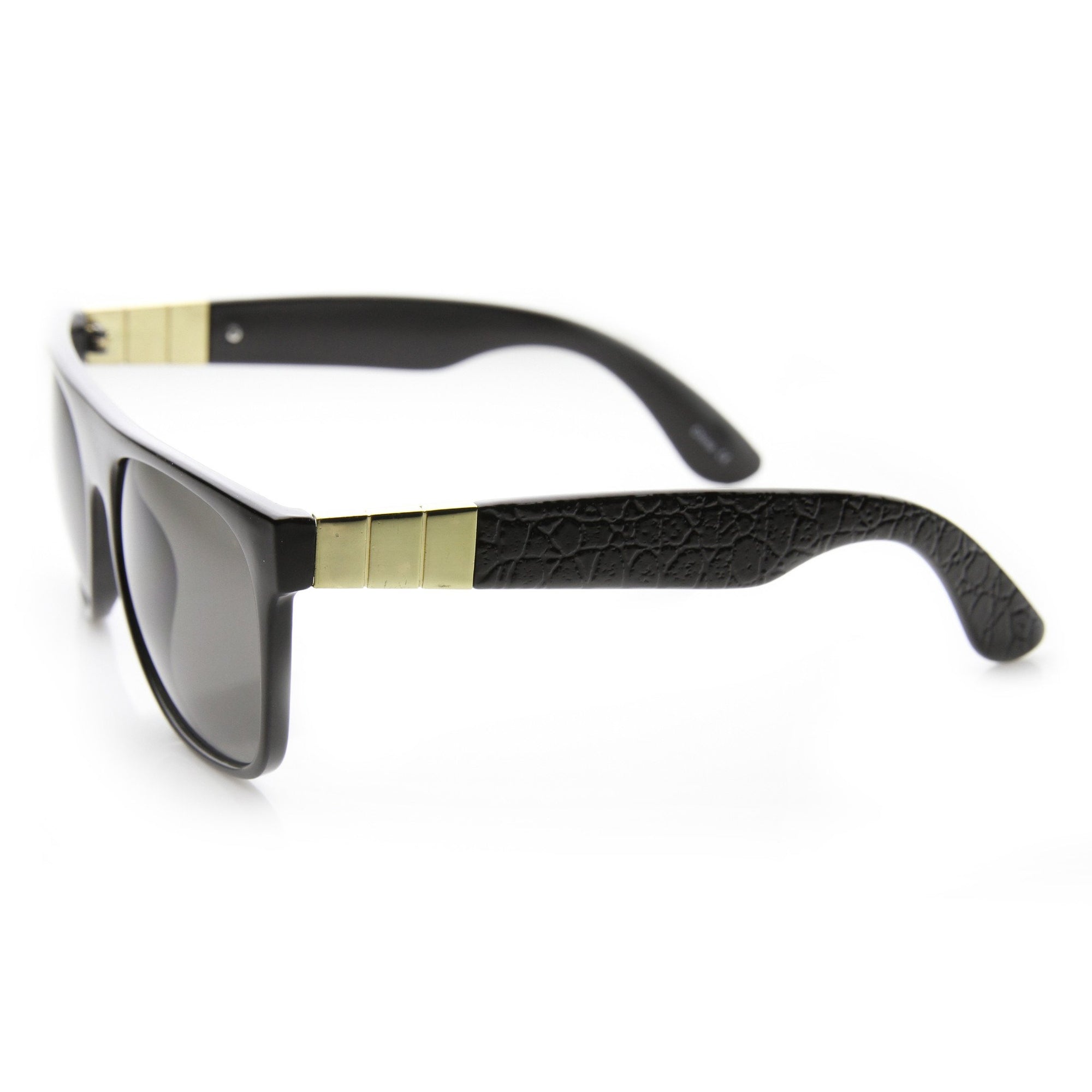 Modified version of the iconic horned rim frame that features detailed faux leather temples with elegant gold accents. This is a very unique version of our flat top collection. Flat tops are quickly becoming one of our most popular styles and is a must have for any flat top collector. Made with a plastic based frame, metal hinges, and 100% UV protected lens.
