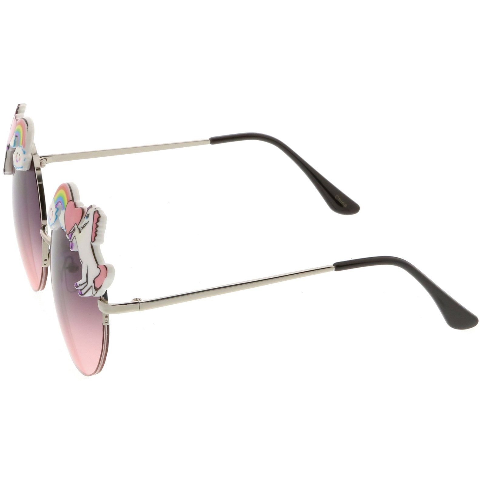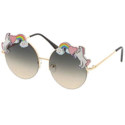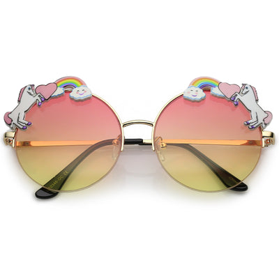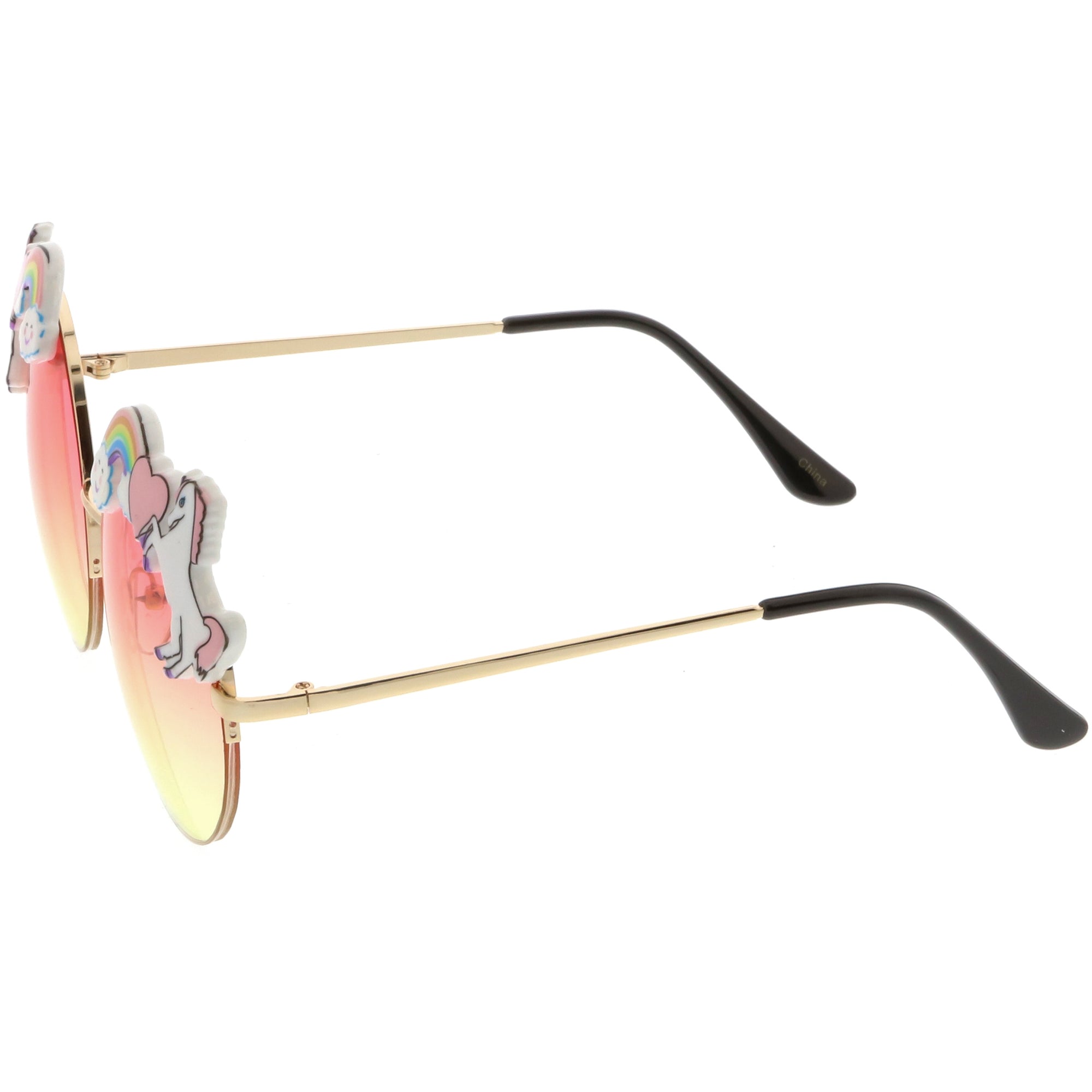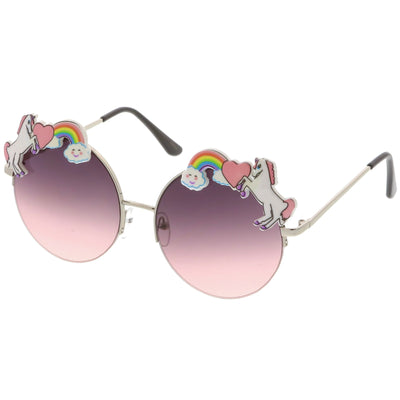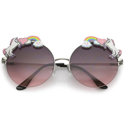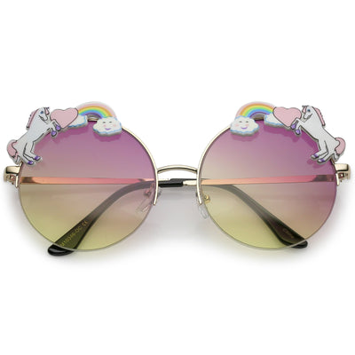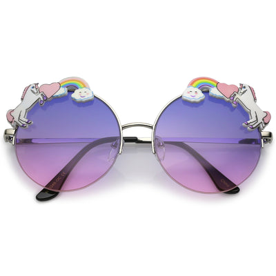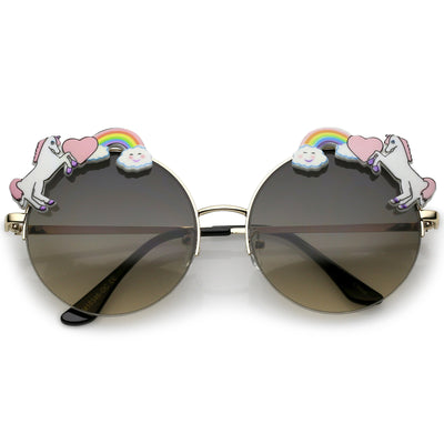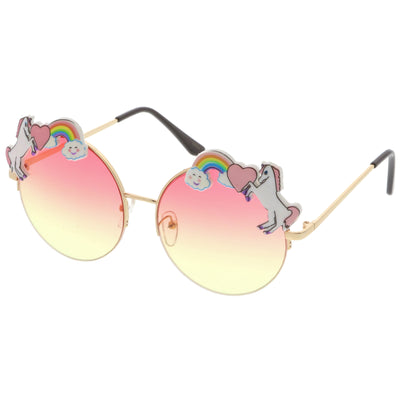 Totally cute and fun, these metal round sunglasses feature a semi rimless design with gradient round lenses in a variety of colors. Accented with a unicorn, rainbow, and heart designs and slim metal arms, these whimsical sunglasses are great for music festivals and parties. Made with a metal based frame, adjustable English style nose pieces, metal hinges, and 100% UV protected lenses.