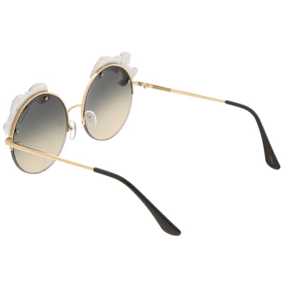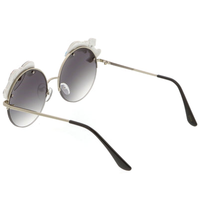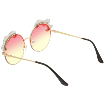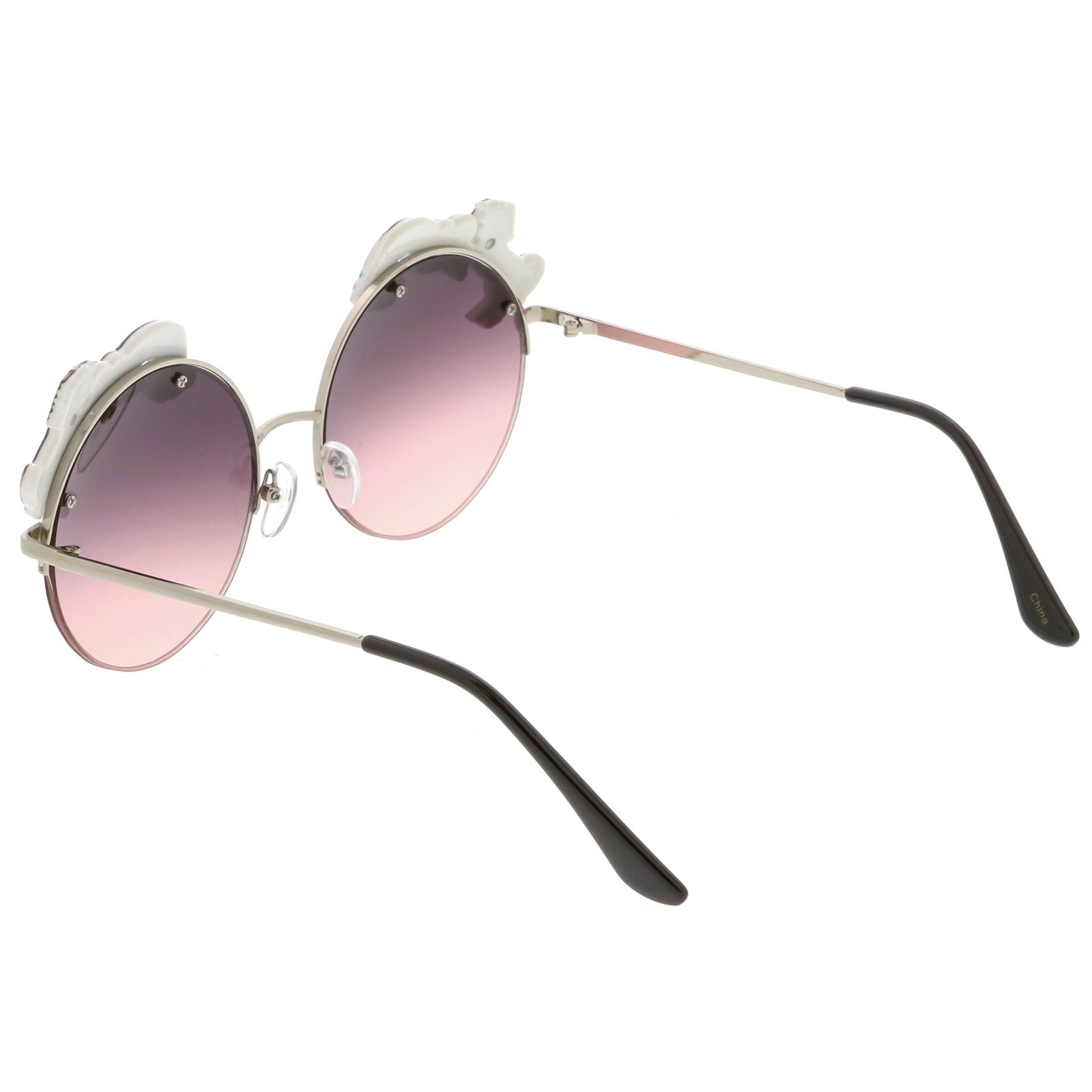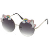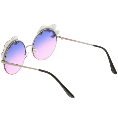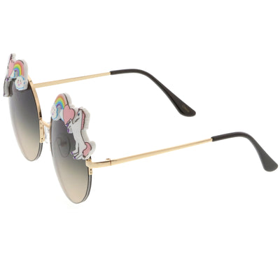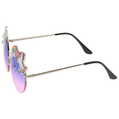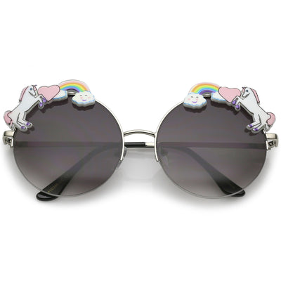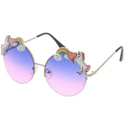 Totally cute and fun, these metal round sunglasses feature a semi rimless design with gradient round lenses in a variety of colors. Accented with a unicorn, rainbow, and heart designs and slim metal arms, these whimsical sunglasses are great for music festivals and parties. Made with a metal based frame, adjustable English style nose pieces, metal hinges, and 100% UV protected lenses.