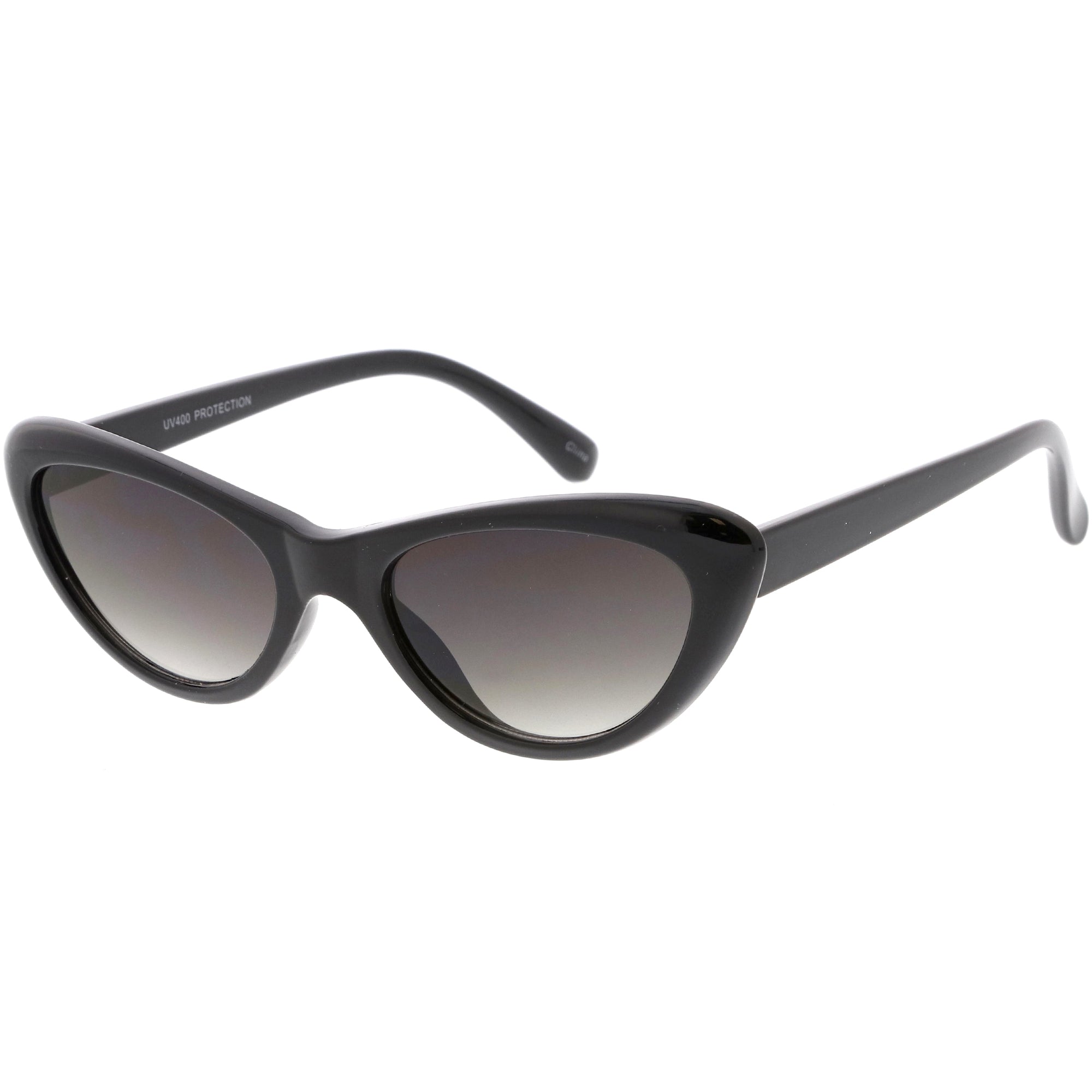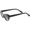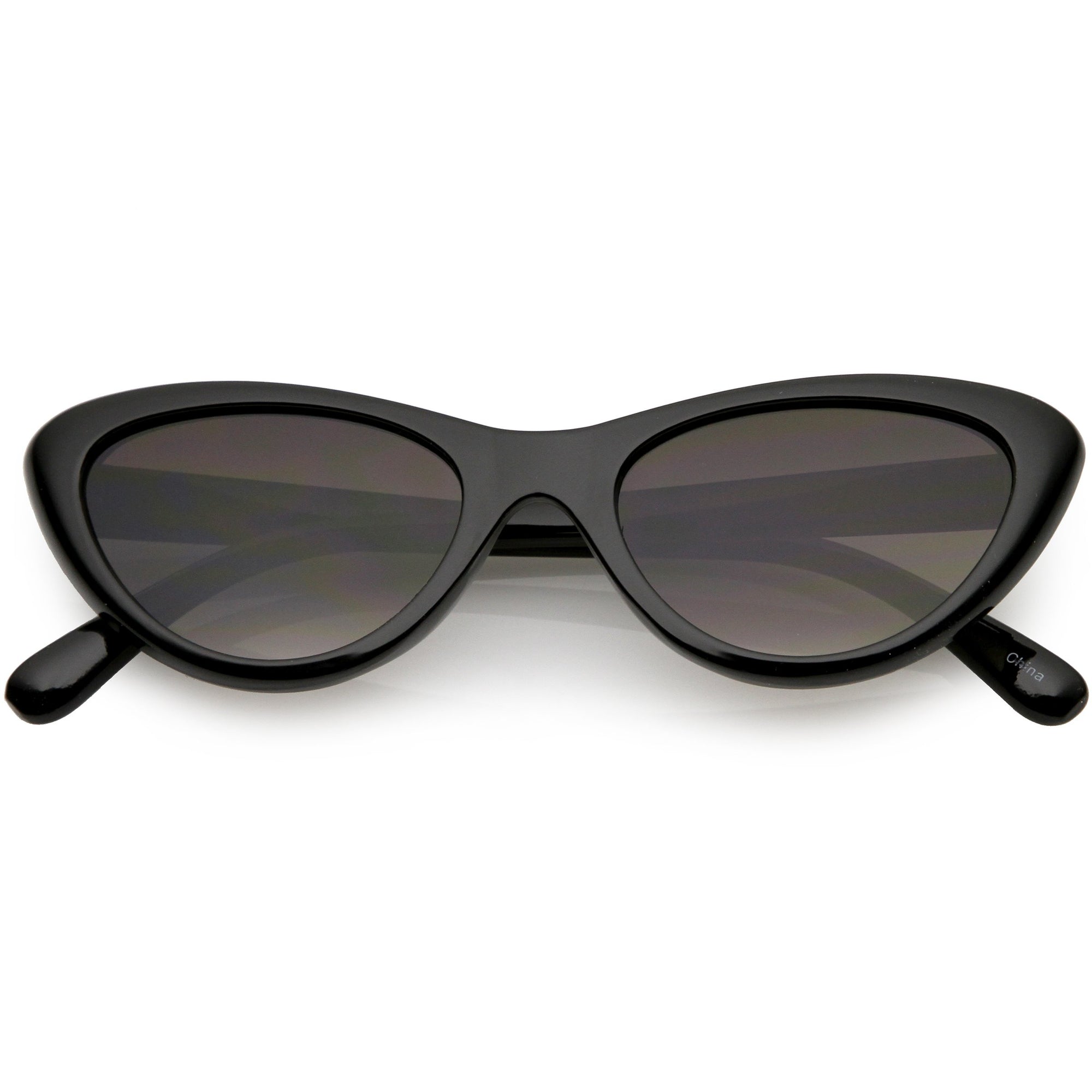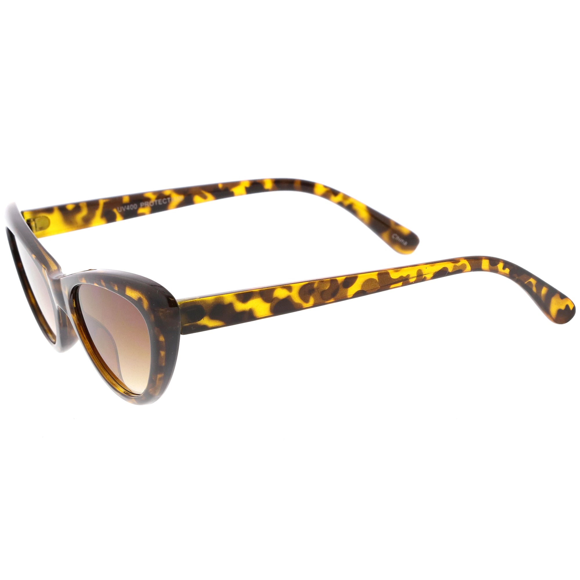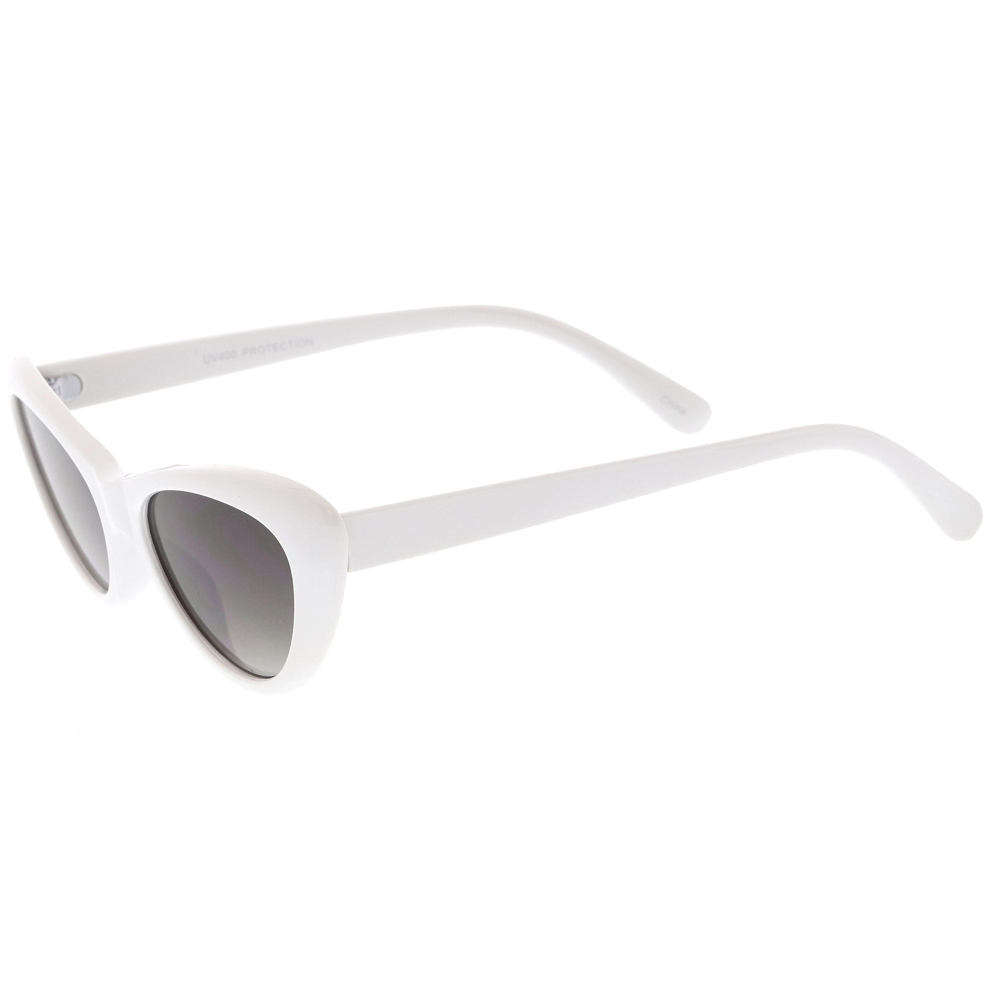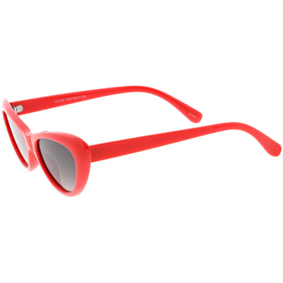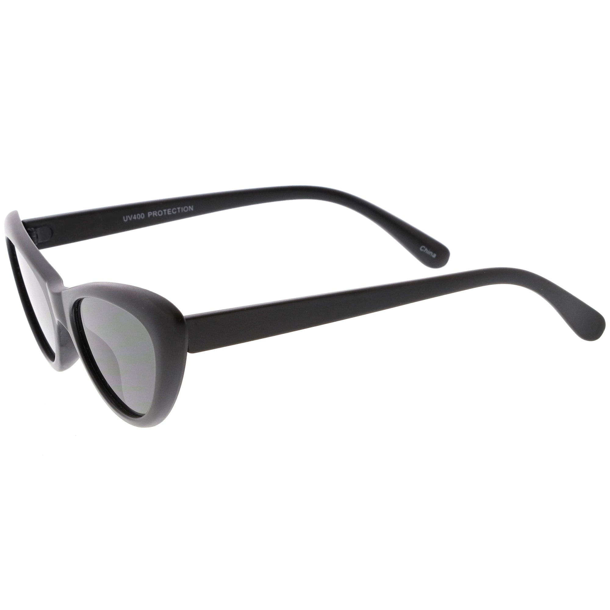 The perfect combination of retro and stylish, these small cat eye sunglasses are crafted with a rounded edge frame with high sitting arms. Neutral colored lenses finish off these cat eye sunglasses making them great for accessorizing a vintage inspired outfit. Made with a plastic based frame, reinforced metal hinges, and 100% UV protected lenses.