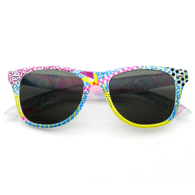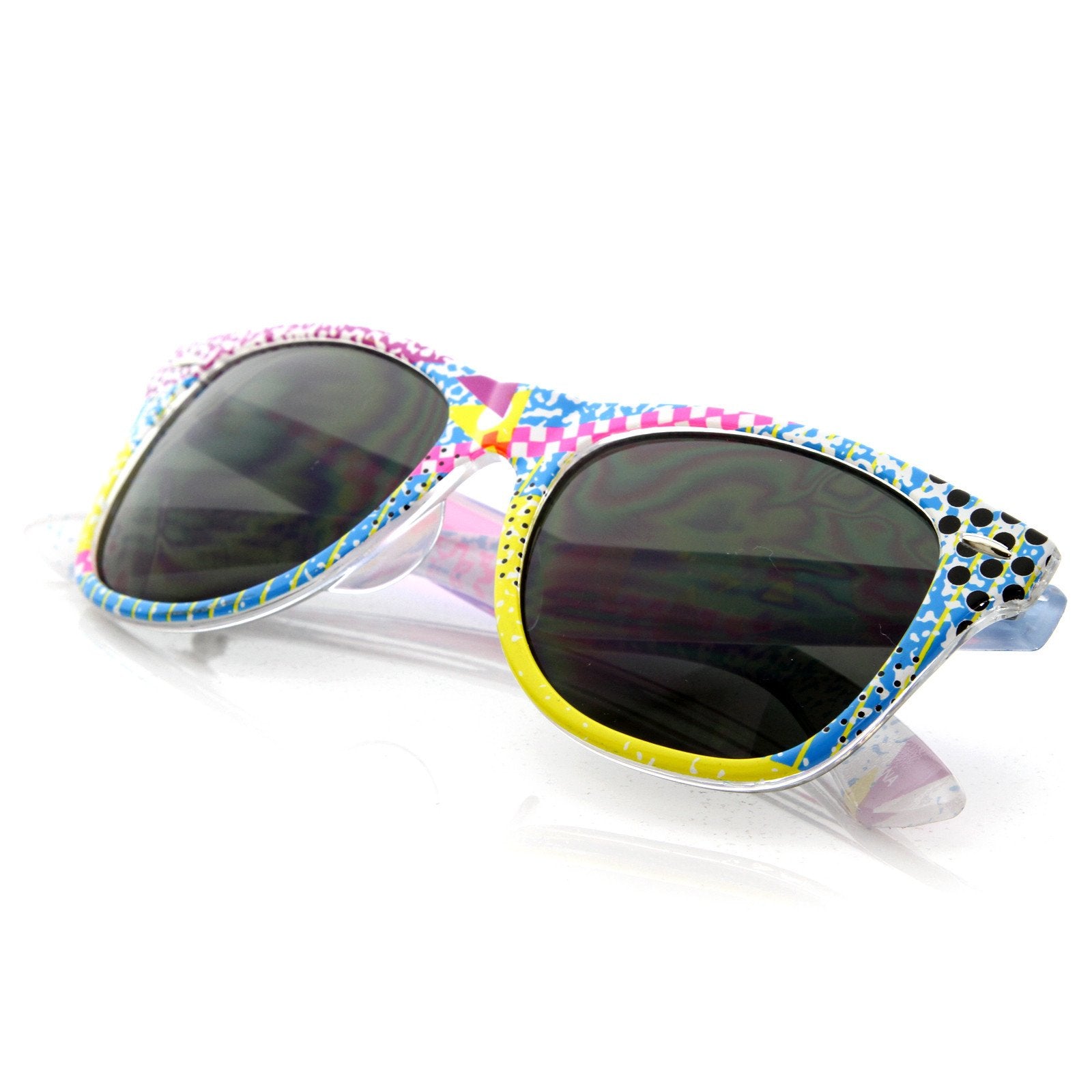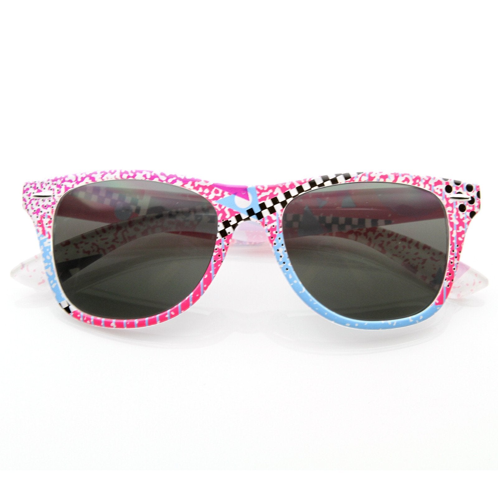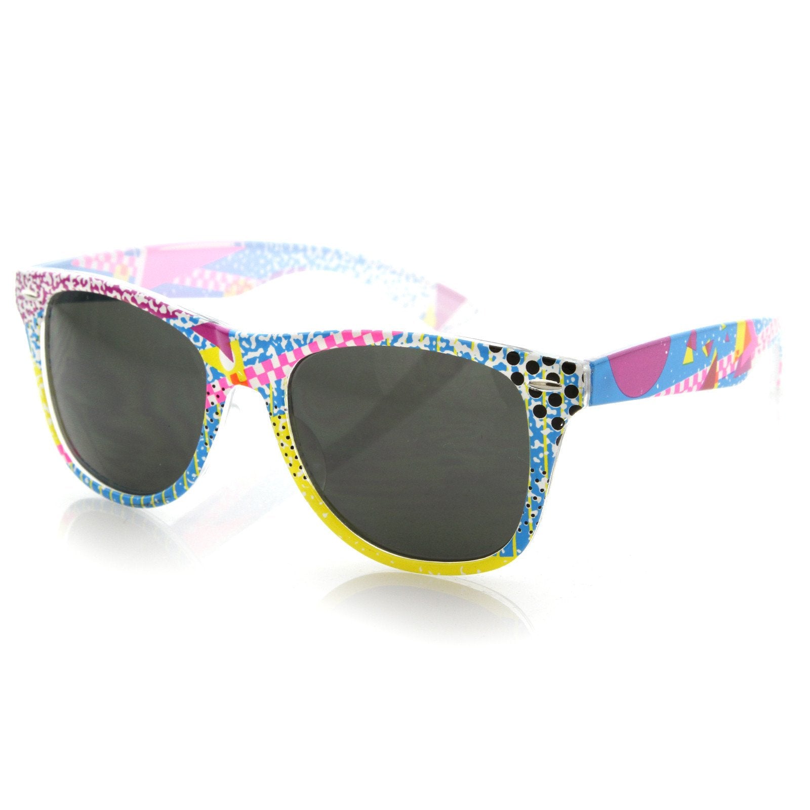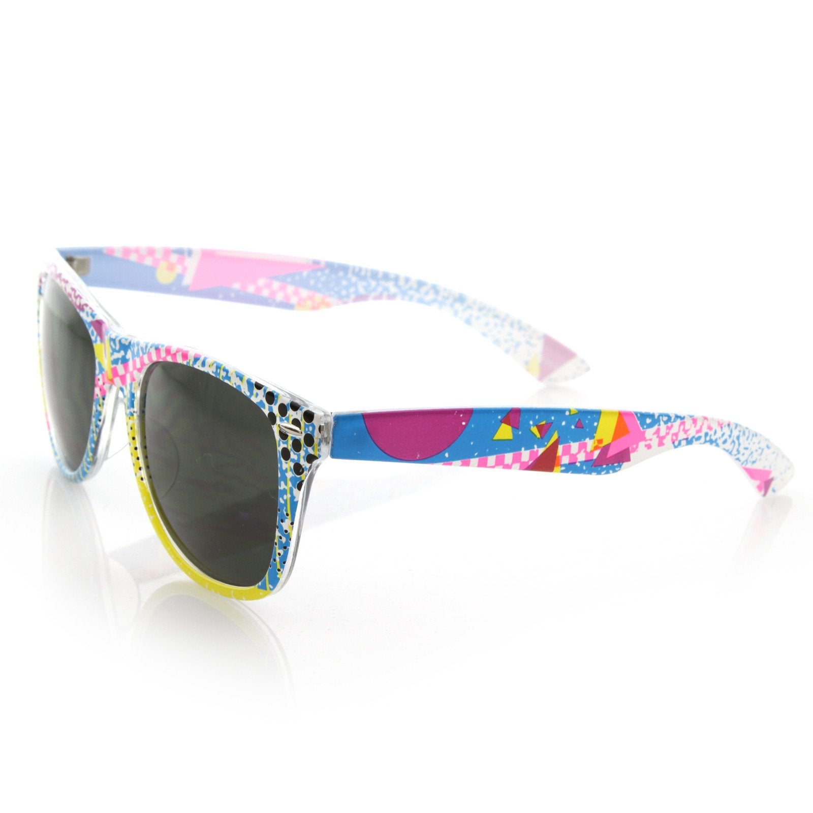 Cool retro graffiti graphics popular during the early 1990s, best exemplified by the opening sequence of TV shows such as Saved by the Bell, In Living Color and Fresh Prince. A must have for anyone reminiscent of trapper keeper binders and 90's sitcoms. Made with an acetate based frame, metal hinges and UV protected polycarbonate lenses.
