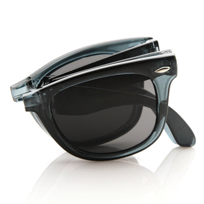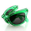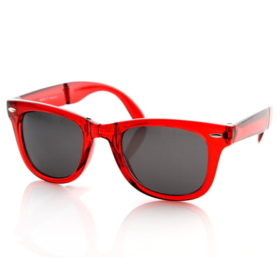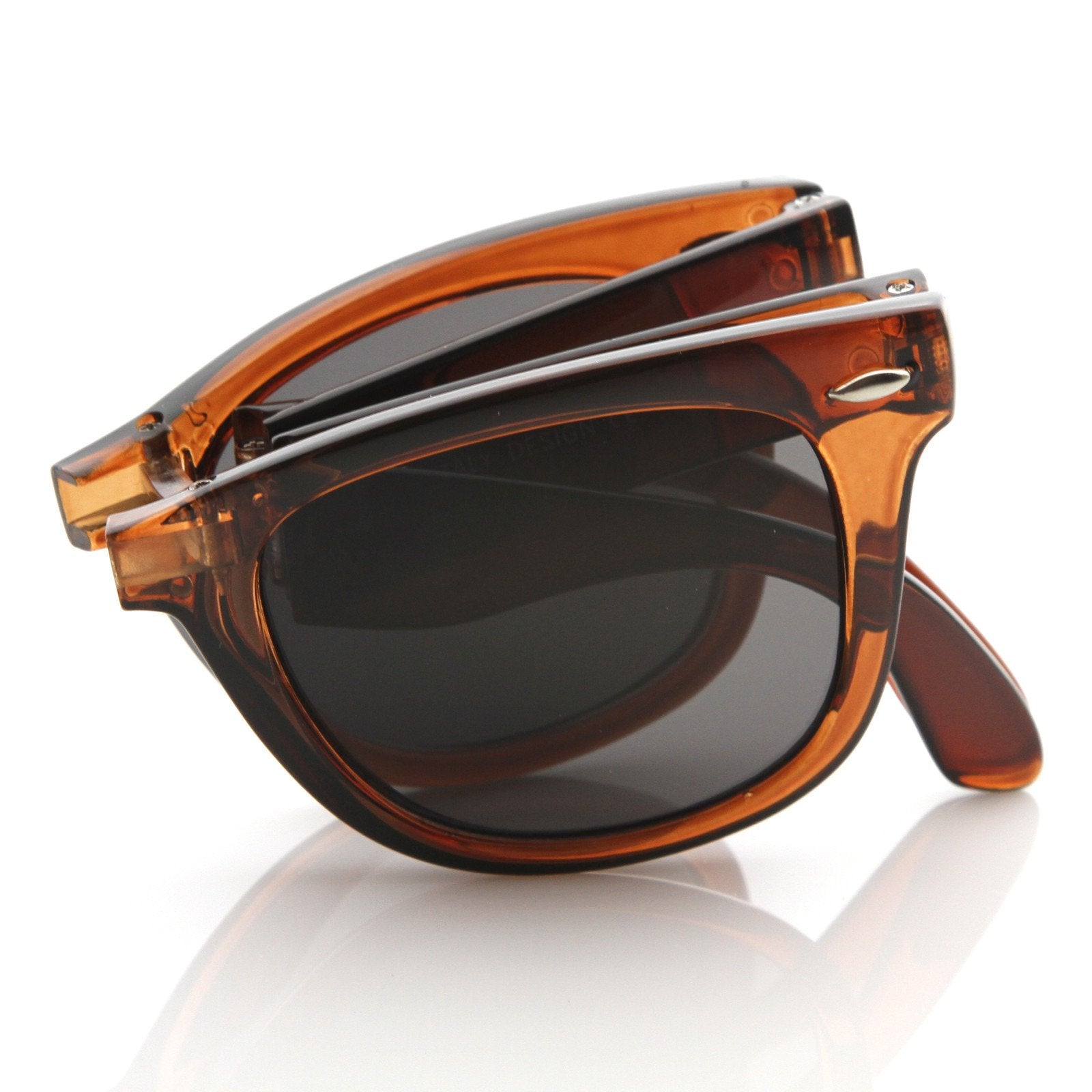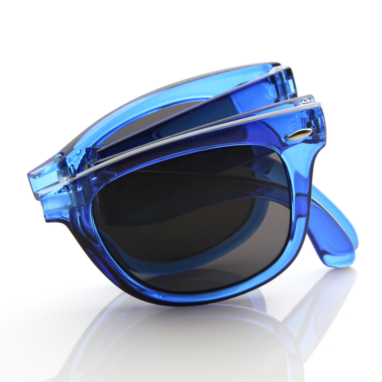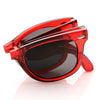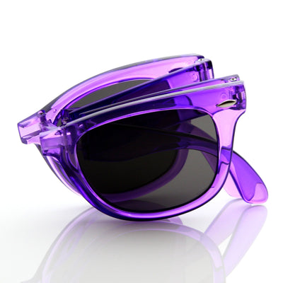 Colorful translucent horn rimmed sunglasses that are fully functional and can fold-up making them practical, portable and compact. Made with an acetate based frame, pinned hinges and polycarbonate UV protected lenses.