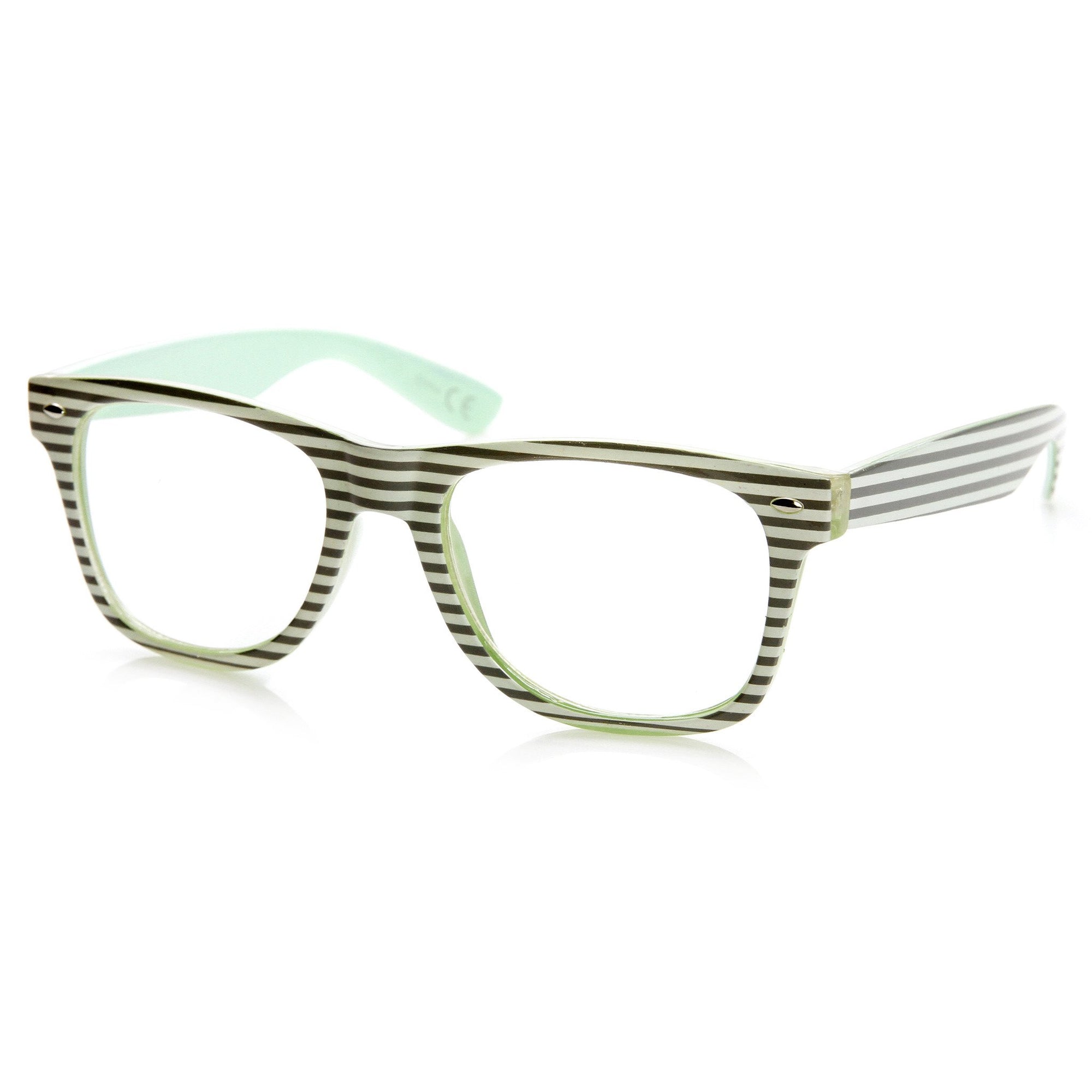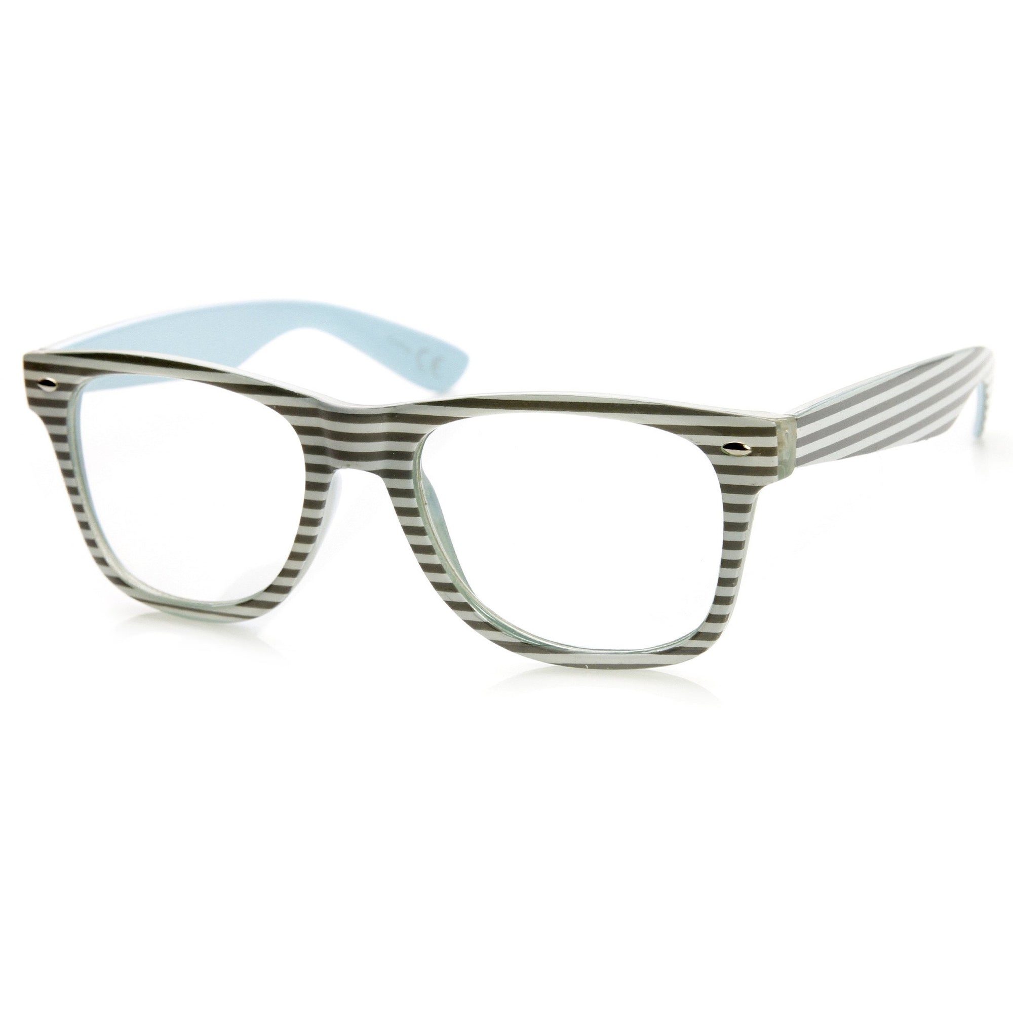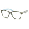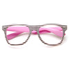 Classic clear lens horned rim glasses that features a unique striped exterior with a pastel colored interior frame. The unique stripes and pastel colors make these a fun edition to this season's collection. Made with a plastic based frame, metal hinges and UV400 protected clear polycarbonate lens.
