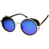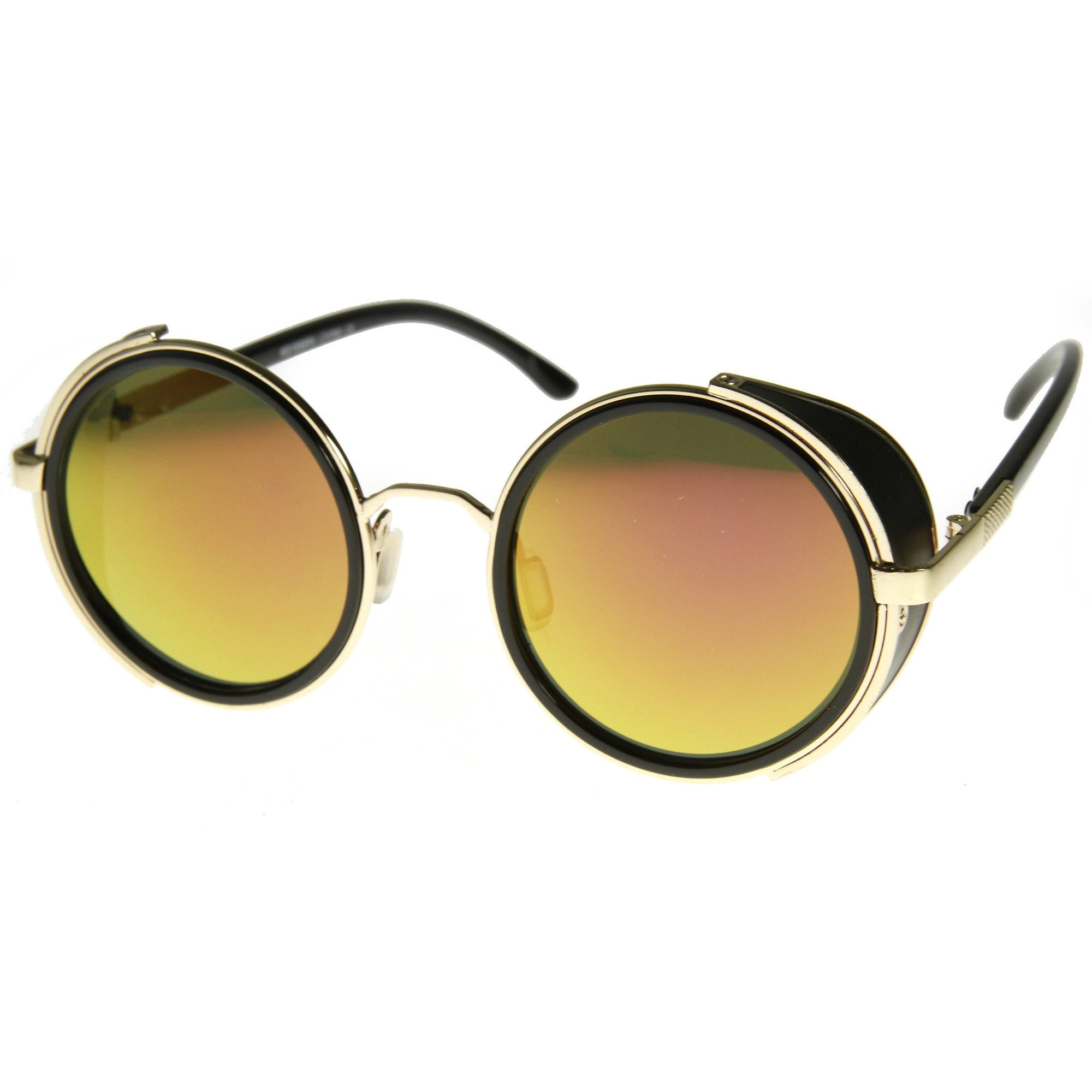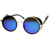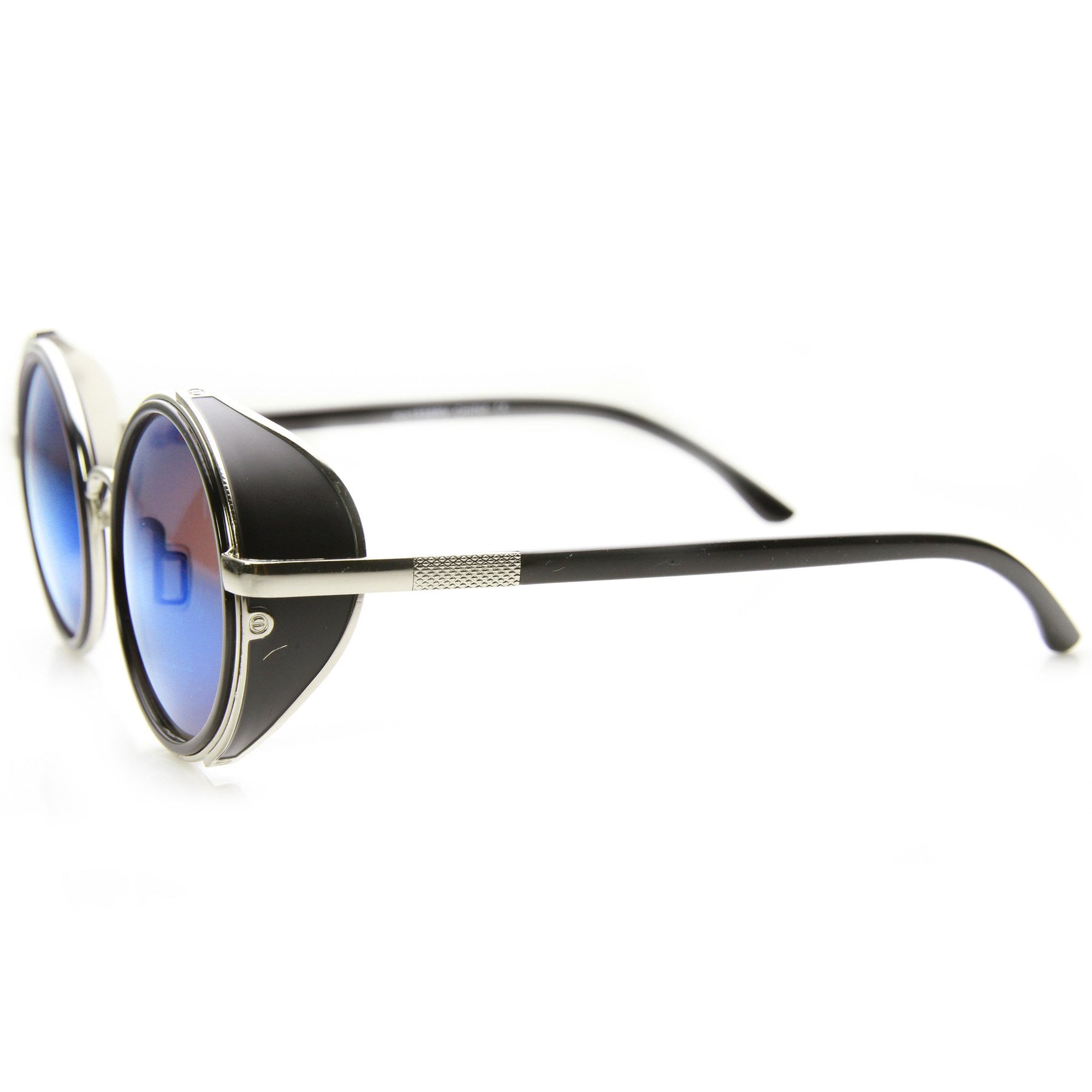 Studio covered side round silhouette sunglasses featuring a metal outer frame with eye-catching color mirrored lenses and shield covers at the sides. These sleek, studio covered round sunglasses gain a fashion forward look this season. Made a metal and plastic based frame, metal hinges and UV400 protected polycarbonate lens.