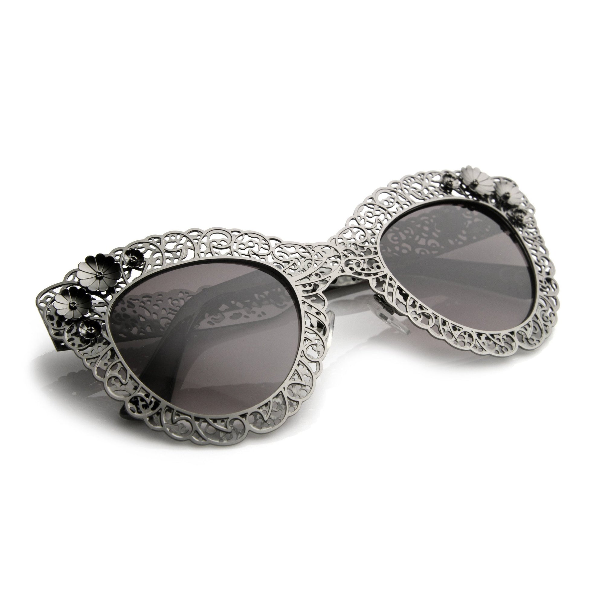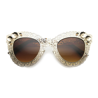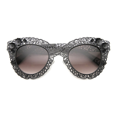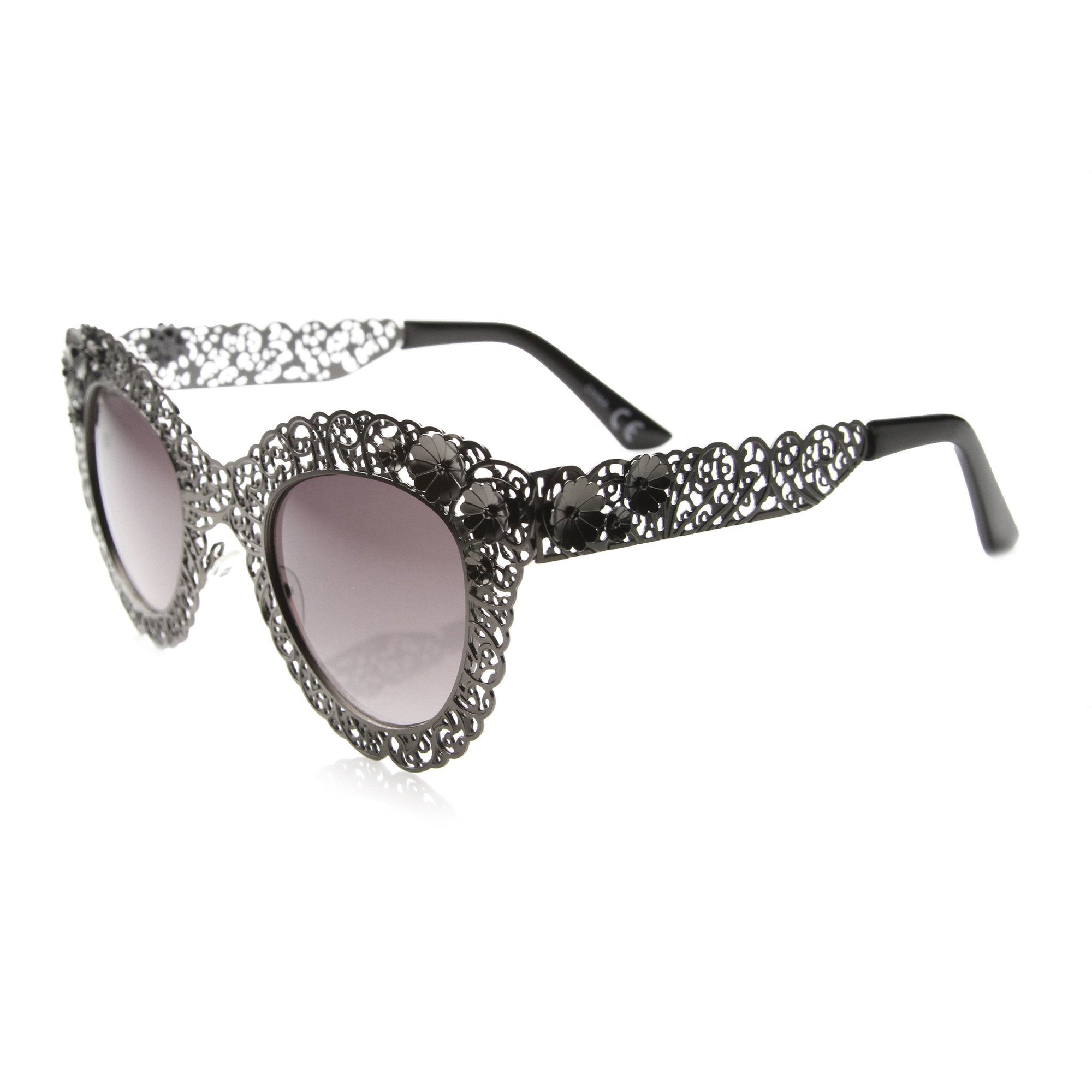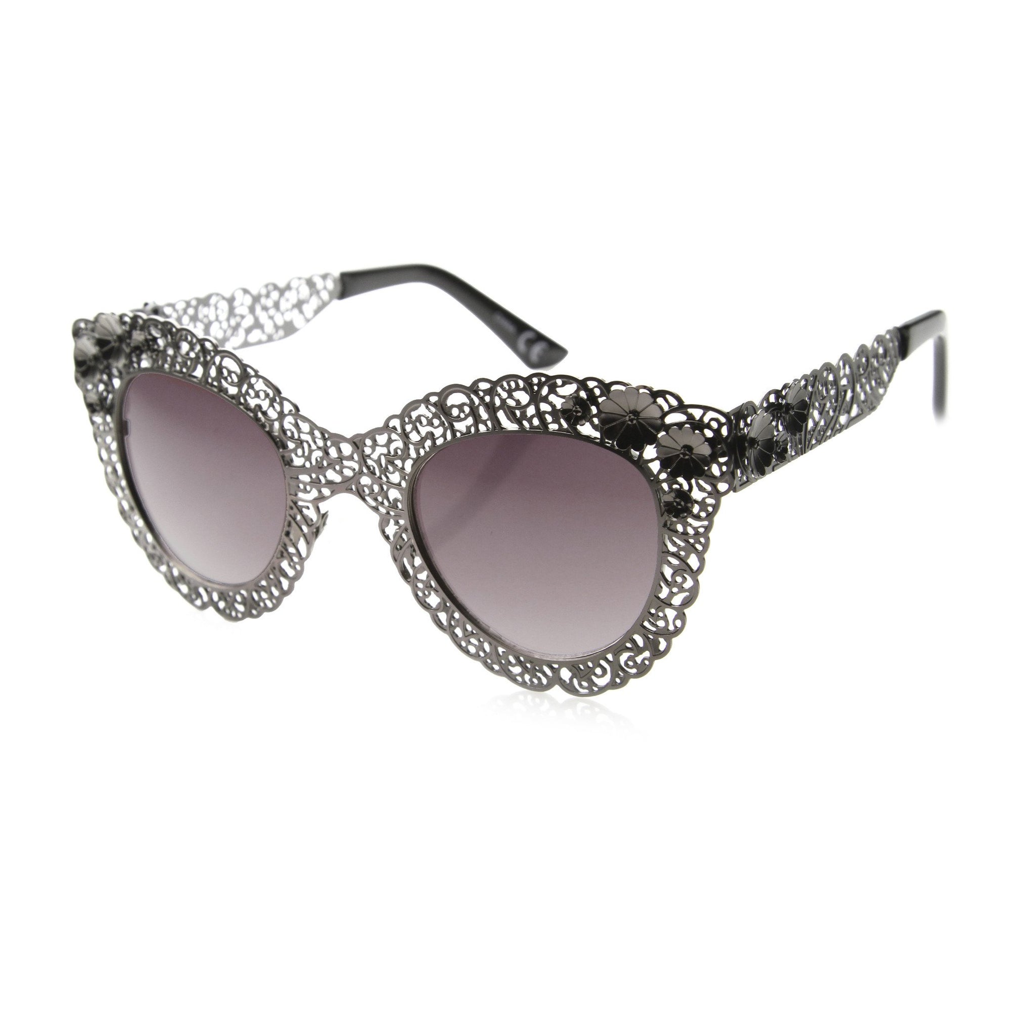 Dazzling embellishments lend a modern update to this glamorous cat eye silhouette for a high fashion look. Rendered in an ornate gold-tone metal frame that is structured like lace, these lace metal cat eye sunglasses are fit for the seaside and at any dressy occasion. Features metal hinges, English style nose pieces, and dark-tinted UV400 protected lenses.