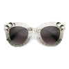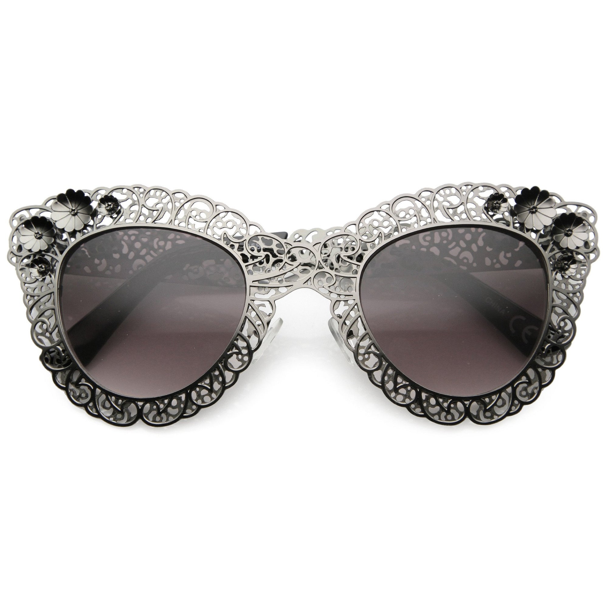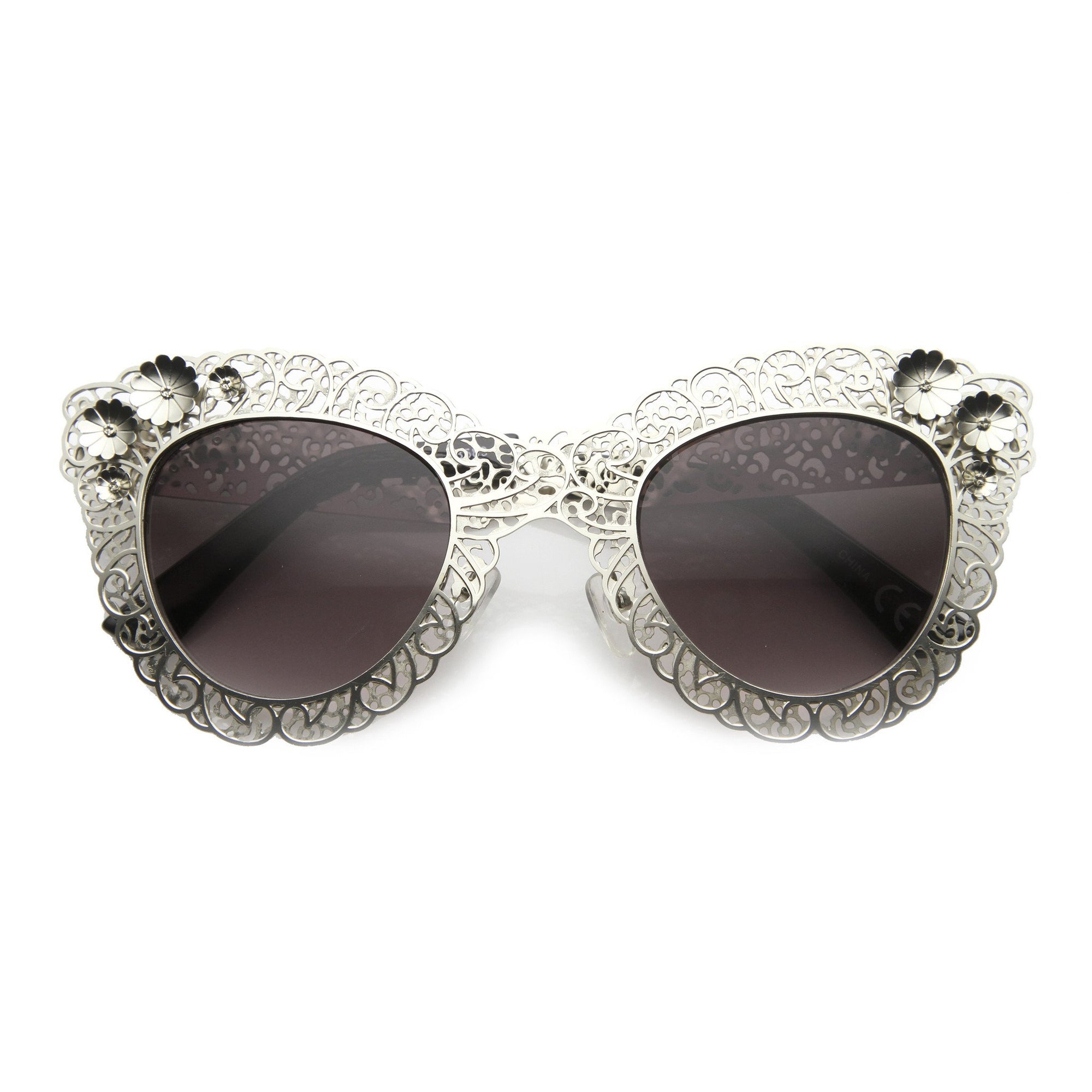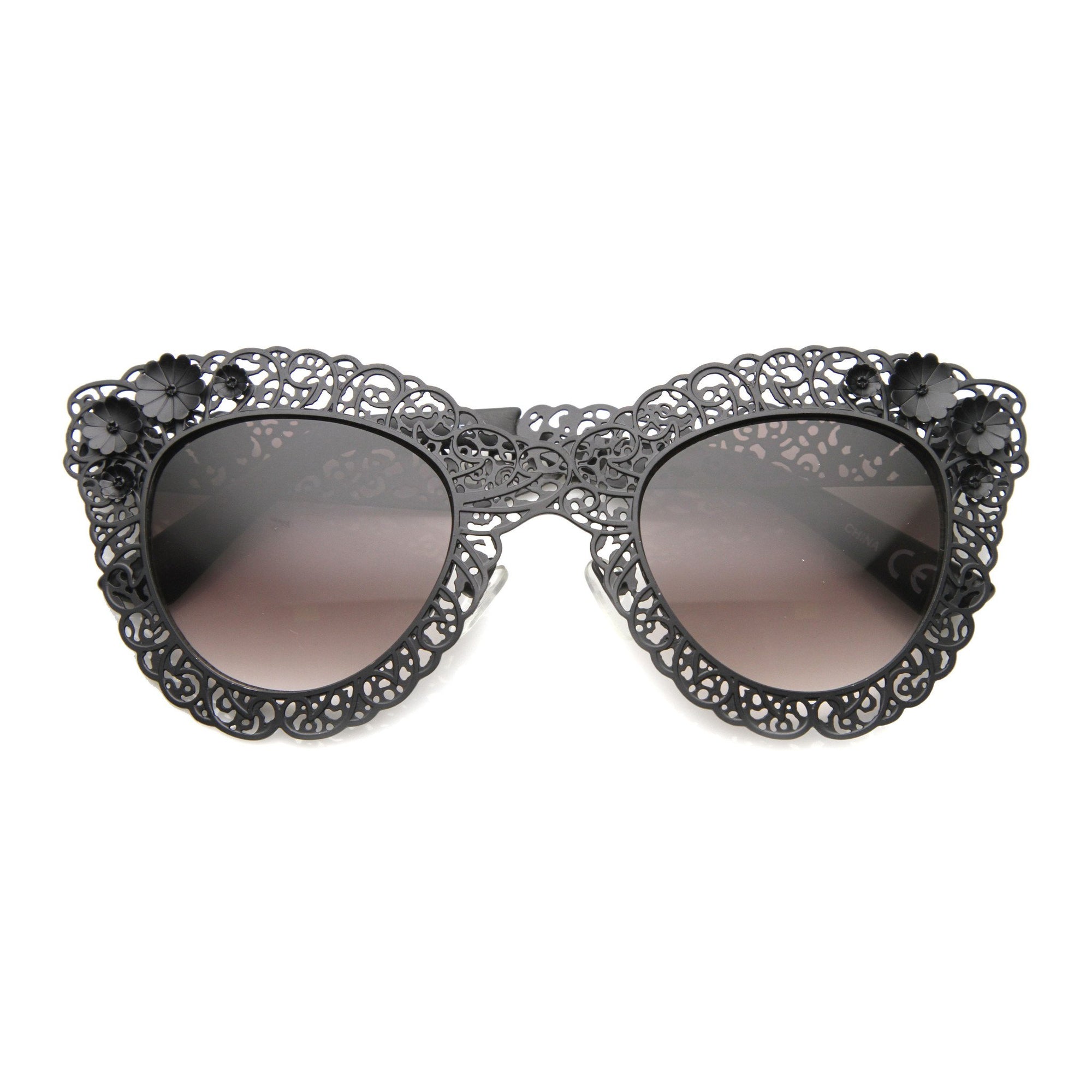 Dazzling embellishments lend a modern update to this glamorous cat eye silhouette for a high fashion look. Rendered in an ornate gold-tone metal frame that is structured like lace, these lace metal cat eye sunglasses are fit for the seaside and at any dressy occasion. Features metal hinges, English style nose pieces, and dark-tinted UV400 protected lenses.