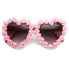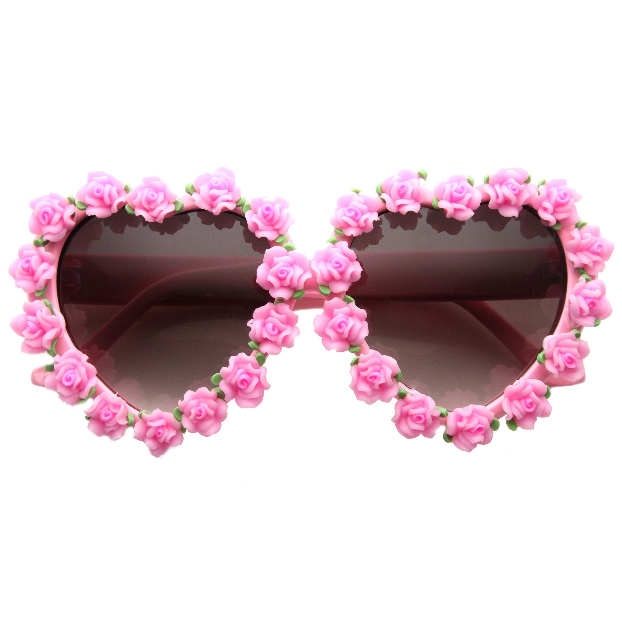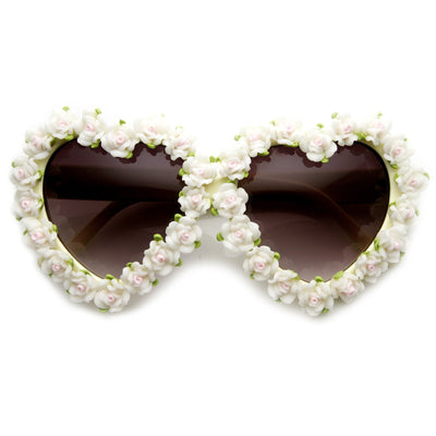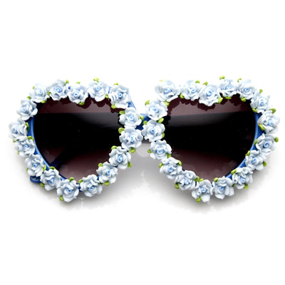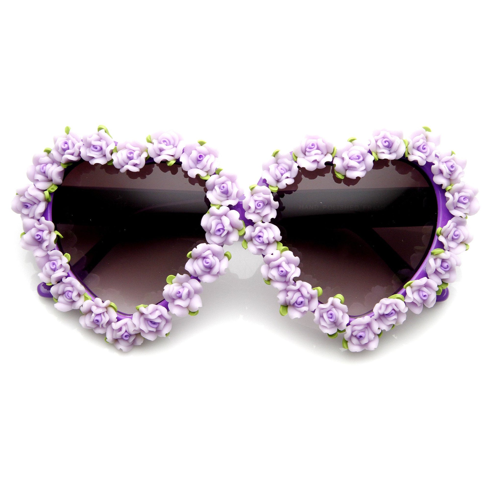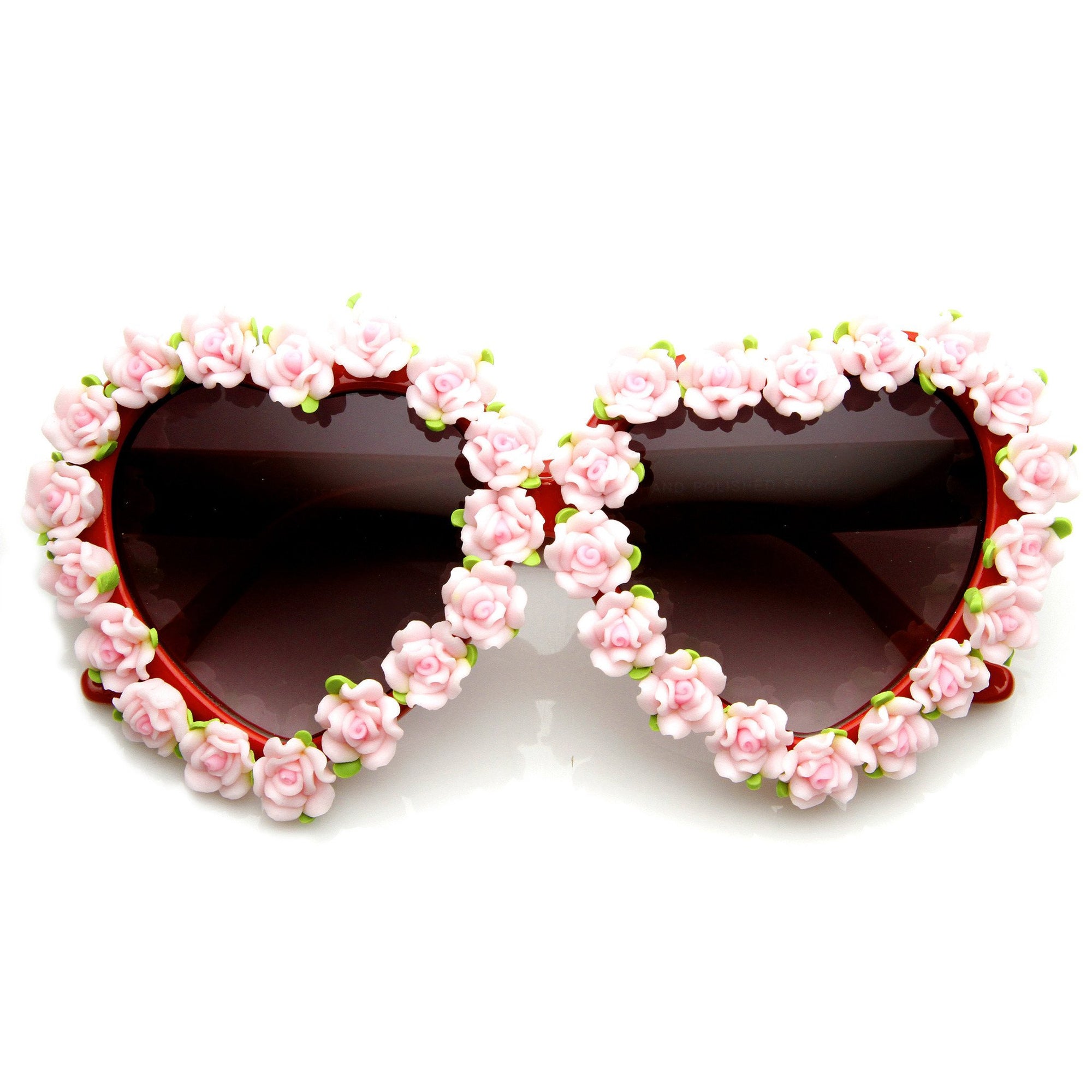 It's hard not to fall in love with these oversized heart shaped sunnies with hand-painted ceramic adorned flowers. With all the lovely flowers and distinct high fashion details, these are sure to be a huge hit this season! Made frame a plastic based frame, metal hinges and gradient polycarbonate UV protected lenses.